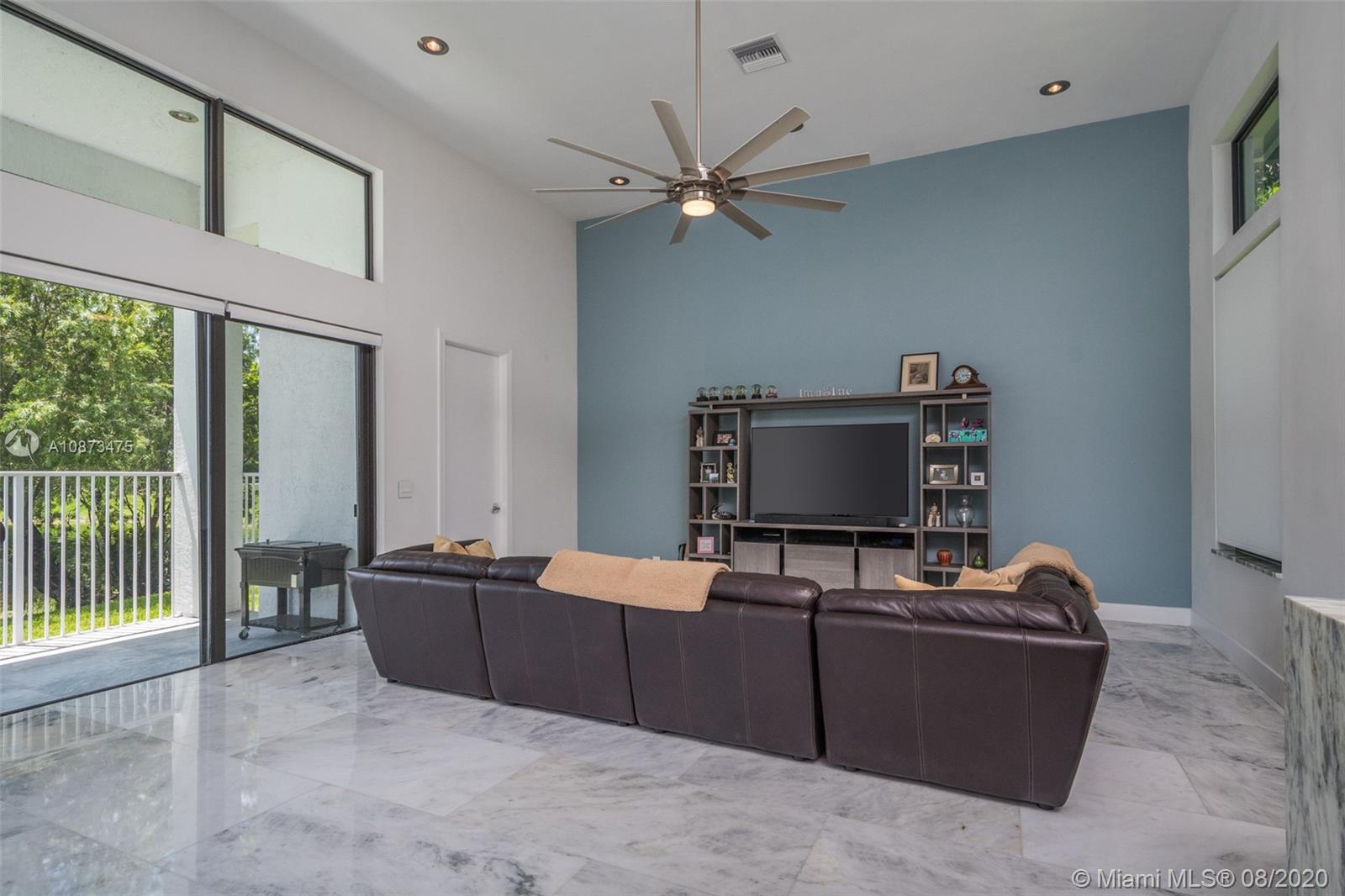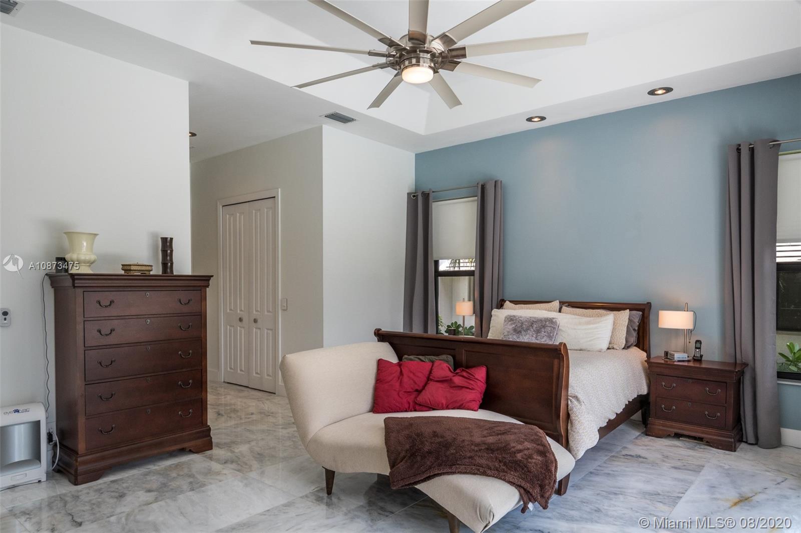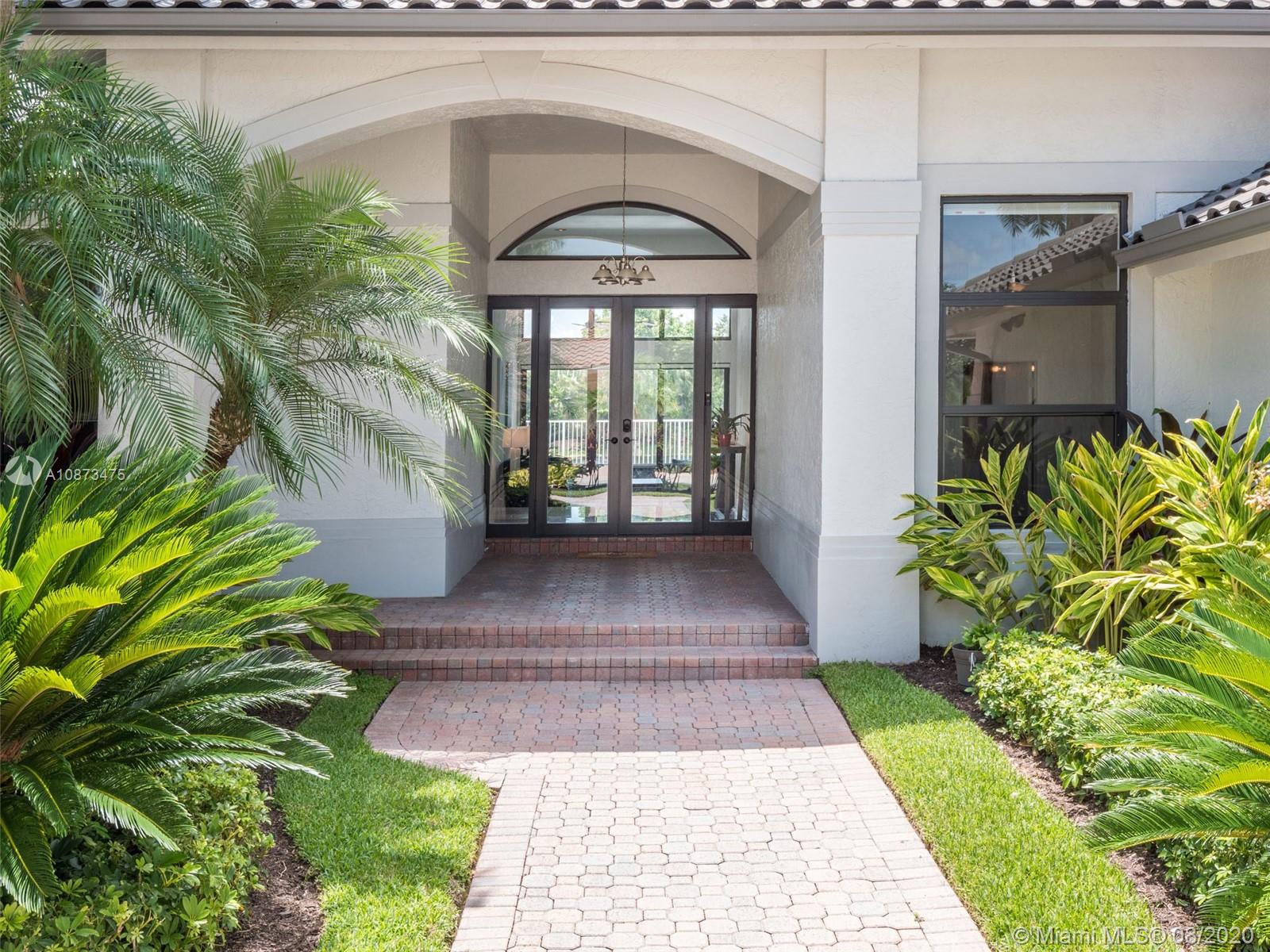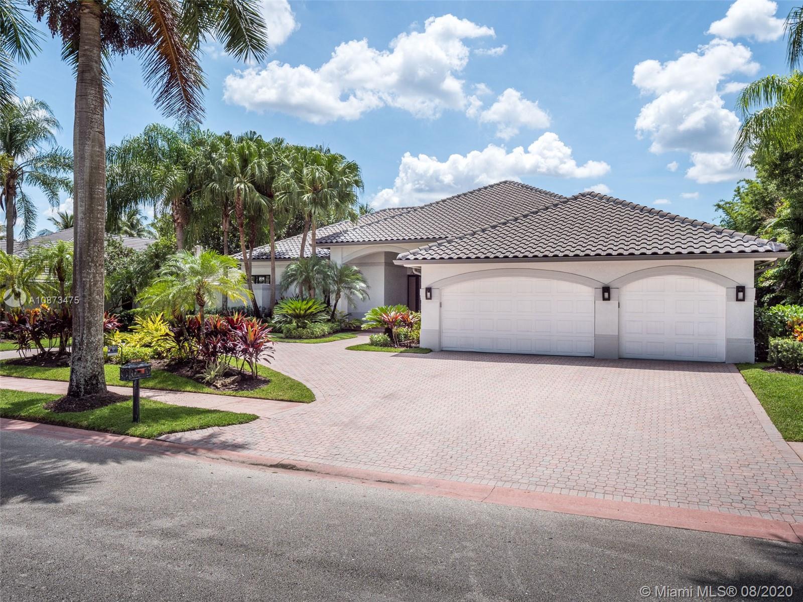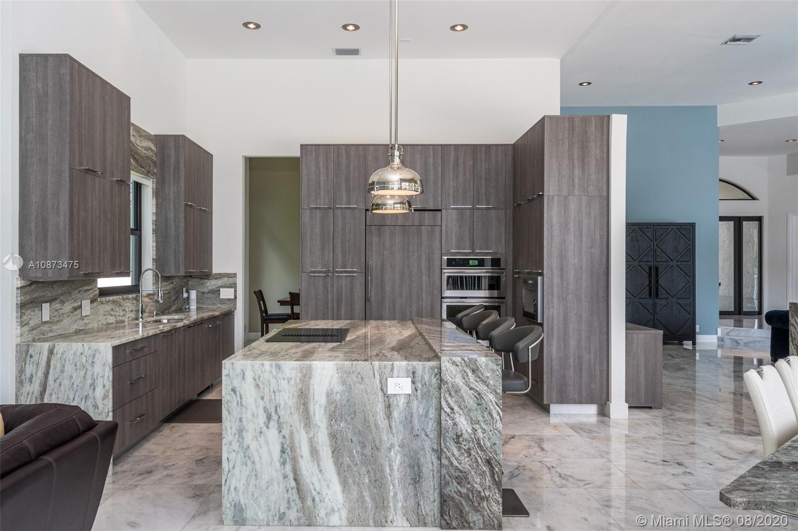 Views Views Views Backing to your own private lake with no neighbors behind with views of the fountain. This custom 4 bedroom home plus office has been transformed. Total Renovations from top to bottom. Brand new Roof and full impact windows. Top of the line Marble flooring throughout the home. Open floorplan concept with wonderful living and entertainment space. European kitchen featuring Stainless steel appliances, Jenn Air -5 burners, grand waterfall center island, convection oven, wall oven, warming drawer. Custom bar in the living room. All baths renovated in marble. Enjoy 3 bedroom ensuites plus office. Freeform heated pool renovated with marble patio, fully fenced private yard with lush landscaping. Marble master bath with his/her toilets, free-standing vessel tub.