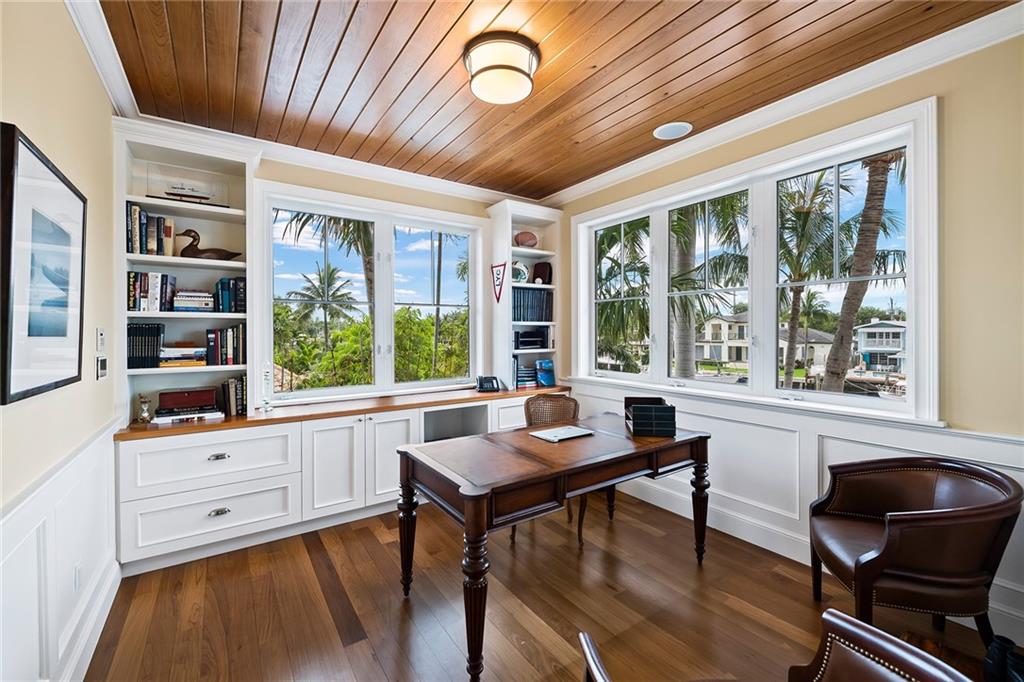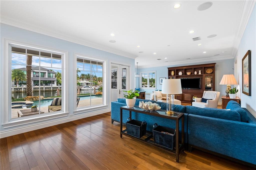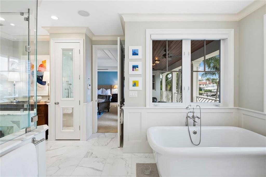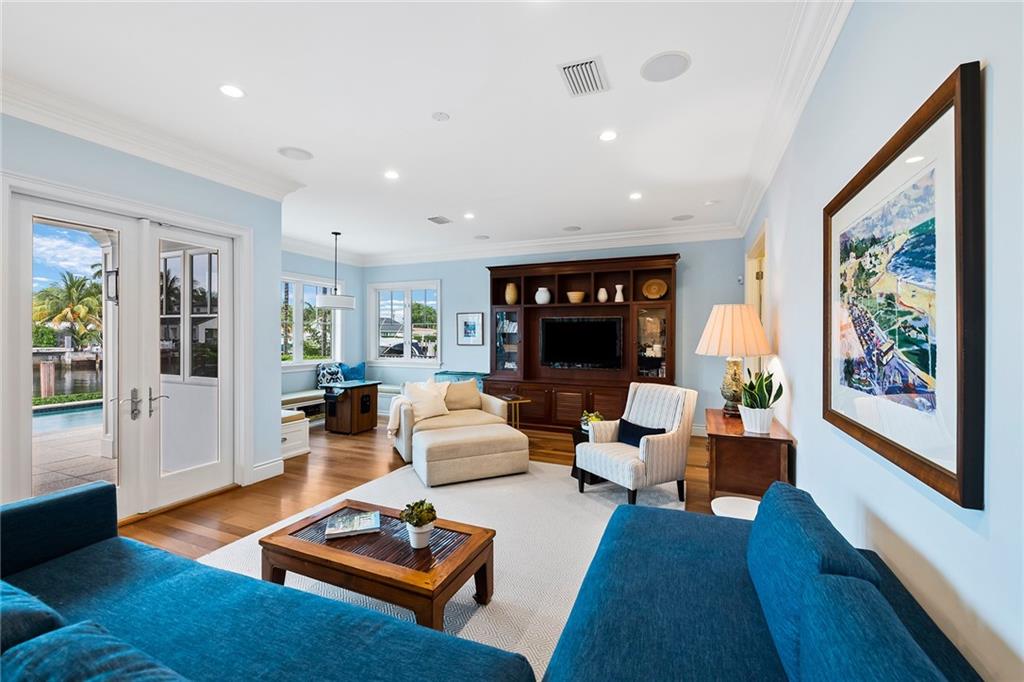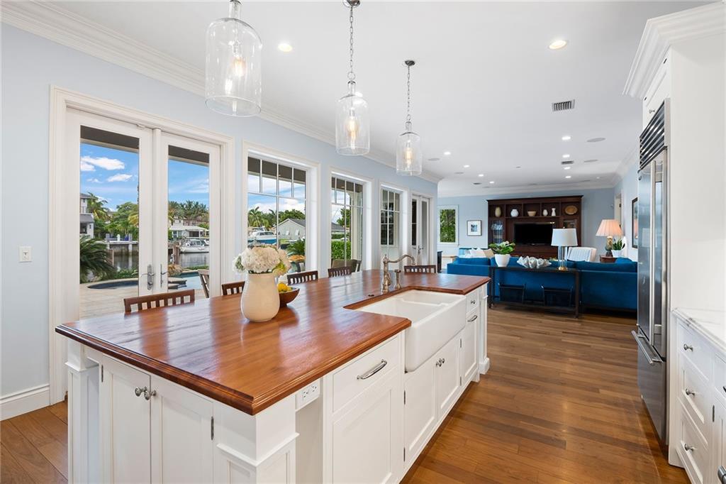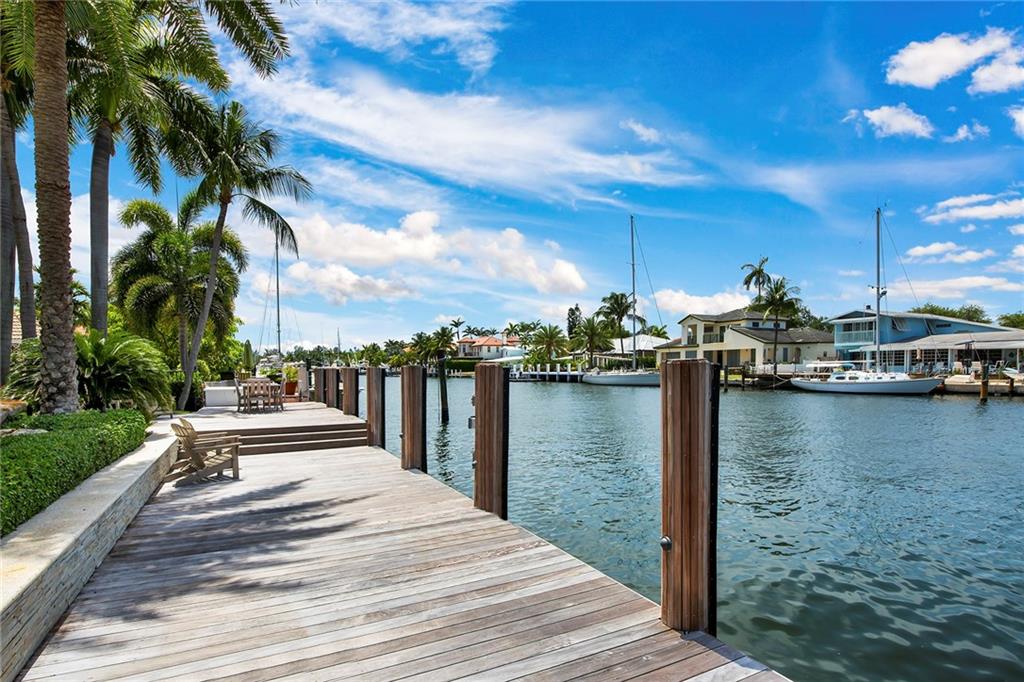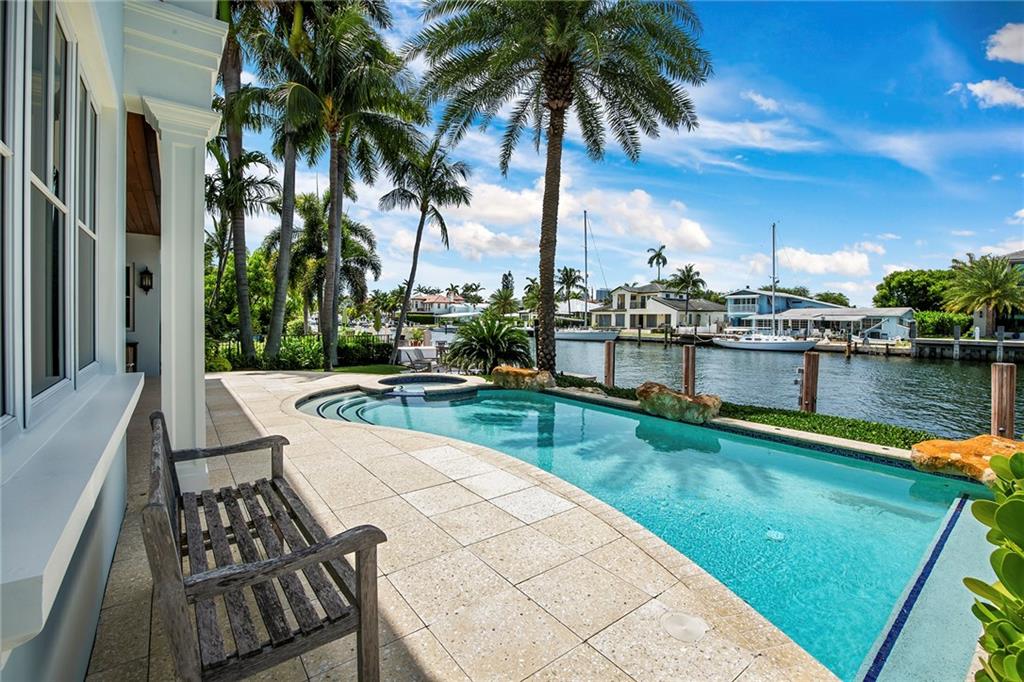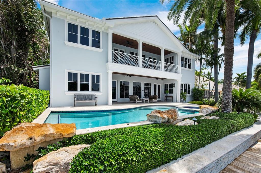 Sophisticated Coastal Colonial classic waterfront home with modern floor plan and timeless finishes. Custom built home in 2008 designed by Robert Tuthill. Offers 5 bedrooms, 4.5 baths, office off of master and upstairs loft/study area with pool. 70' WF with dock that will accommodate a 60' yacht. Dock extends 12' from seawall. Upstairs Master suite overlooks pool & waterfront with covered balcony. Elevator, upstairs laundry room. Fabulous Kitchenworks designed kitchen with DutchMade cabinetry, Calcutta Gold counters & backsplash, teak island countertop, gas cooktop, all high-end appliances plus butlers pantry. Solid plank Brazilian hardwood floors/ Marble floors in baths. Impact windows and doors. Gorgeous curved wooden staircase to second floor. Newly painted exterior. Pleasure to show.