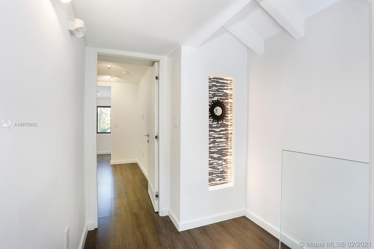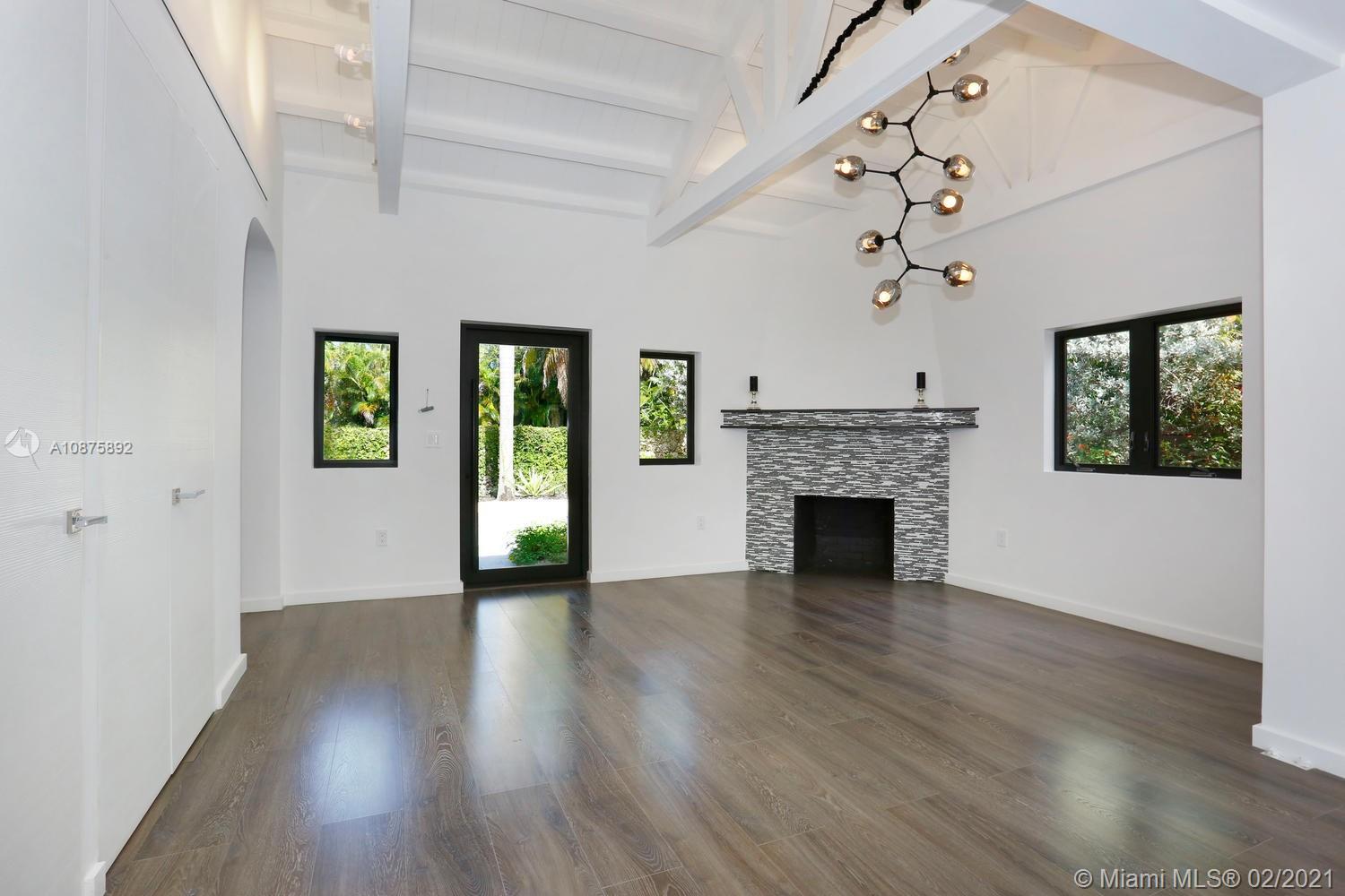 Ultra-private & architecturally unique home set behind a tall coral rock wall. Total renovation by interior architect Piret Johanson - creates a seamless blending of the home’s original character with a minimalist vibe. Light-filled living spaces feature beamed ceilings, fireplace & laminate wood flooring. Ideal open layout offers living/dining + media/family room. Main level master with en-suite bath + second level –2BR/1BA. (Pre-approved plans to add 4th BR). European-style kitchen features stone countertops, high-end appliances & cooking island. Large laundry room w/storage. Enjoy outdoor living & entertaining around the tranquil pool and lounging deck w/ built-in grill + cabana bath. Not in a flood zone. Walk to the Grove village.
