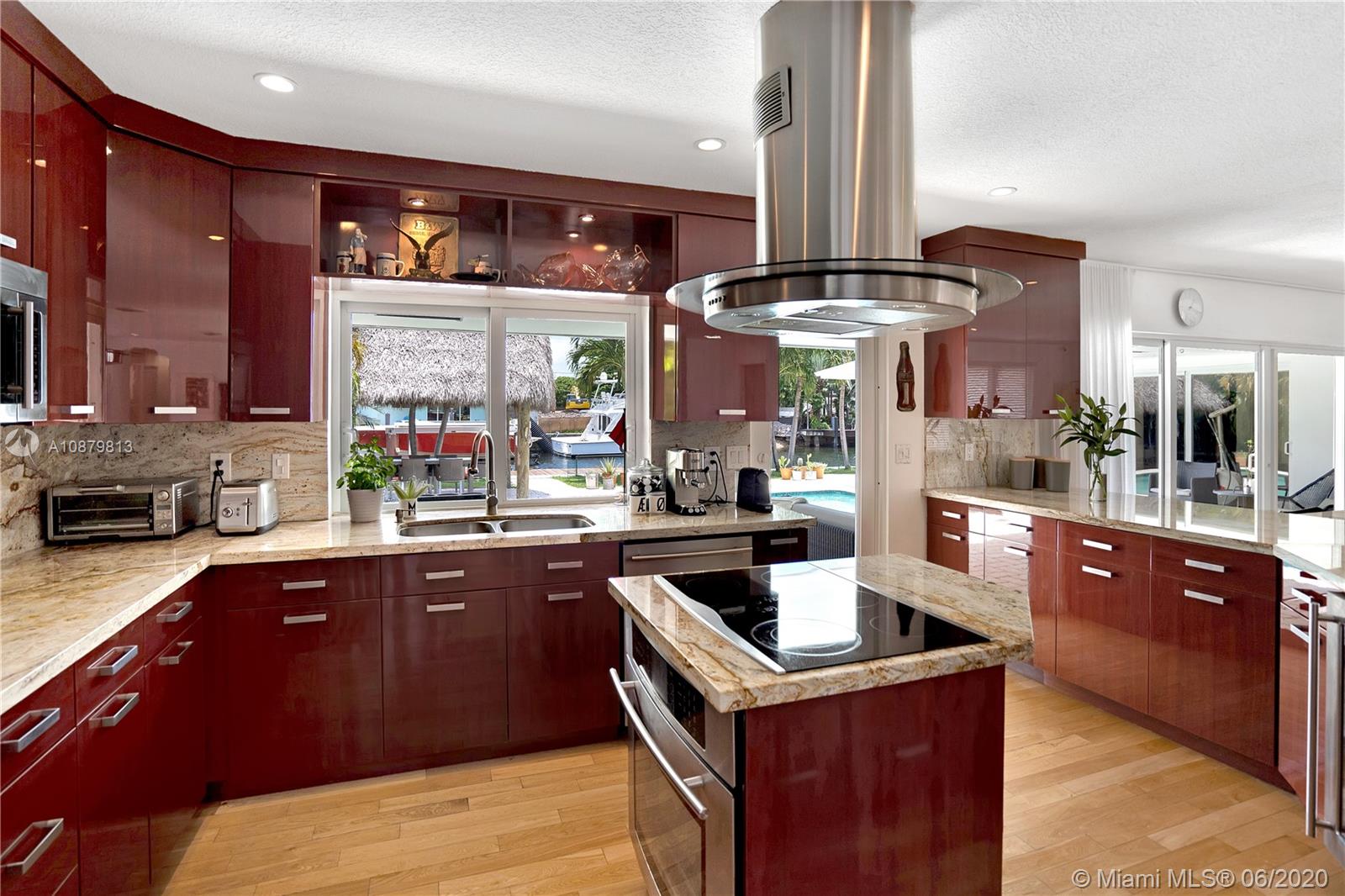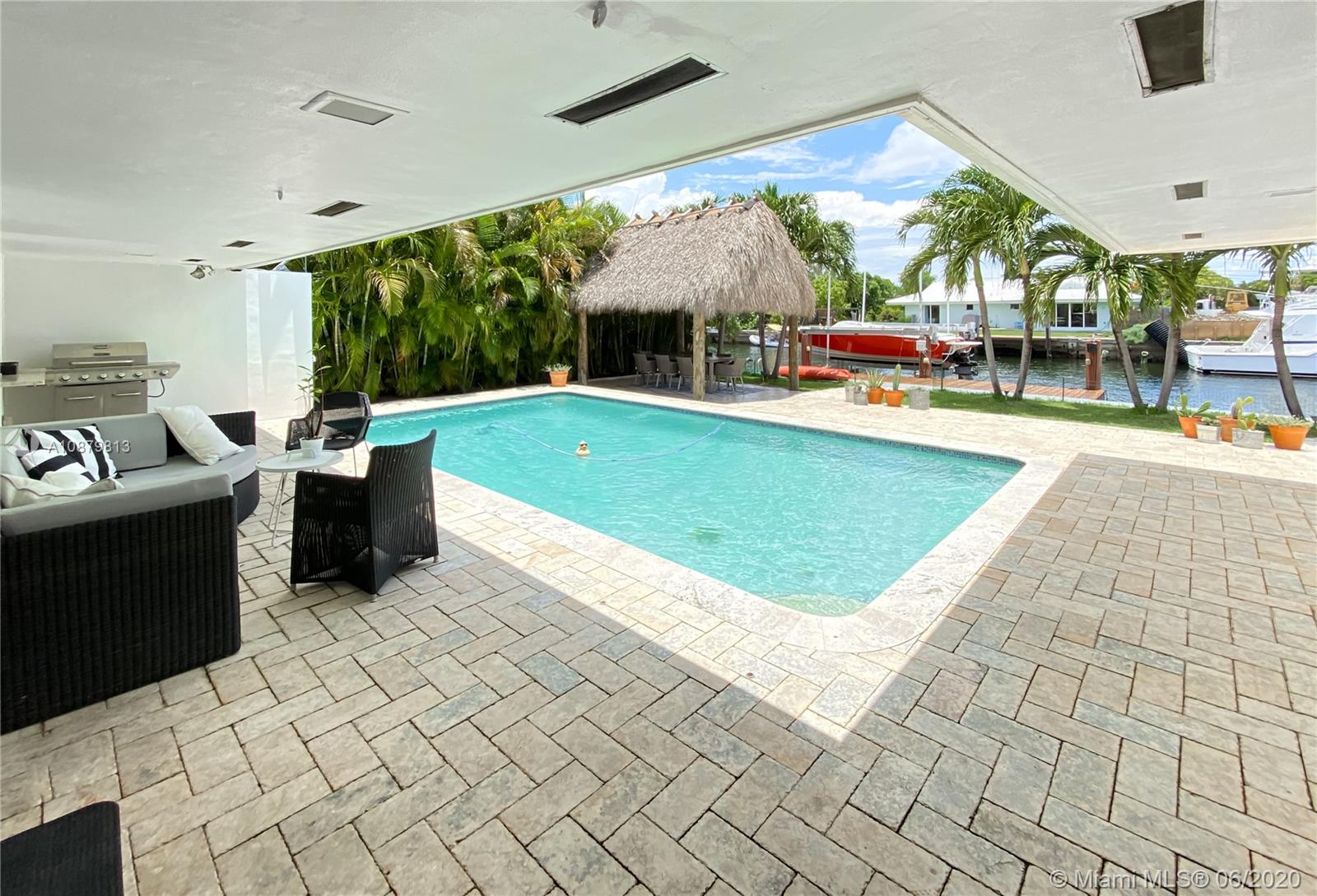 Sans Souci Estates, Waterfront just 6 houses from direct bay. Deep canal, no bridges. Bring up to a 75ft boat, or smaller boat and use the 16,000 lb elevator boat lift ready to go. All hurricane impact windows and doors. Open Kitchen concept is done right with lots of space to entertain. 3 bathrooms and 3 large bedrooms. Nice primary bedroom measures 18’x14’, plus huge walk-in closet & 11’x11’ bath features dual sinks and massive shower. 2 car garage. 2015 New Metal Roof. Relax and enjoy Miami Florida living under the tiki hut by the sparkling pool and ocean access water. 24hr Police Gated Community located walking distance to area restaurants, LA Fitness & Whole Foods Market. Minutes to Bal Harbor & Beaches. "A" Rated Schools.