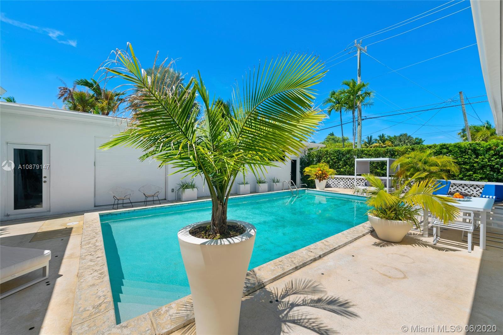 Restored & updated for modern living, this spacious mid-century gem was built to commercial standards in 1959 by a prominent developer as his personal home w/ an excellent 4bd/4ba split floorplan all on one story. Family room opens up to one of the largest courtyard pools in all of Surfside through ingenious sliding glass pocket doors that completely disappear seamlessly merging indoor & outdoor spaces. High end features include Nolte kitchen, Duravit bathrooms, custom terrazzo floors & new enormous detached converted activity center w/ guest quarters, laundry & can be used as a garage/gym/cabana. Situated on a corner lot, this already fantastic home has tremendous potential for future expansion. Partial impact windows & doors. 3D INTERACTIVE TOUR @ my.matterport.com/show/?m=1Hv84z5jVVd