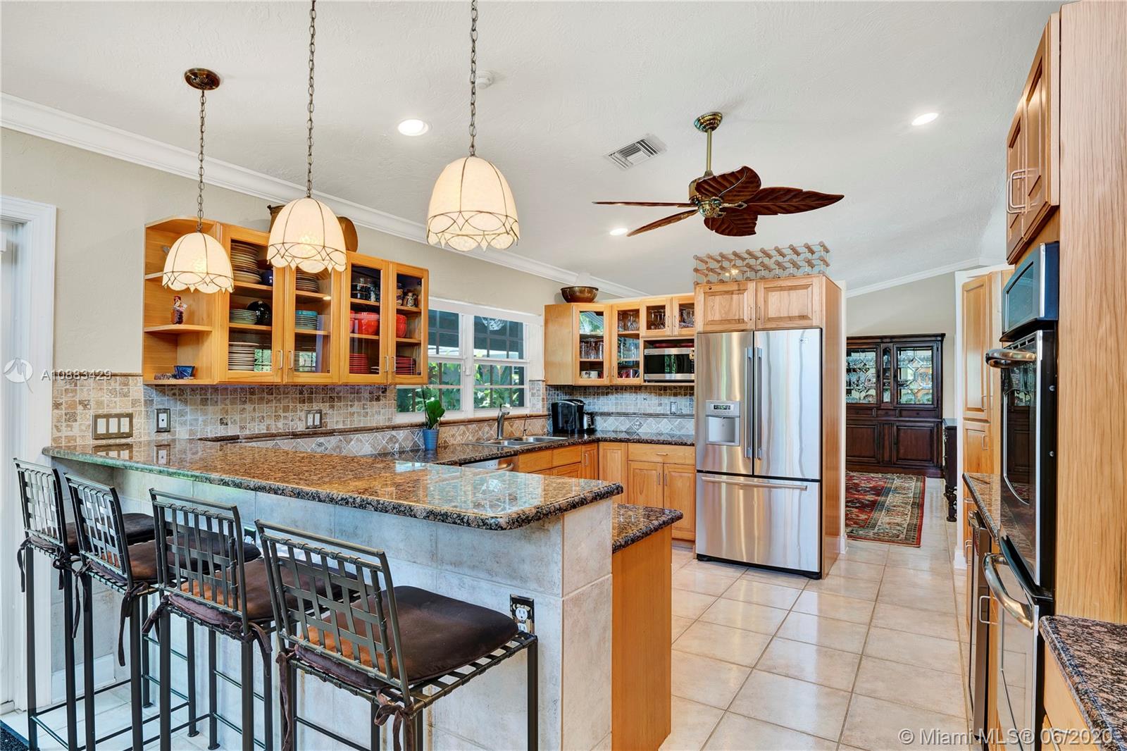 Totally rebuilt in 1995 this North Pinecrest home sits on a tranquil no through street with gorgeous tropical landscaping. Spacious open concept floor plan, high vaulted ceilings, large kitchen with counter seating great for entertaining. Beautiful views of the outdoors through impact windows and french doors, whole house generator, procelain tile and wood floors. Pinecrest elementary and close to Starbucks.