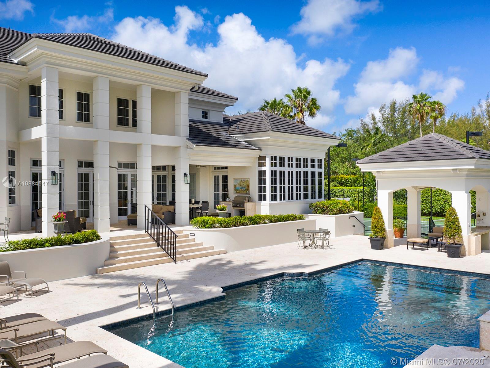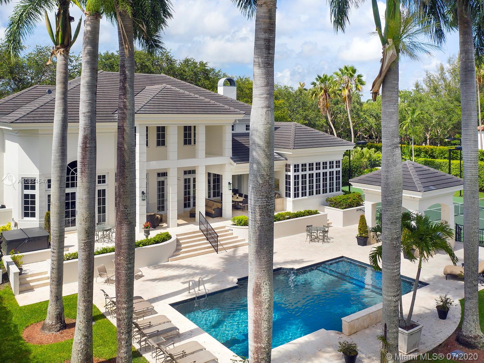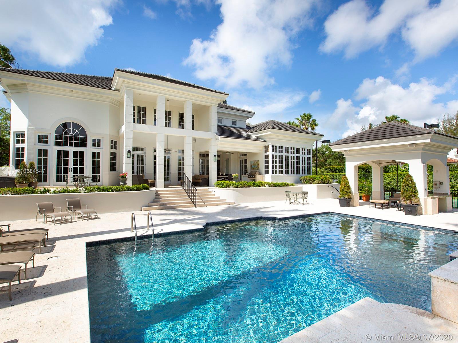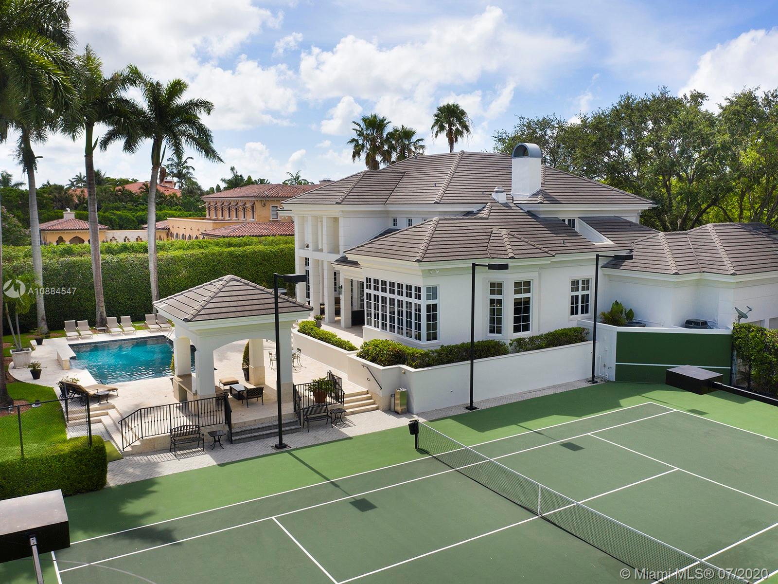 Within the secure confines of renowned Gables Estates sits this Architectural Masterpiece. The finest of contemporary finishes and a flowing floor plan featuring three staircases sets this home apart. Recently updated with new roof, heated pool and spa bathrooms. Gleaming marble floors a polished mahogany bar and built-ins combine to make this a perfect home for family and entertaining. The downstairs master retreat features 20’ ceilings, separate his and her closets and bathrooms with a steam shower. Towering French doors lead to the estates grounds. Elevated terraces guide you to a stunning heated pool, spa and a lit tennis court. Executive office, gym and media room in addition to 6 spacious on suite bedrooms. Featured in Florida Architecture. A generational Opportunity for your family.