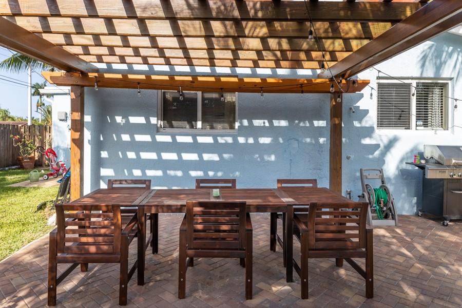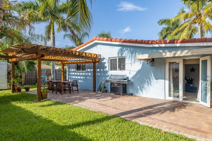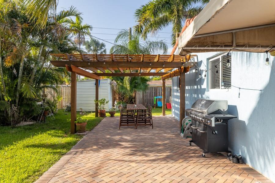 Perched on a corner lot on a quiet tree lined street we welcome you to Home Terrace. Here you will find an open concept living space with beautiful marble flooring. The kitchen has been remodeled and features ss appliances, granite countertops and opens to the comfortable living area. An additional family room accommodates easy living and from there doors lead you to a fenced in backyard with a lovely patio. The outdoor space is inviting and perfect for entertaining, relaxing or just fun and features a new pergola. The indoor is bright and light. Split bedrooms and remodeled bathrooms. Turn key with Impact windows and doors make it all hurricane prepared. Situated minutes to the beach, downtown, golf and everything else South Florida has to offer. We welcome you to Home Terrace!