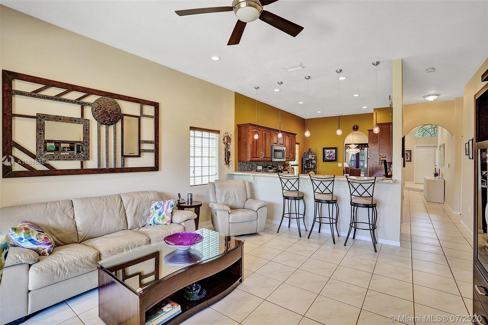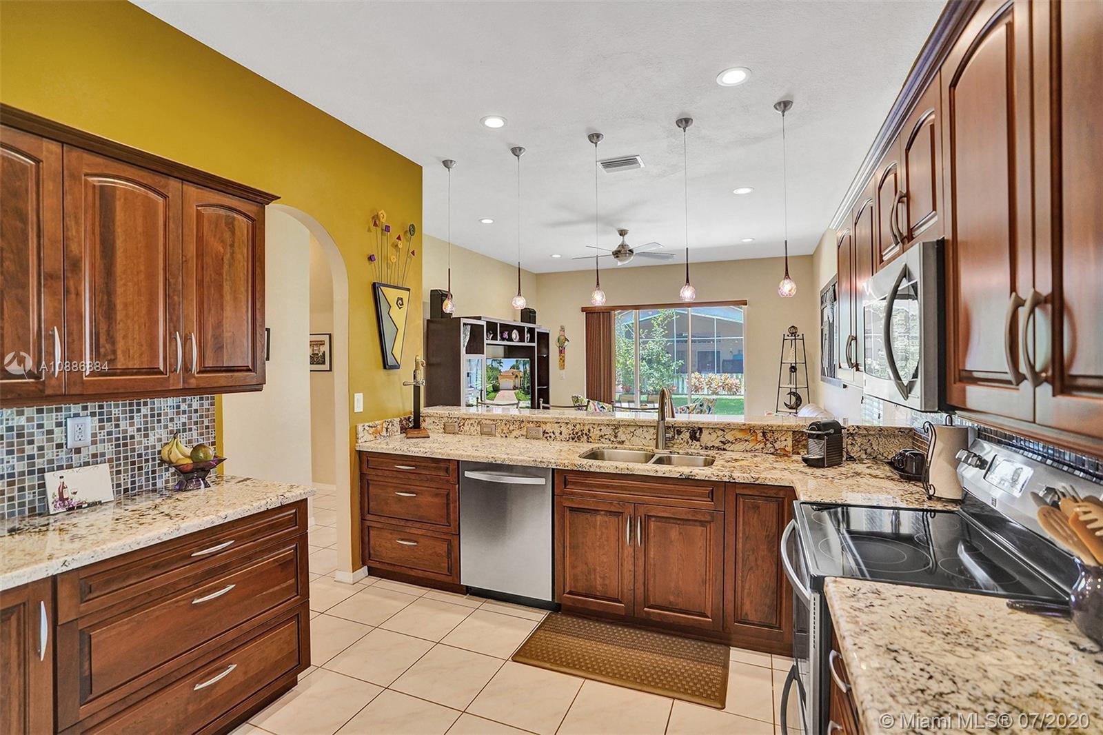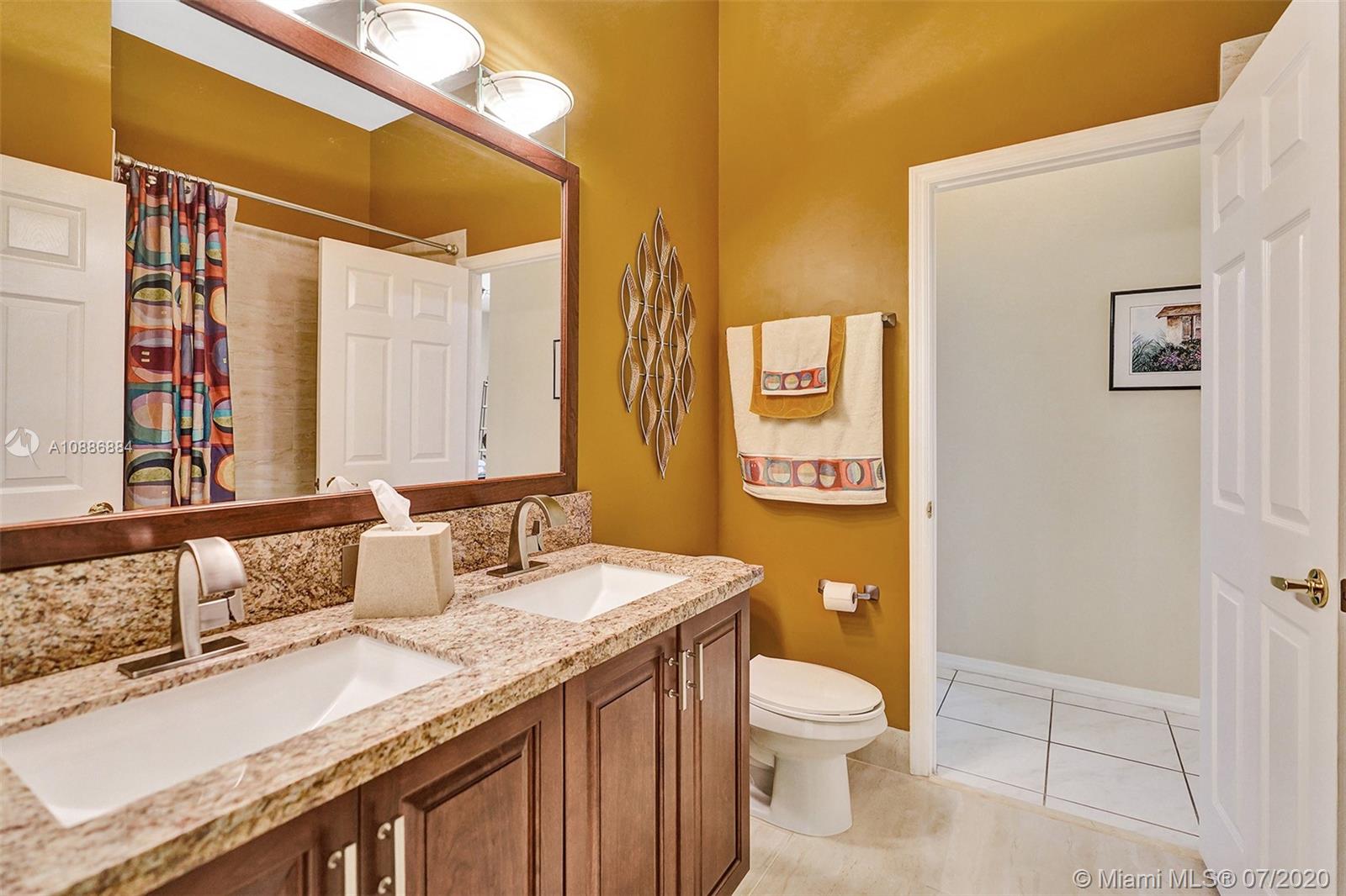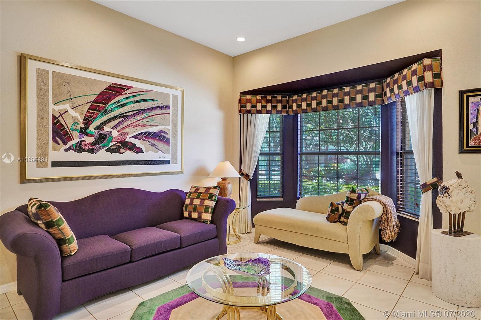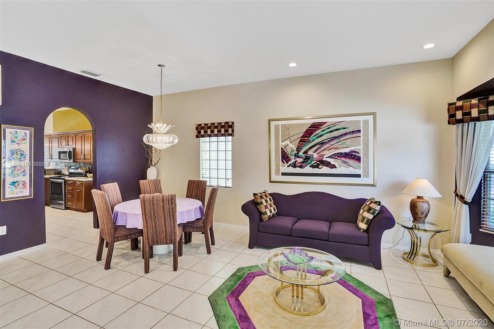 Builder modified 3 Br + Den; ideal for nursery, office or exercise. Meticulously kept home on fantastic corner lot with option to fence. Unique & spacious floor plan boasting 10 ft ceilings, updated interior shows pride of ownership featuring a recent custom-built, maple wood & cherry finish kitchen cabinetry with deep storage, soft close & pull-out drawers, beautiful stone counters & stainless appliances. New bathrooms, quality wood cabinetry, stone counters, hardware & tile work. Additional features include; Led lights in the living area, blown glass light pendants, blinds, storm panels, impact garage & front door, 1 year old exterior paint. Best amenities; pool, gym, 24/7 gated access & security. Maintenance includes lawn irrigation & cutting, cable TV+ Internet @ 1 GB speed