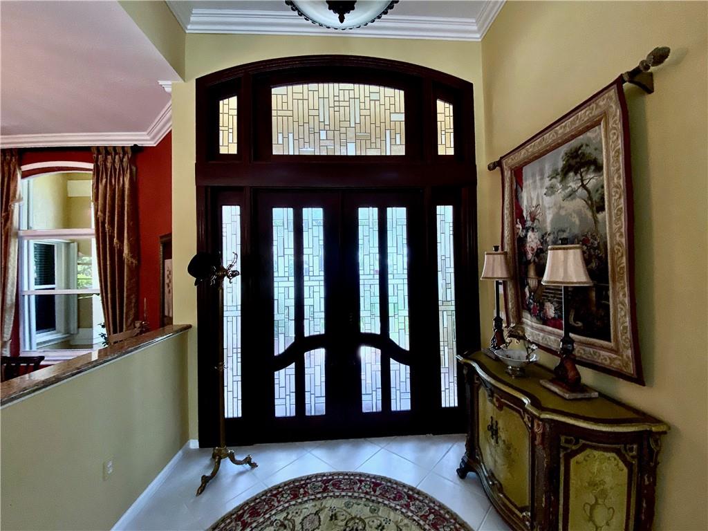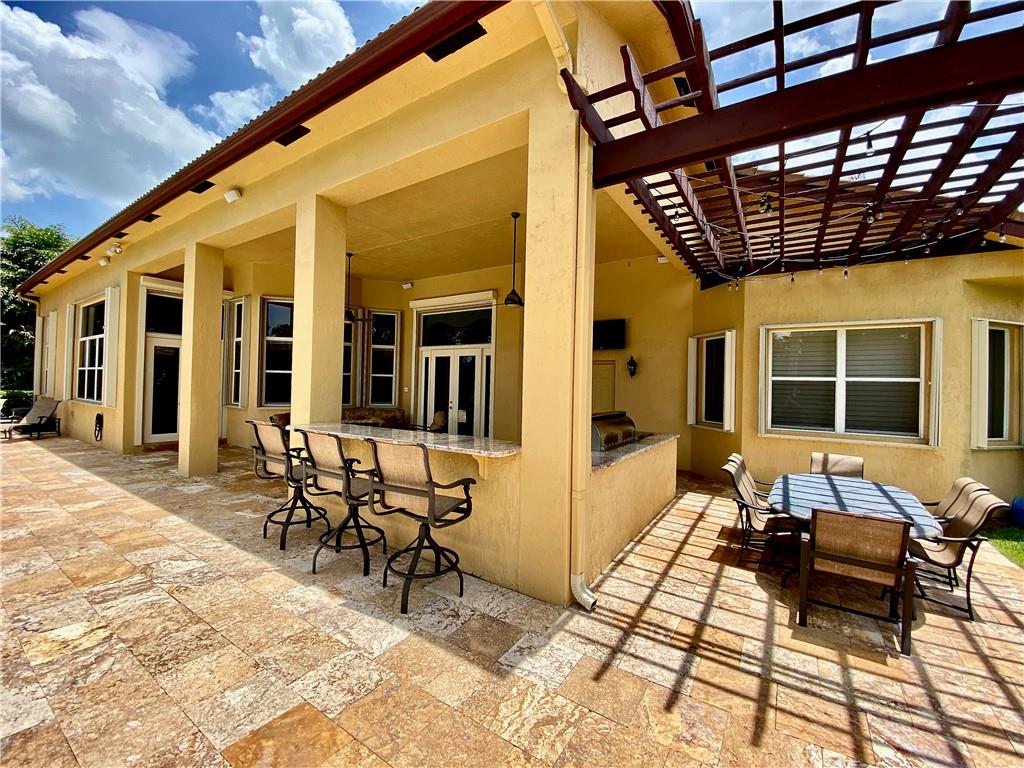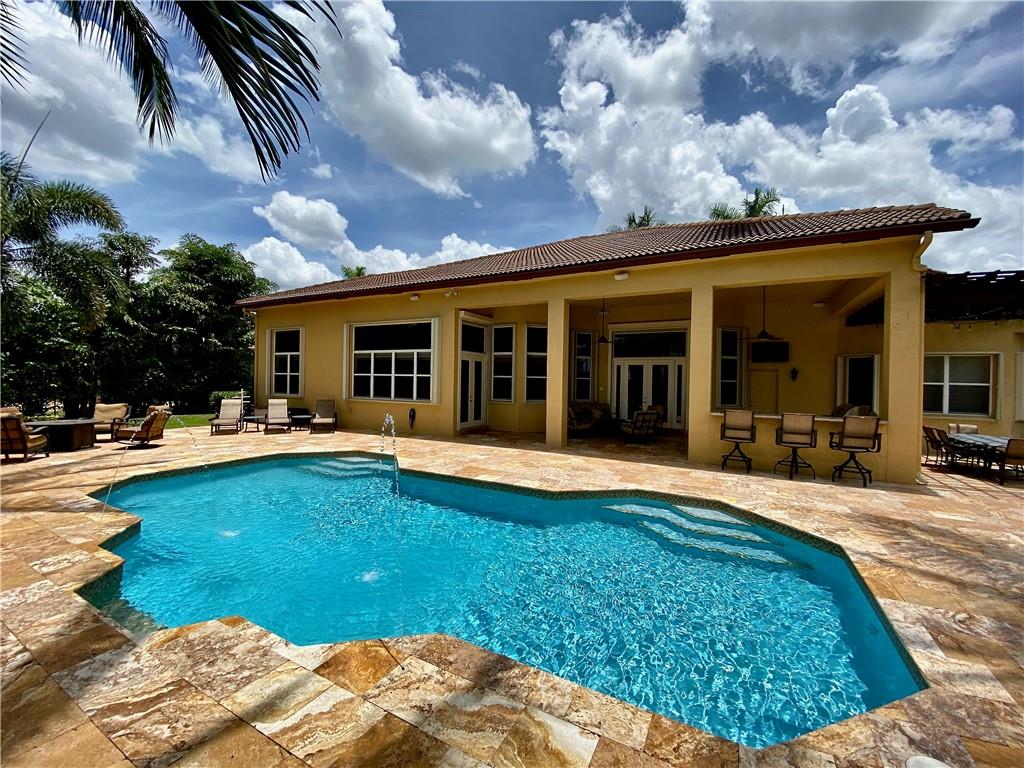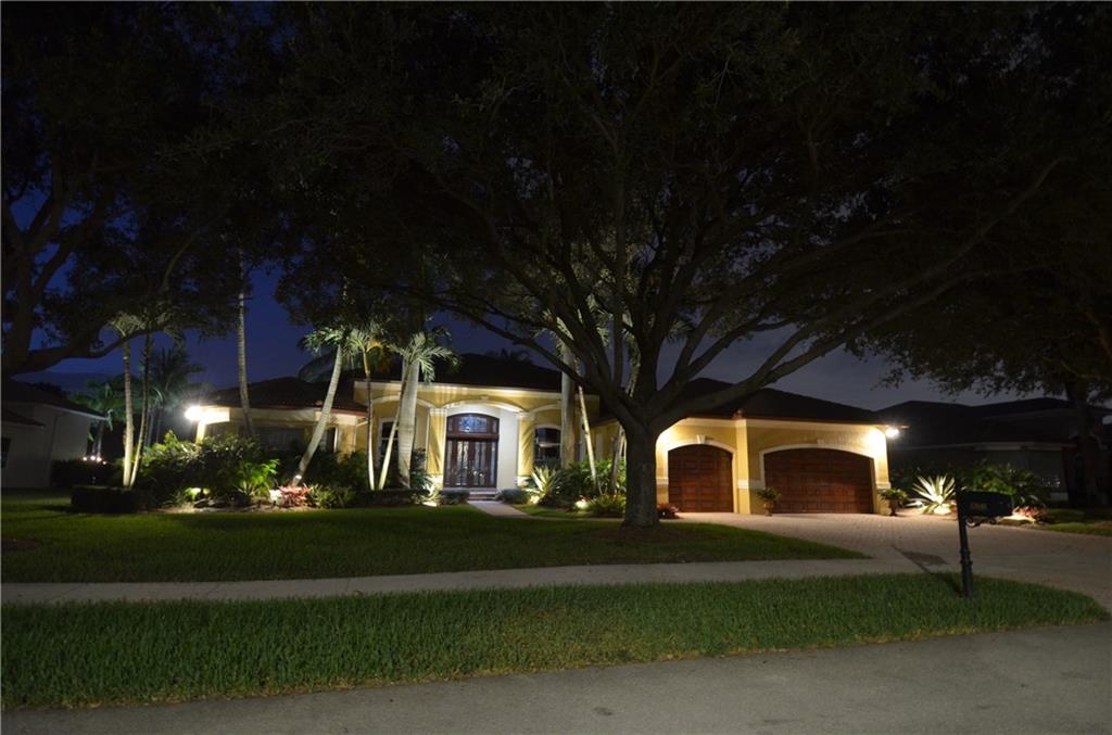 Virtual Tour has video, floor plan, survey and more. This is a magnificent find which is a rare 6 bedroom Hanover model. The home is just 3 houses from the end of the cul-de-sac street. The ideal northern rear exposure overlooks the water and one of Davie's many equestrian trails. The front is host to lush landscaping including 3 very mature Oak trees. The fenced back yard is gorgeous, with a pergola, covered summer kitchen, huge travertine marble pool deck which leads to step down trail where you can sit down near waters edge.. All windows have accordion shutters, and the glass rear french doors are protected by roll down shutters. A 32,000 Watt (32KW) emergency generator powers the entire house during power loss. The inside offers 5 full bedrooms and a den. See Virtual Tour for details