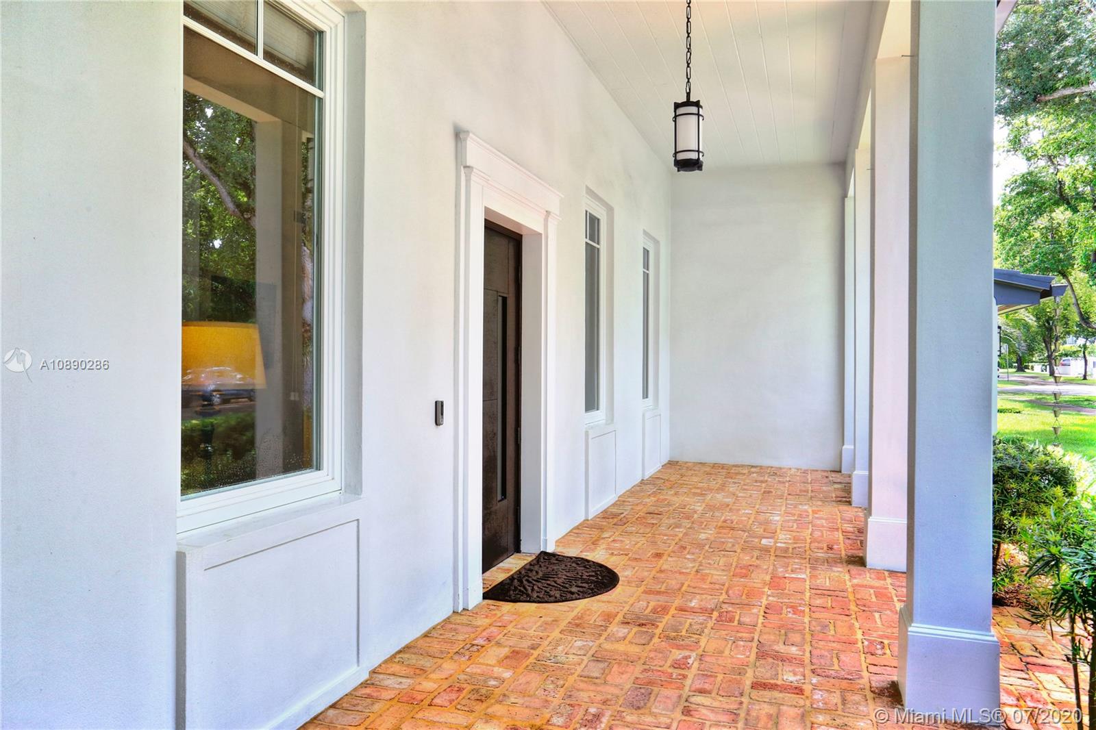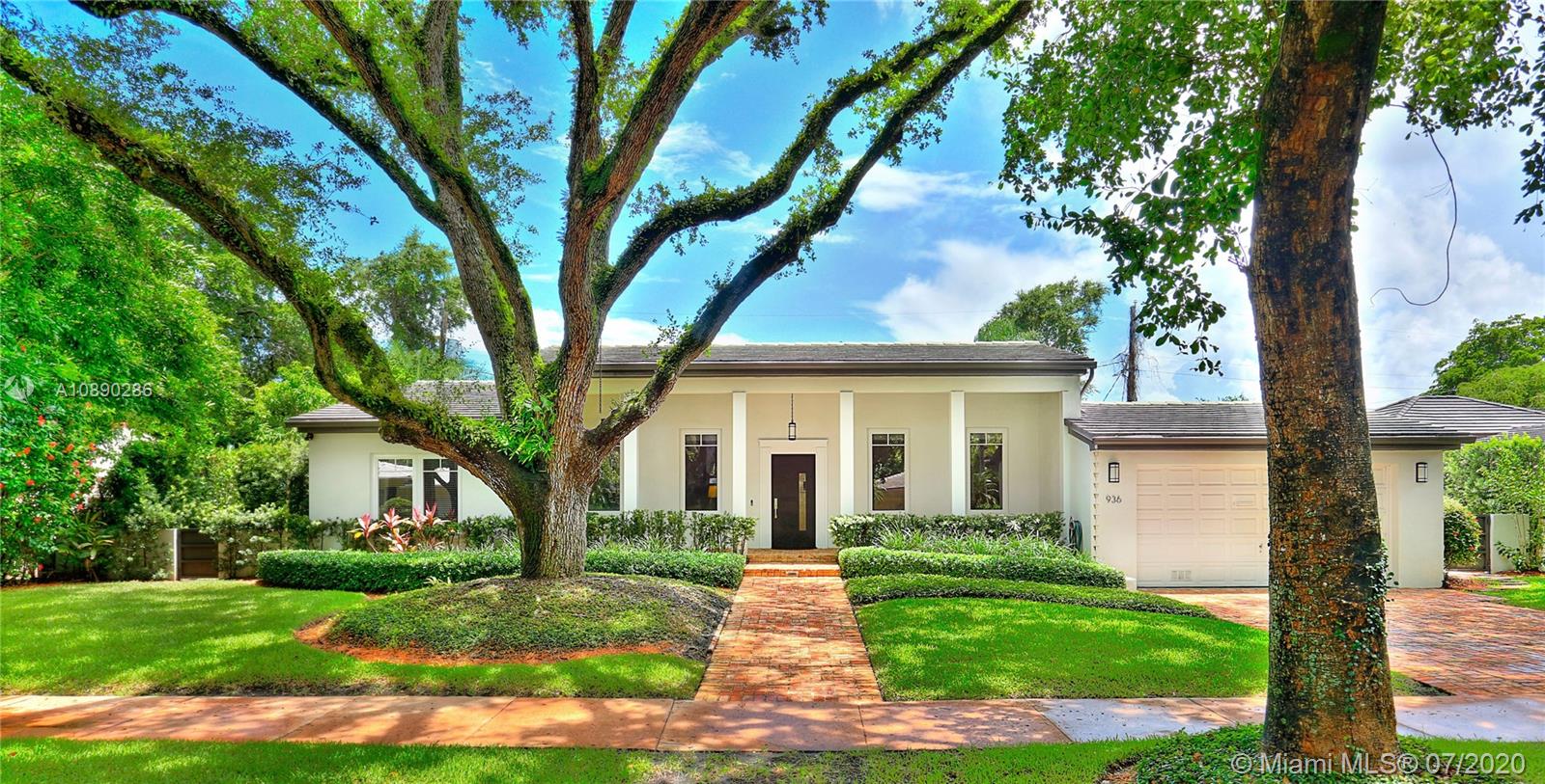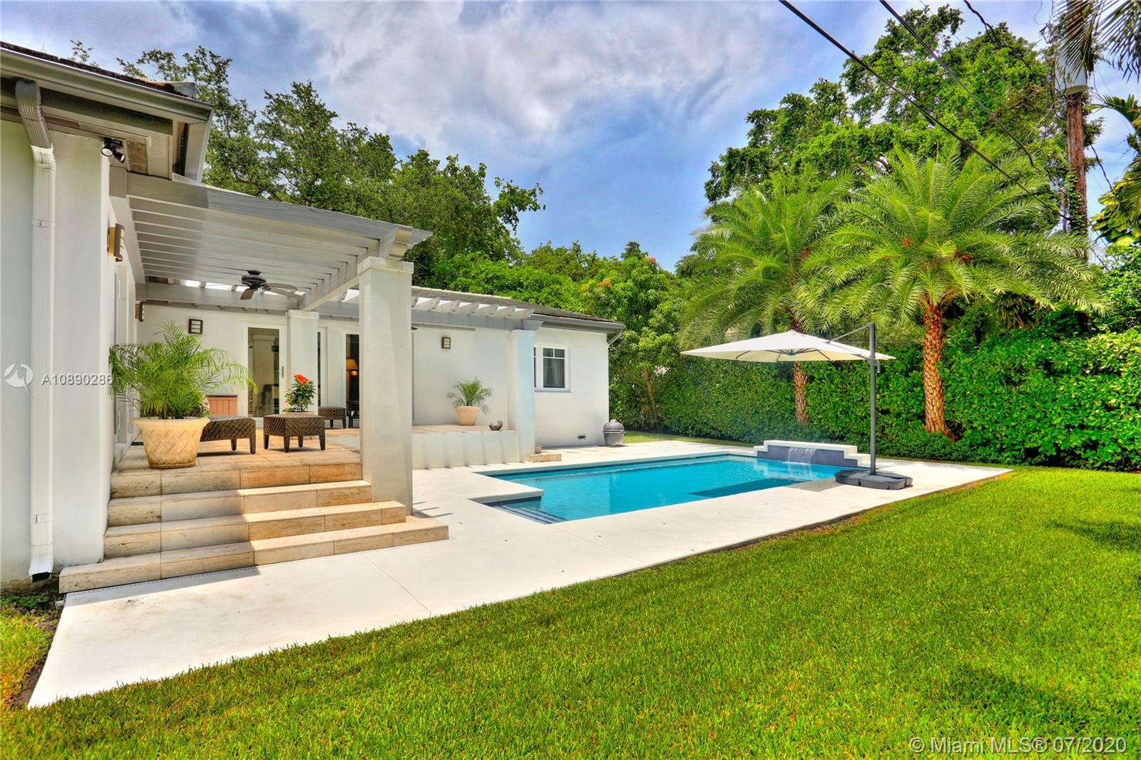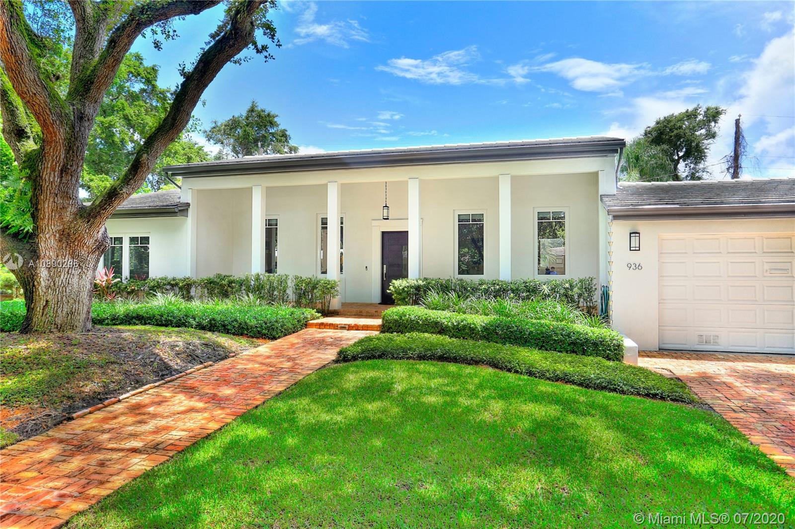Absolutely beautiful South Gables Home! Contemporary colonial style home on prestigious & quiet street with majestic oaks on 12,000-SF lot. Lovingly restored & added onto, this home features 12-foot ceilings in the living & dining rooms, 2 family rooms overlooking the backyard oasis, gracious front porch with Chicago brick matching driveway & walkways, all impact doors & windows, & fireplace. Stunning new kitchen features a large eat-in island, gas range, SS appliances & modern white sleek wooden cabinets. Gorgeous backyard retreat offers a large covered porch overlooking the new pool with fountain, & spacious yard. Master suite boasts vaulted ceilings, walk-in closet & lux bath. Split floor plan with 2 bedrooms on one side, & master & 1 bedroom on the other, laundry room, & 2-car garage.