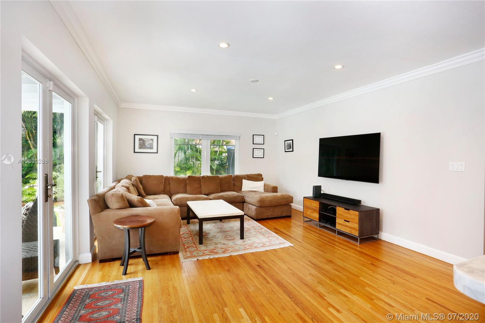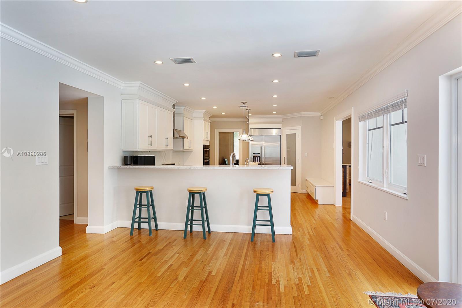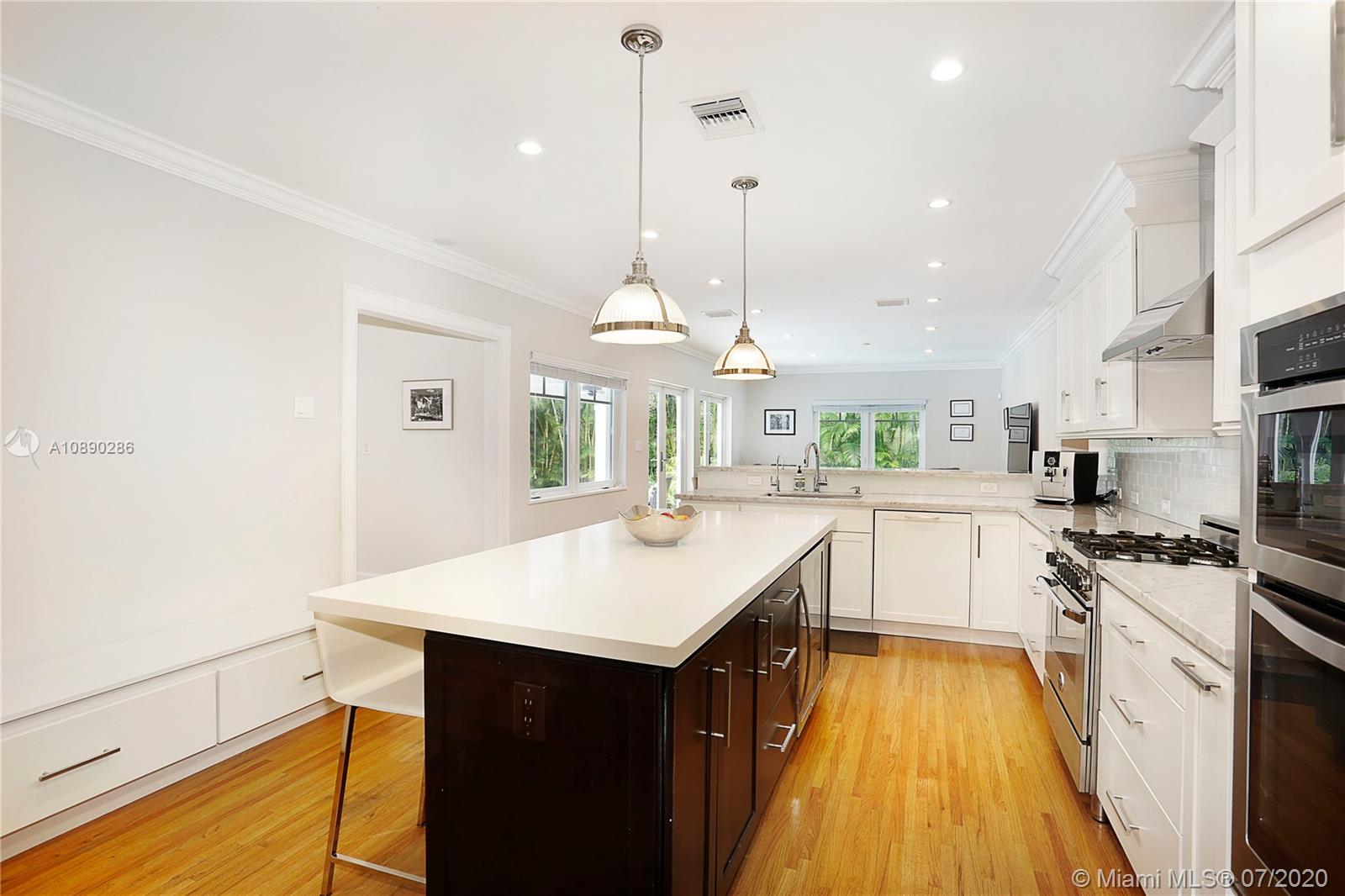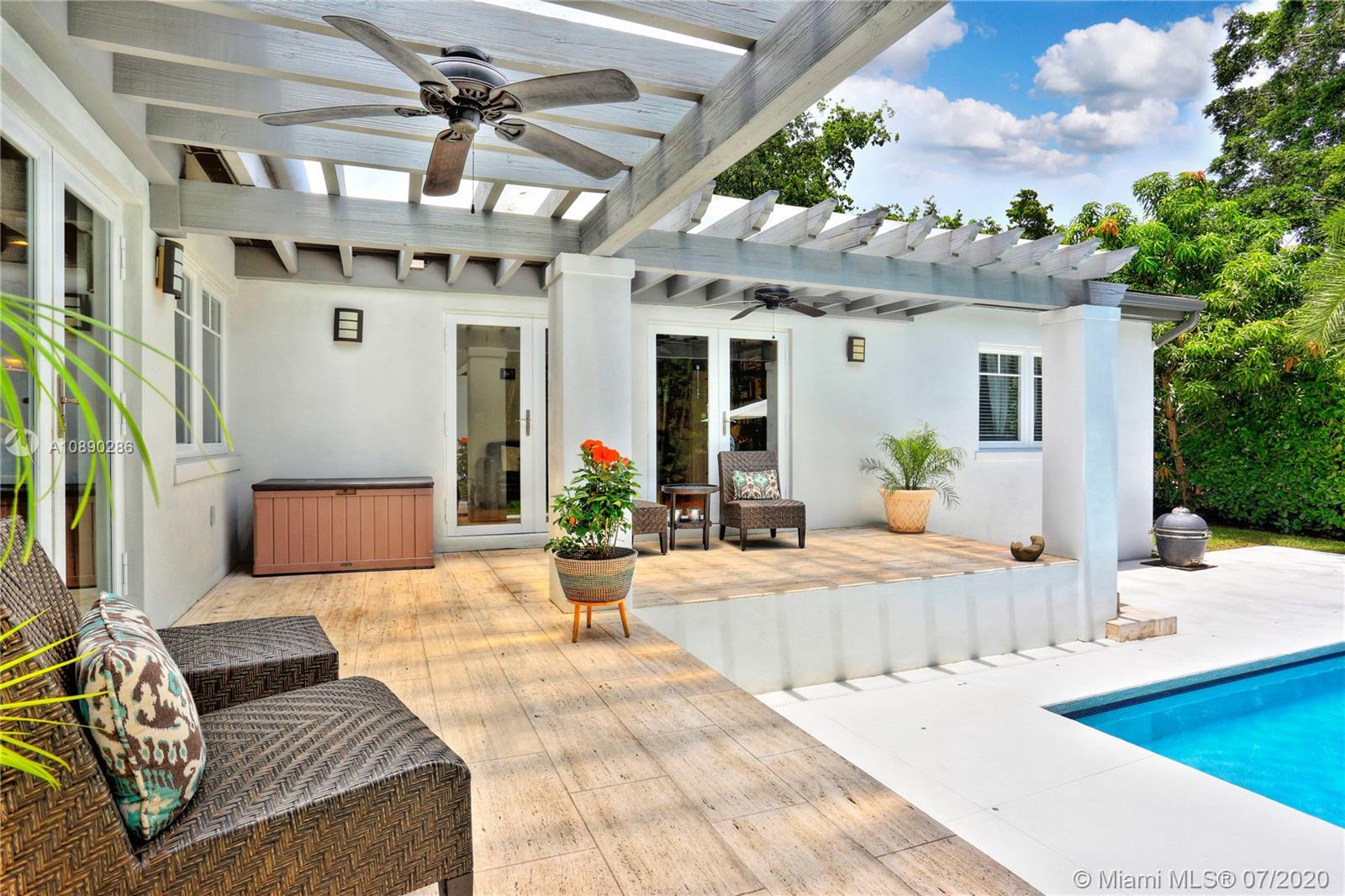 Absolutely beautiful South Gables Home! Contemporary colonial style home on prestigious & quiet street with majestic oaks on 12,000-SF lot. Lovingly restored & added onto, this home features 12-foot ceilings in the living & dining rooms, 2 family rooms overlooking the backyard oasis, gracious front porch with Chicago brick matching driveway & walkways, all impact doors & windows, & fireplace. Stunning new kitchen features a large eat-in island, gas range, SS appliances & modern white sleek wooden cabinets. Gorgeous backyard retreat offers a large covered porch overlooking the new pool with fountain, & spacious yard. Master suite boasts vaulted ceilings, walk-in closet & lux bath. Split floor plan with 2 bedrooms on one side, & master & 1 bedroom on the other, laundry room, & 2-car garage.