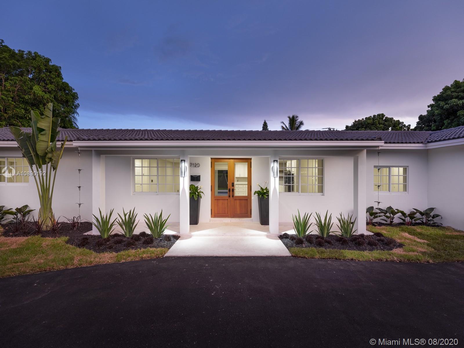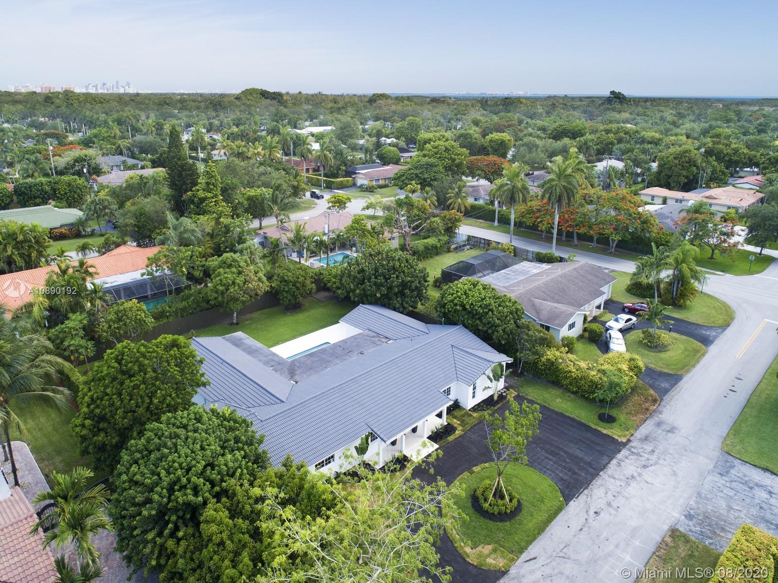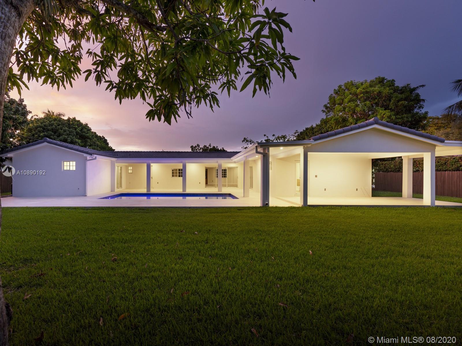 Remarkable one-story retreat located on a quiet street in N Pinecrest. This 5 beds/5 baths home has been completely remodeled w/the finest modern finishes. Greeted by a spacious open floorplan w/all around views of the outdrs & sparkling new pool, new chef’s kitchen w/modern Wi-Fi appl, new bathrms & extra rooms for multiple home offices & storage closets. The home offers a split plan w/ 3 large en-suite bedrms on one side & 2 beds/2 baths on the other, making it perfect for guests/in-law quarters w/private entrance on the side. Serene views of the crystal blue pool, shell stone patio & backyd from all angles in the house. Extra Feat: imp. win/drs, summer kit hookup, all remodeling work done w/proper permits, all waste lines redone w/PVC, European faucets, quartz counters & porcelain flrs.