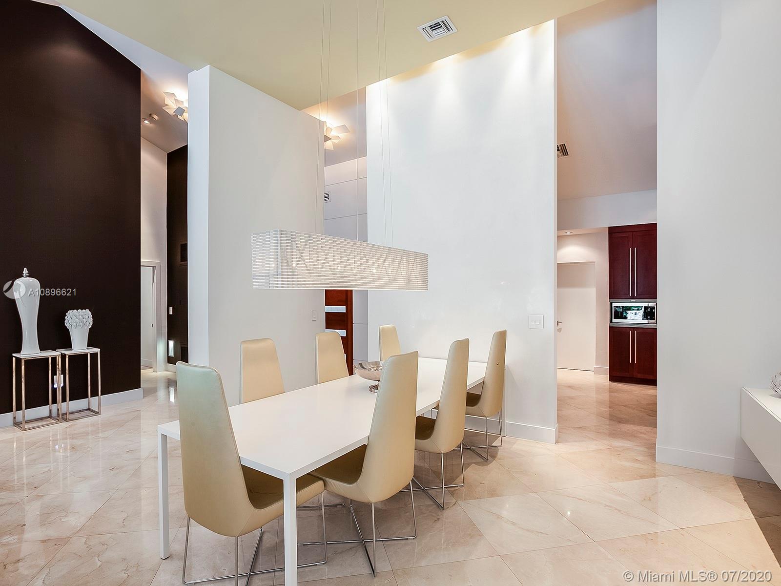 Welcome home to a fabulous floor plan w/ grand double door entrance & a chic open-concept, with a lot of natural light due to over 15' vaulted ceilings & 3 skylights throughout. Completely renovated in 2013, every detail of this flawless home was carefully selected by a professional interior designer. Walking distance to Palmetto Elementary, Middle, and High School. This gated home features 4 big BR +service room/6.5 baths, walk-in-closets, crema marfil italian marble, wood floors in the bedrooms, impact windows/doors, roof redone (2013), laundry room, pool, a chef's kitchen w/Thermador and Jenn-Air appliances, a state of the art music system throughout, alarm system on screens & much more. Stunning fixtures and a custom-built bar included, magnificent spaces for family gatherings!
