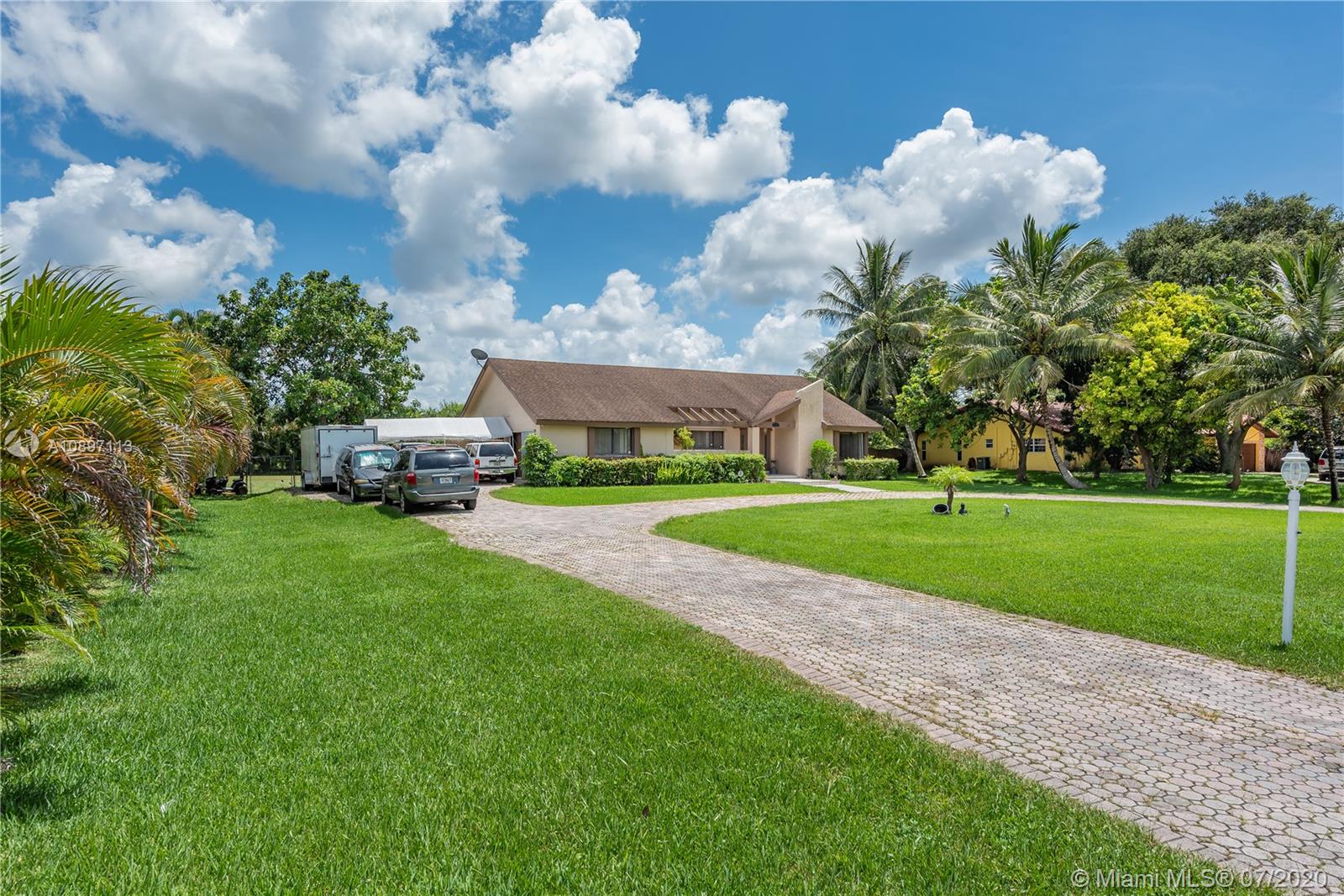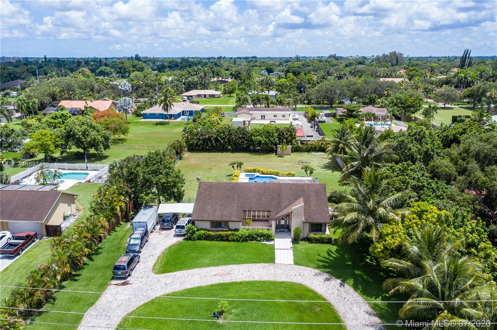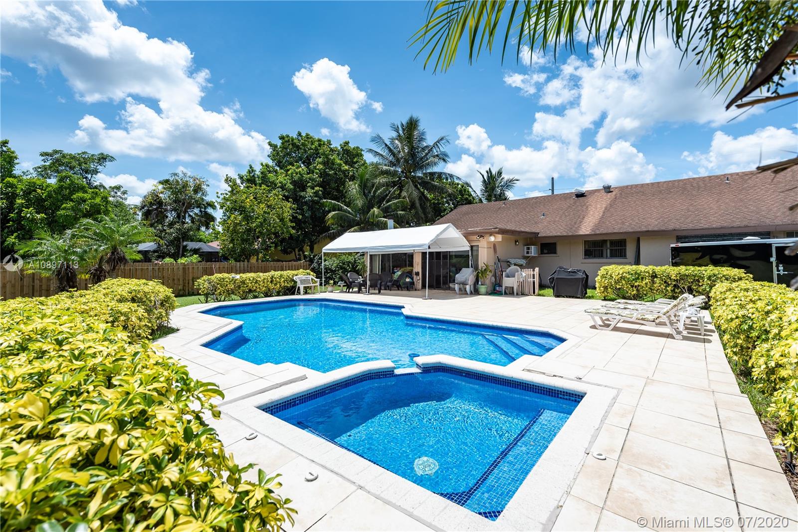 Great house with plenty of land for a homeowner that enjoy outdoor living. Home is sitting on a builder's acre boasting a tranquil pool with lush green everywhere with spacious areas for entertaining. Open and bright living and dining area with high ceilings. 3bed/2bath + an additional room from converted garage. Ceramic tile throughout living areas. New stainless steel appliances and granite kitchen counters tops. New A/C. Large circular drive way with plenty of room for lots of cars. Deep well. New pool pump. Hurricane shutters. Extra insulation. Prime Davie location. No HOA. A rated schools. Just need your personal touch to be an amazing place to call home!!!