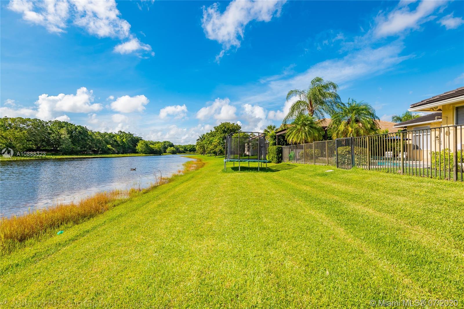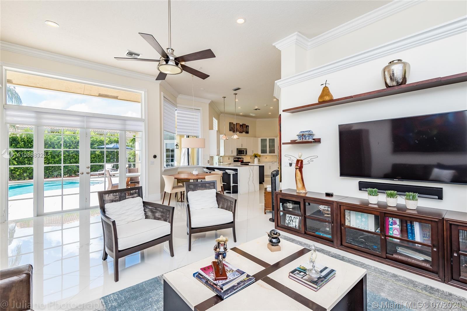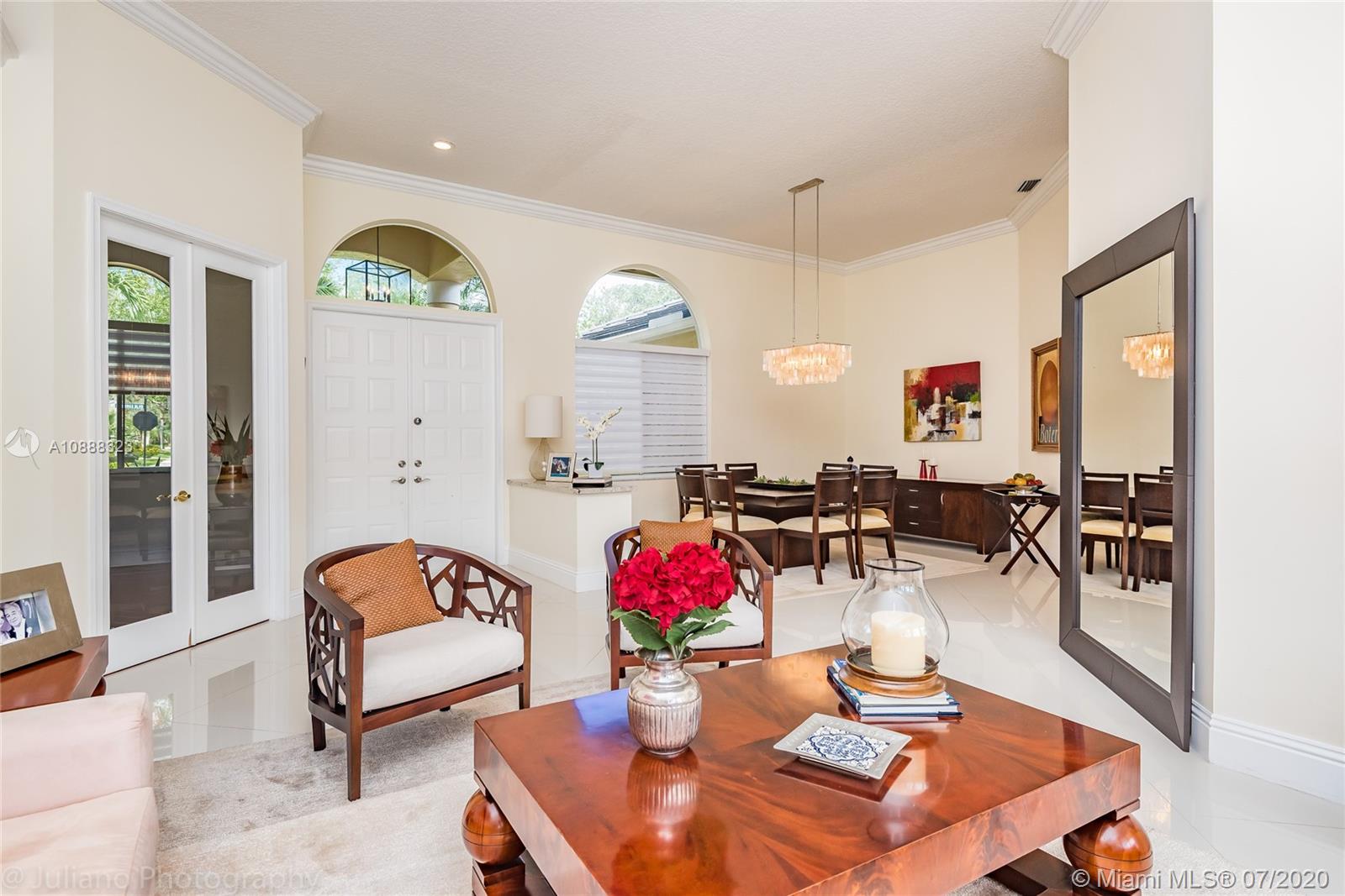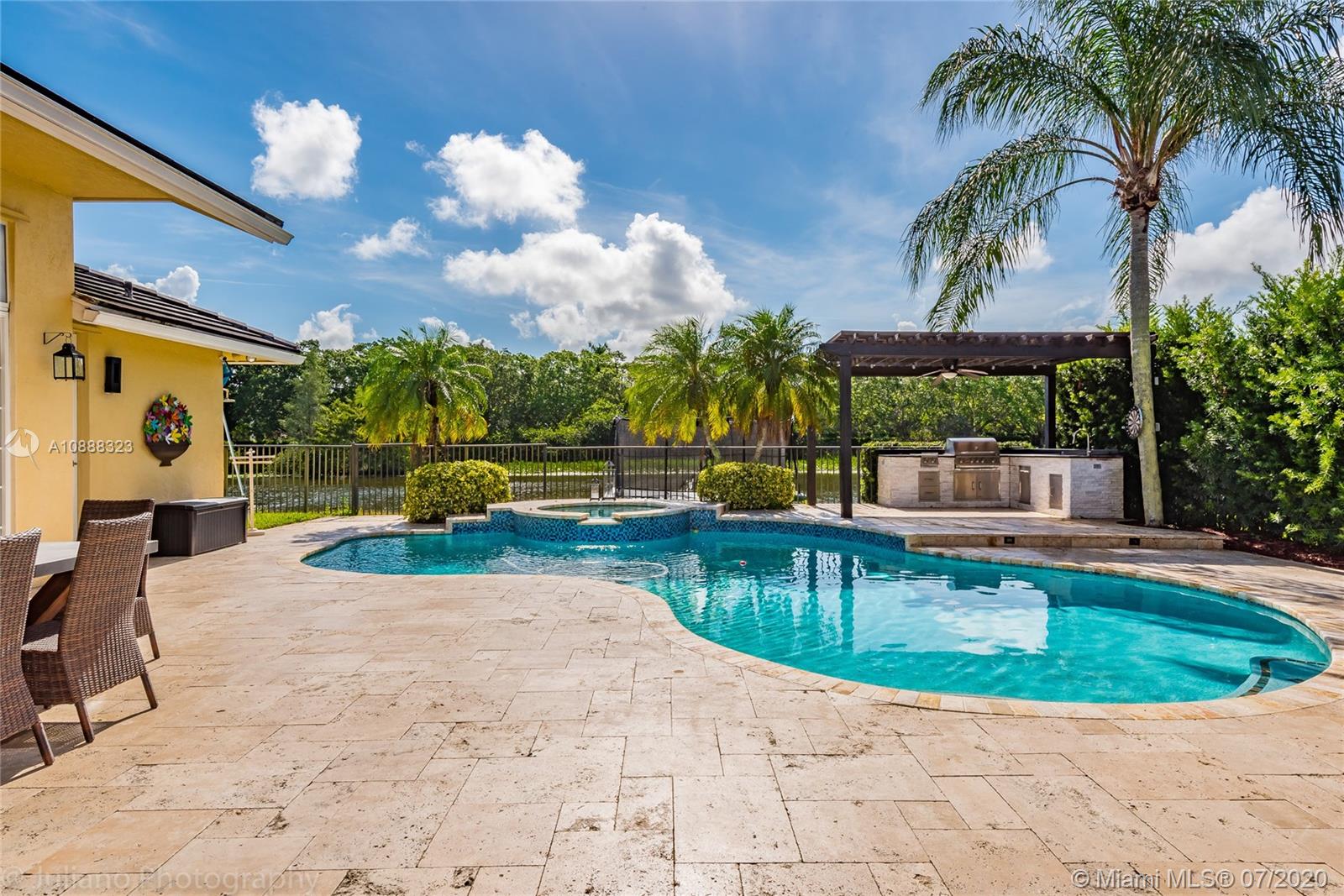 Custom built expanded Kingsley model features four spacious bedrooms plus an office and playroom with 3.5 baths. Enjoy lush tropical landscaping and 11.000 square foot lot fully fenced with expansive renovated salt pool with intelligent control trough your mobile, extended paver pool deck, summer kitchen under a gazebo and long unobstructed lake views with no neighbors behind. Master bedroom with soaring ceilings. Recently renovated Contemporary kitchen with white marble countertops, stainless steel appliances flows to family room with sliders to yard, neutral tones throughout. BRAND NEW custom master bath with vessel tub and oversized shower. This home shows bright and airy. Enjoy extensive crown moldings, marble floors, hurricane shutters, 3 car garage. Must See!