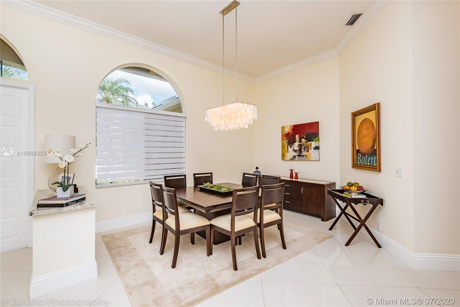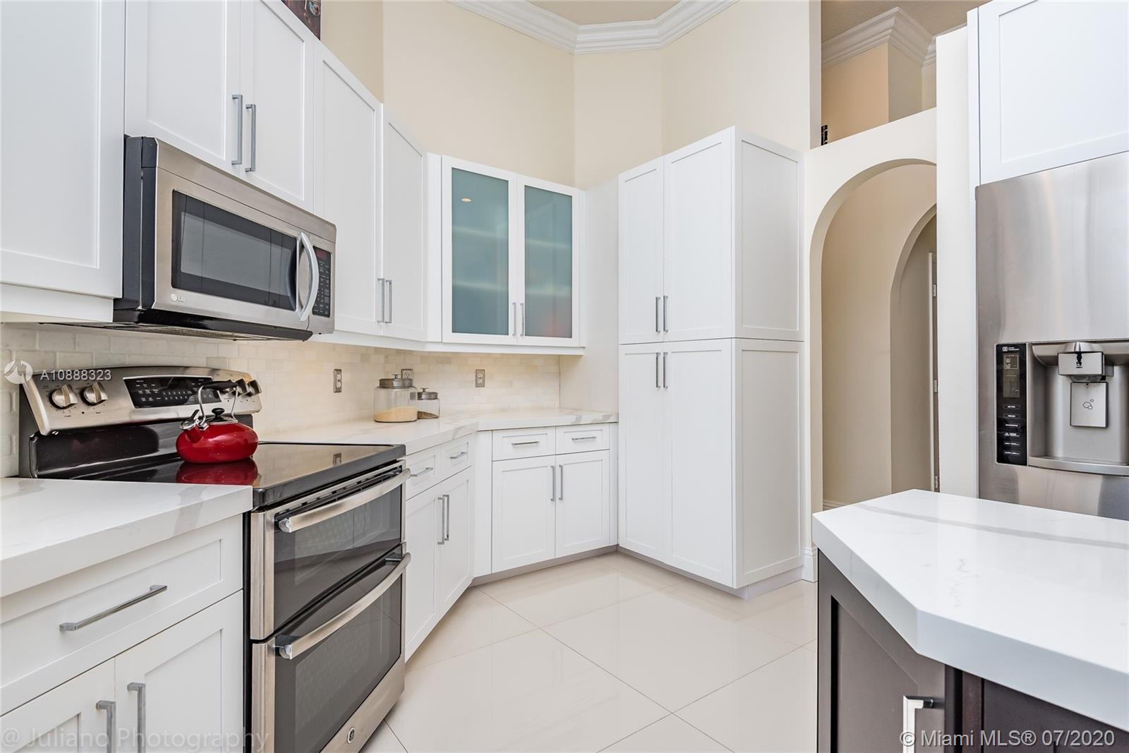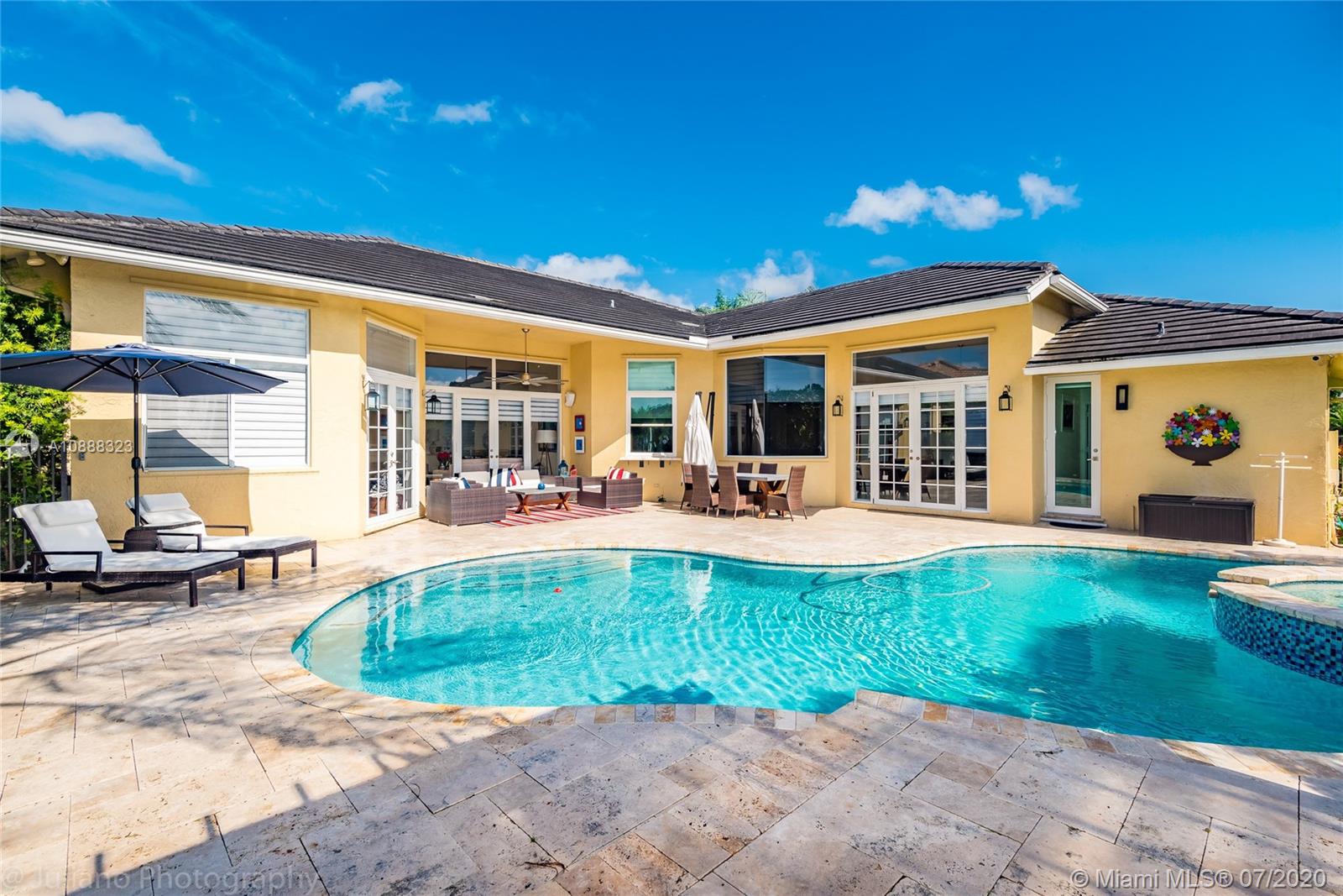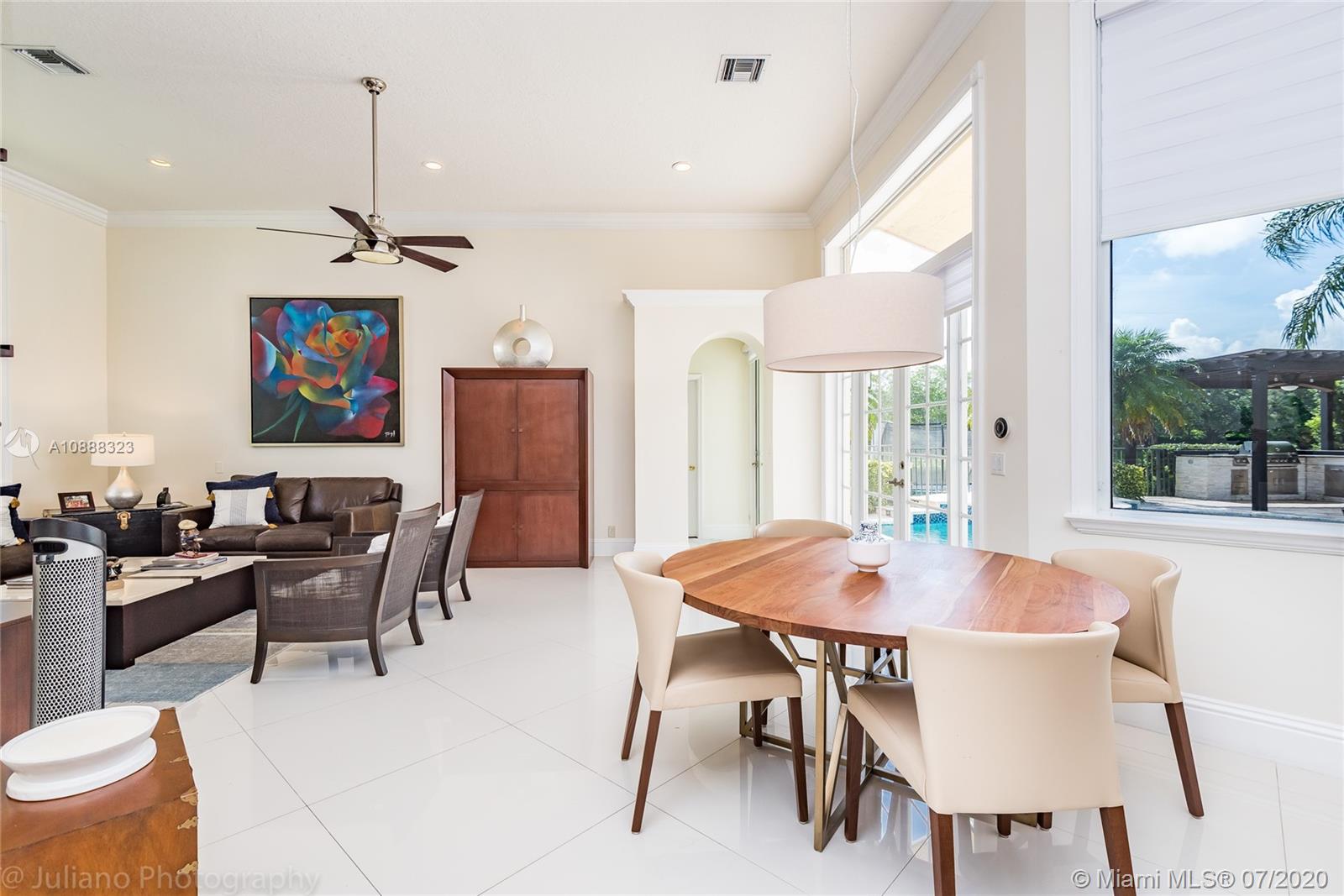Custom built expanded Kingsley model features four spacious bedrooms plus an office and playroom with 3.5 baths. Enjoy lush tropical landscaping and 11.000 square foot lot fully fenced with expansive renovated salt pool with intelligent control trough your mobile, extended paver pool deck, summer kitchen under a gazebo and long unobstructed lake views with no neighbors behind. Master bedroom with soaring ceilings. Recently renovated Contemporary kitchen with white marble countertops, stainless steel appliances flows to family room with sliders to yard, neutral tones throughout. BRAND NEW custom master bath with vessel tub and oversized shower. This home shows bright and airy. Enjoy extensive crown moldings, marble floors, hurricane shutters, 3 car garage. Must See!
