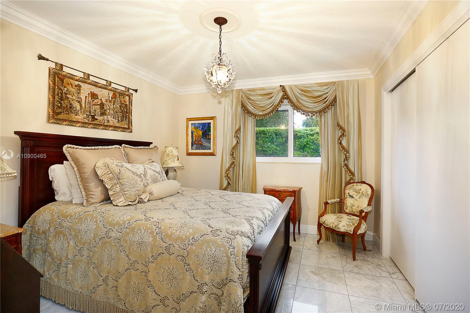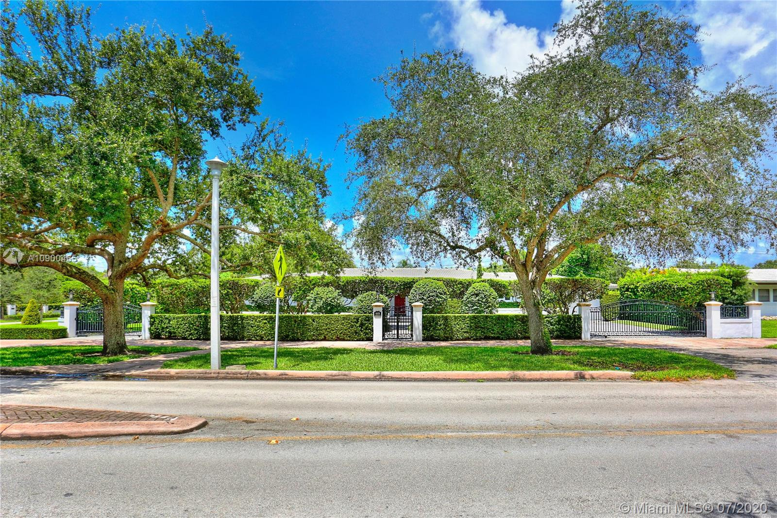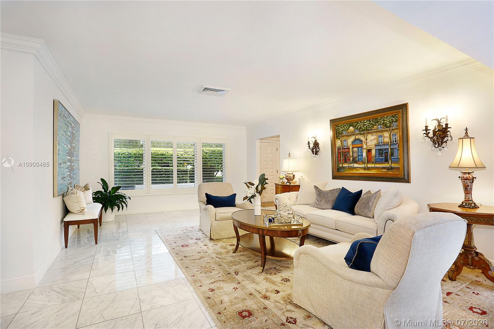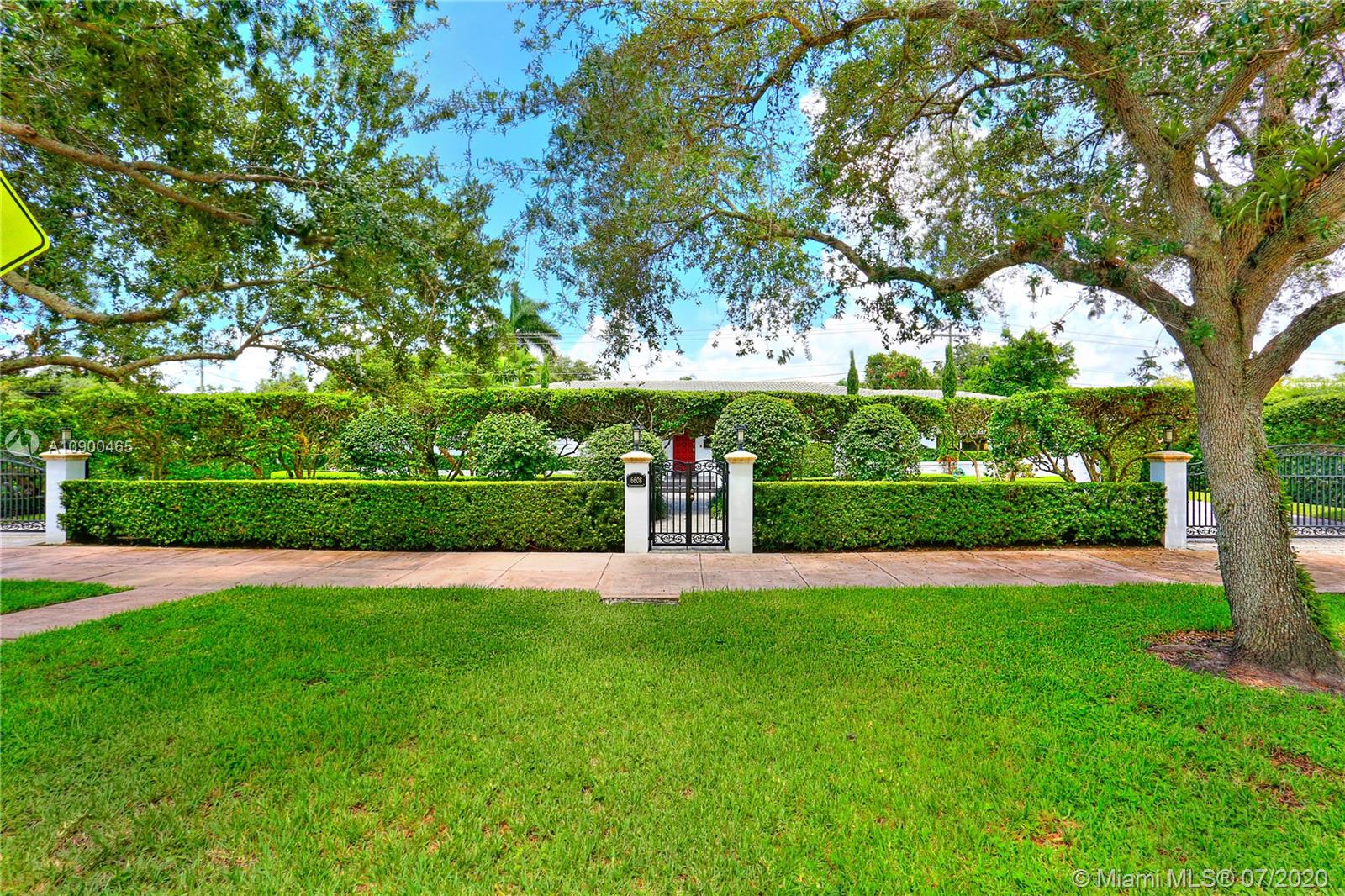 This elegant & spacious 3 bed/3 bath gated home with pool is nestled in South Coral Gables & sits on a 14,300 sq ft corner lot. The Master Suite is equipped with an oversized walk-in closet and dressing room which was previously used as a 4th bedroom. This home has many great features from an ample circular driveway, a grand dining room with high ceilings leading to the family room that's equipped with a summer kitchen. The beautiful eat-in kitchen features Viking appliances, quartz countertops, custom-made wood cabinets & a 48 dual gas range. In addition, the home has a large home office/media room with a bar. Other features include impact windows & doors, a 1-car garage, marble floors throughout & a screened-in pool. This is a wonderfully updated home perfect for relaxing & entertaining.