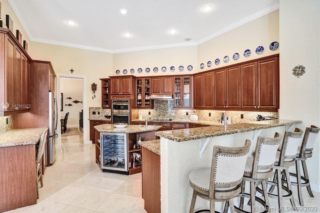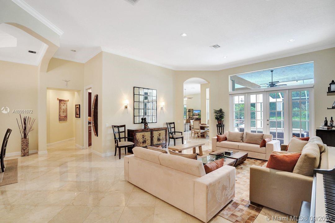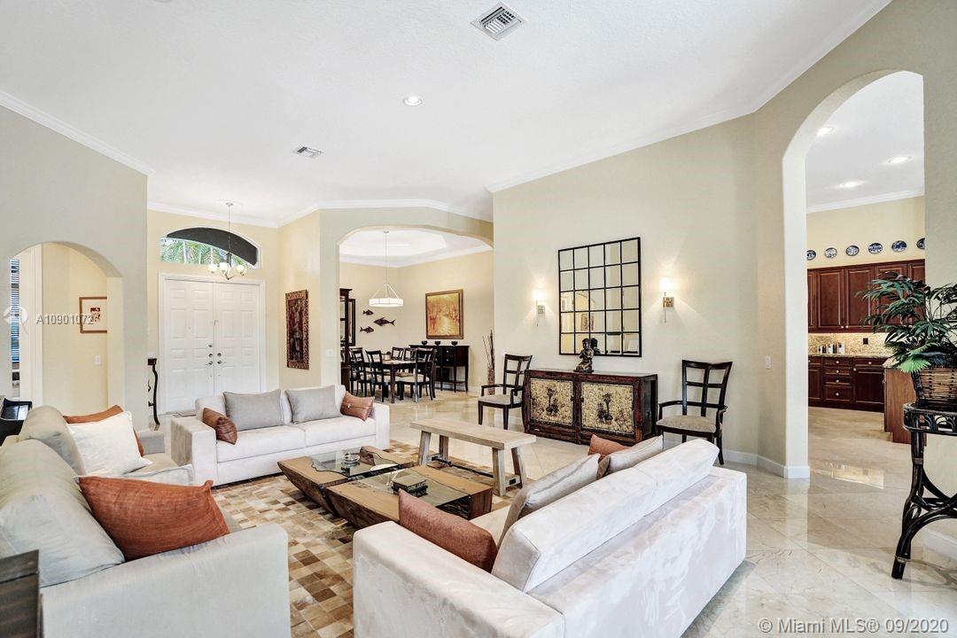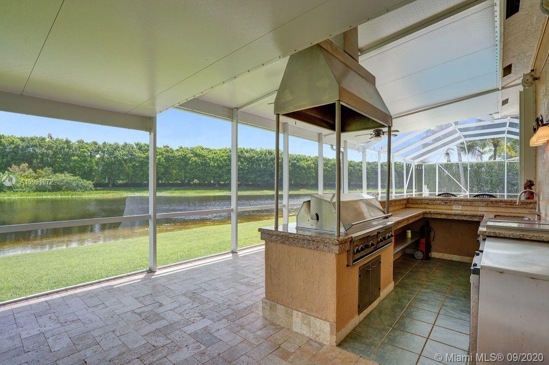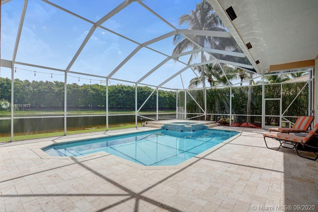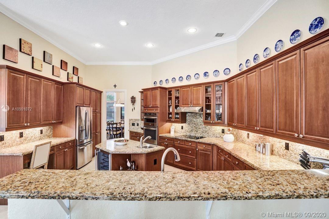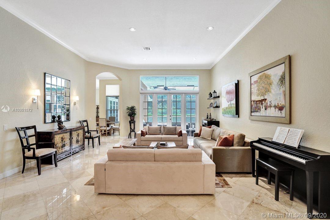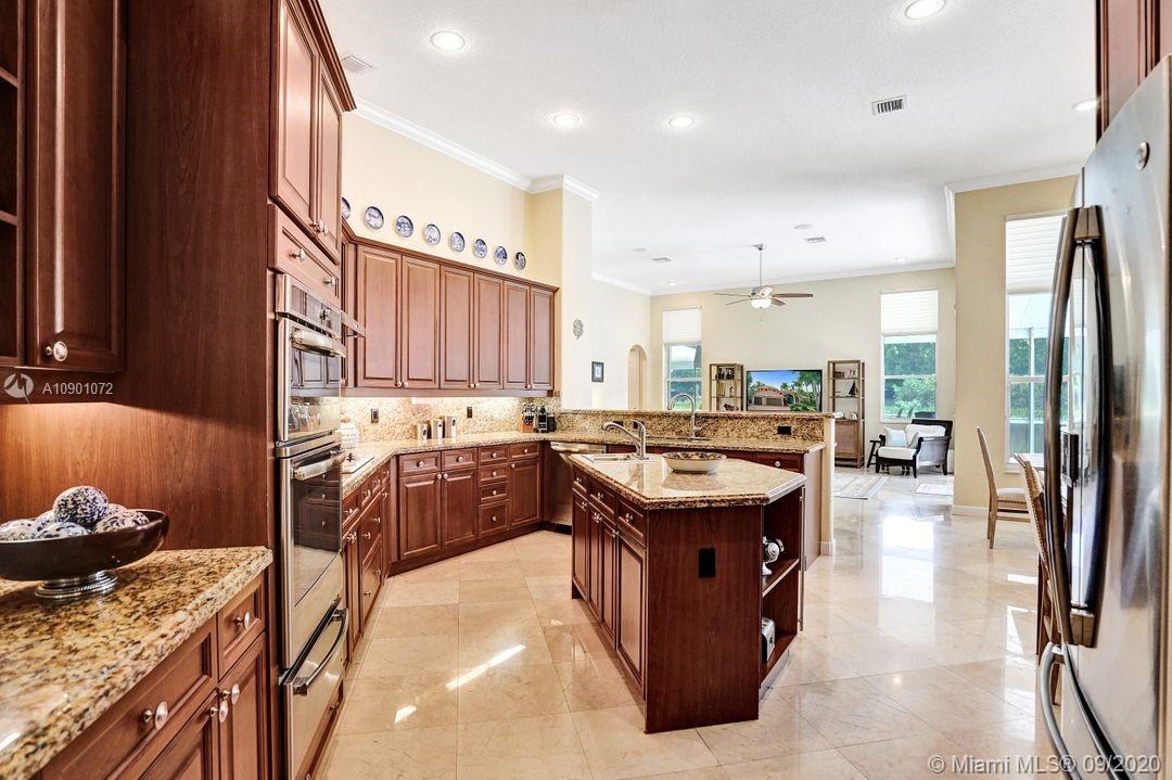 Elegant Mystic Model located in the prestigious gated community of Victoria Isle at Weston Hills Country Club. This sprawling property is placed perfectly amidst a royal palm tree-lined street. Enjoy 5 generous bedrooms plus den and office Attention to every detail in this meticulously maintained home. Marble floors flow throughout living areas. Chefs delight kitchen with wood cabinets, granite counters, center island, and double ovens. Extensive crown moldings. Commercial built-in grill with expansive covered and screened patio. Travertine patio with long unobstructed lake views to the berm. Walk to community park. Lushly landscaped, oversized lot with grand paver circular driveway, full accordion protection. 3 car garage currently houses additional full bed/bath.