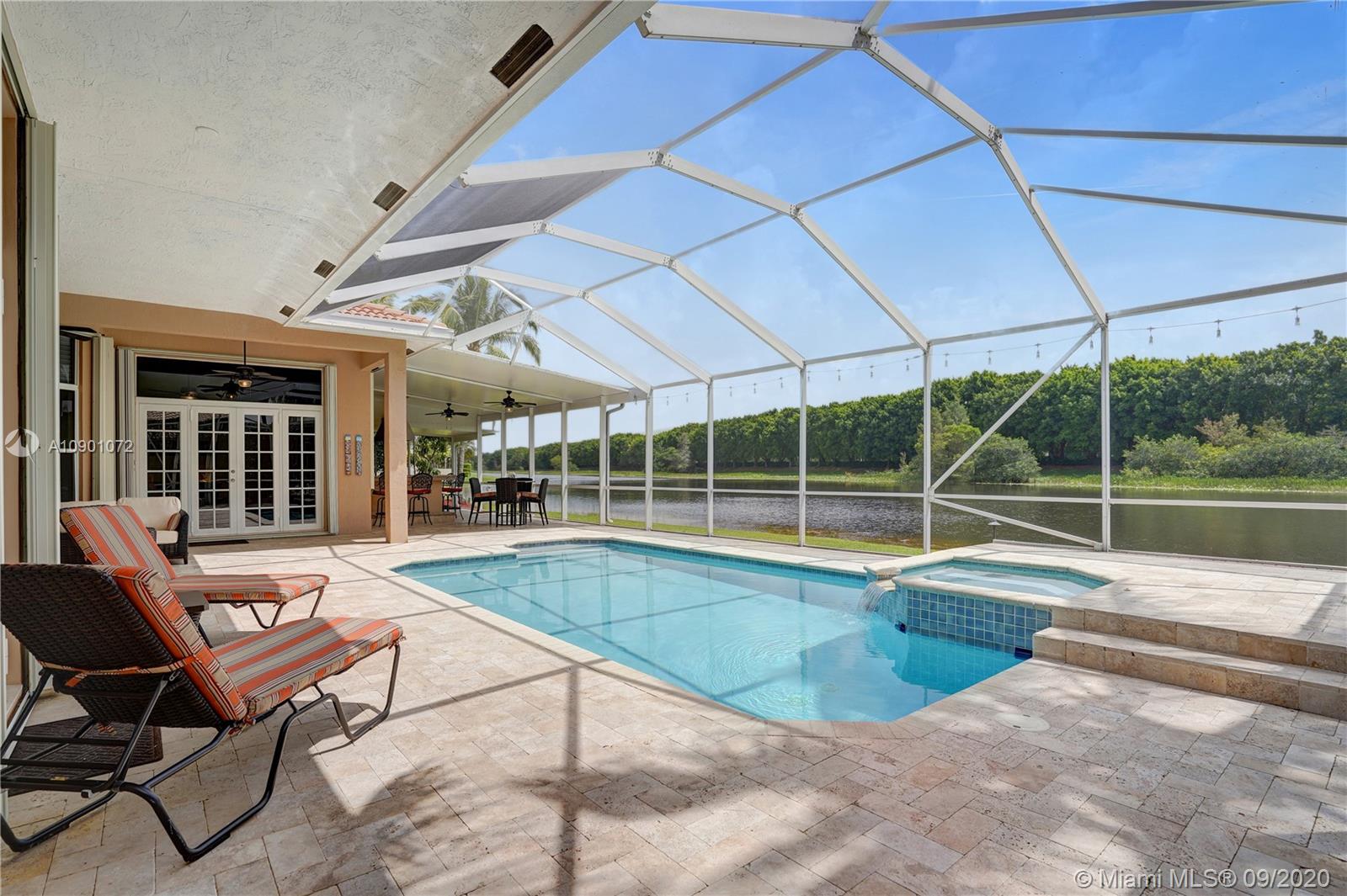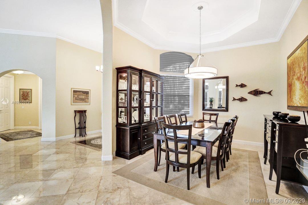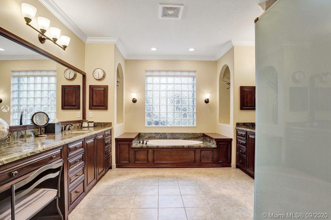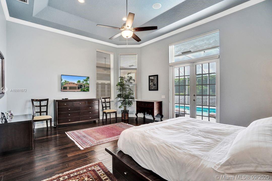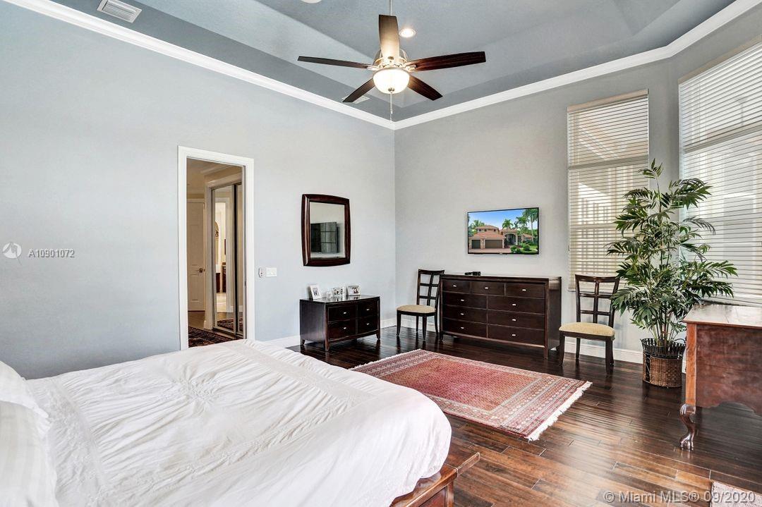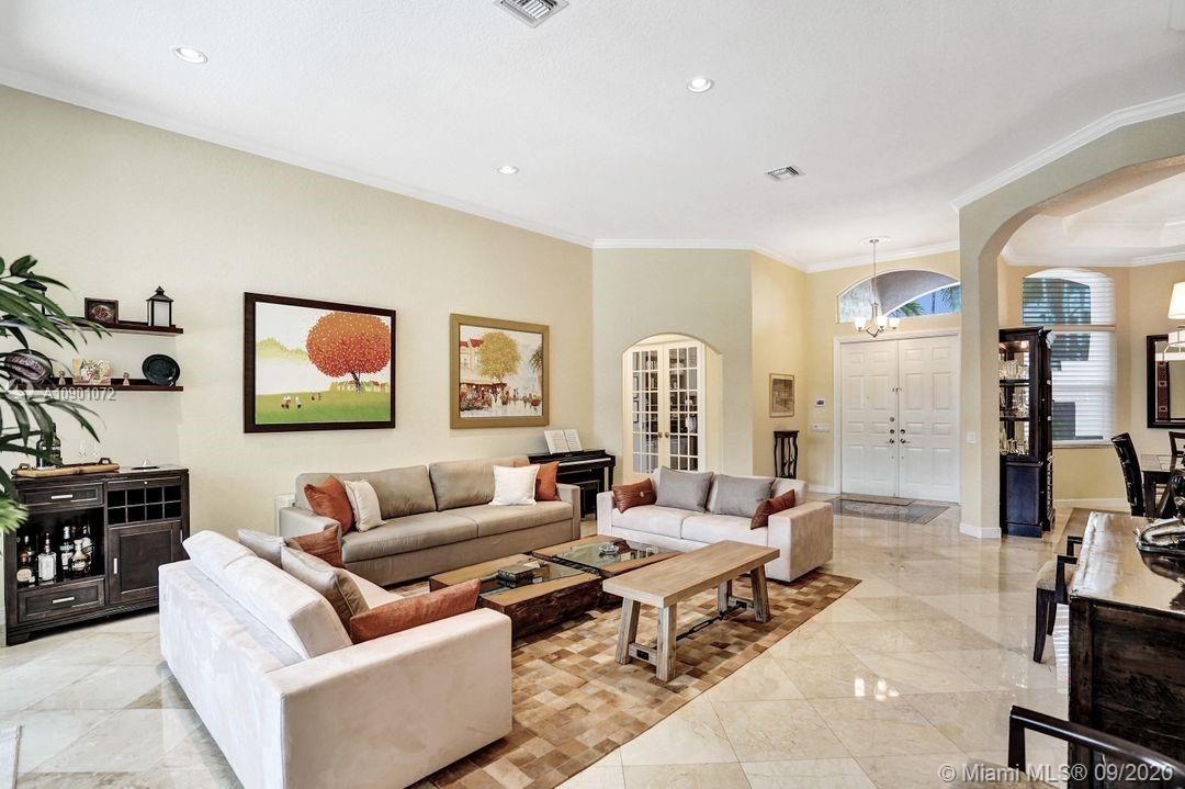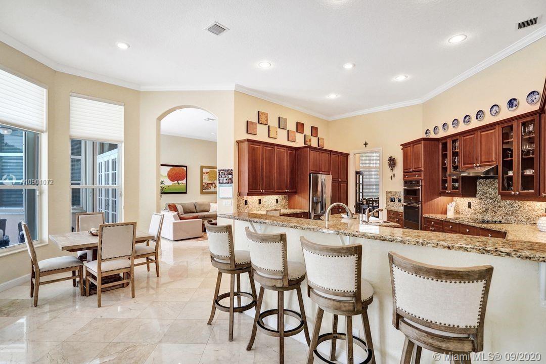 Elegant Mystic Model located in the prestigious gated community of Victoria Isle at Weston Hills Country Club. This sprawling property is placed perfectly amidst a royal palm tree-lined street. Enjoy 5 generous bedrooms plus den and office Attention to every detail in this meticulously maintained home. Marble floors flow throughout living areas. Chefs delight kitchen with wood cabinets, granite counters, center island, and double ovens. Extensive crown moldings. Commercial built-in grill with expansive covered and screened patio. Travertine patio with long unobstructed lake views to the berm. Walk to community park. Lushly landscaped, oversized lot with grand paver circular driveway, full accordion protection. 3 car garage currently houses additional full bed/bath.