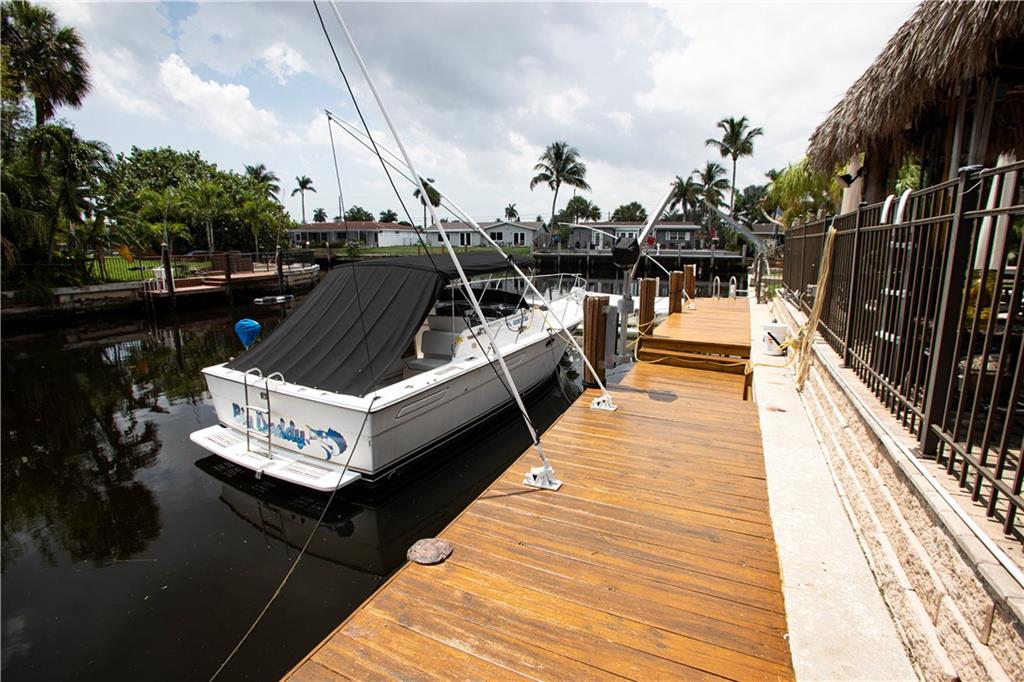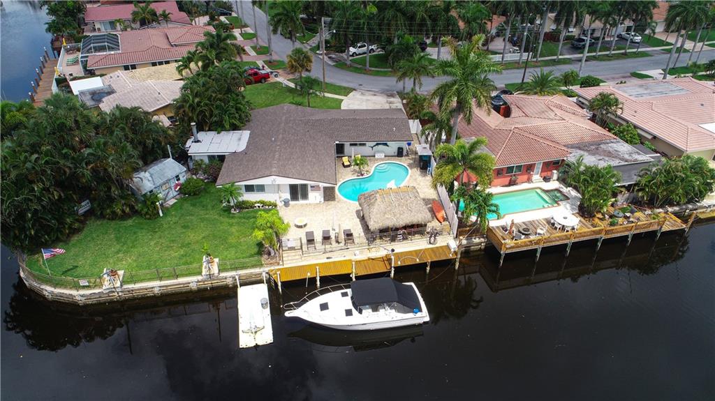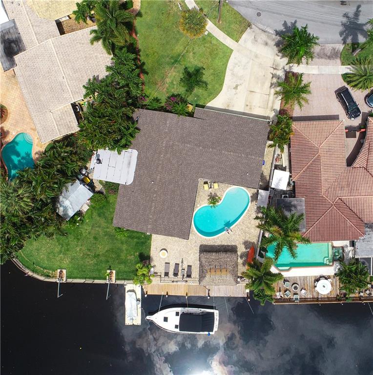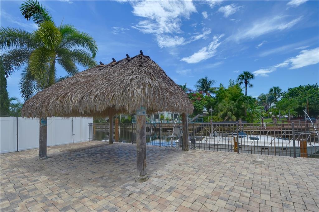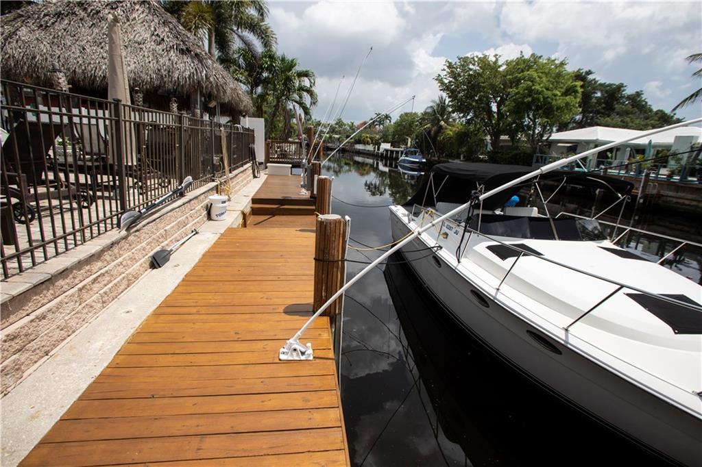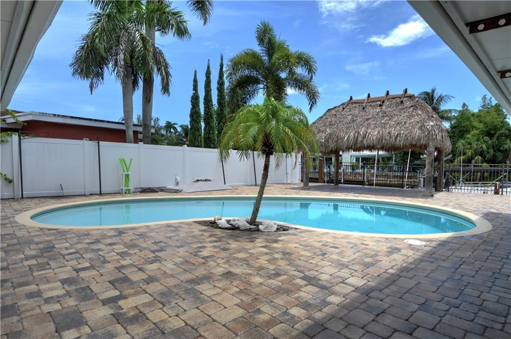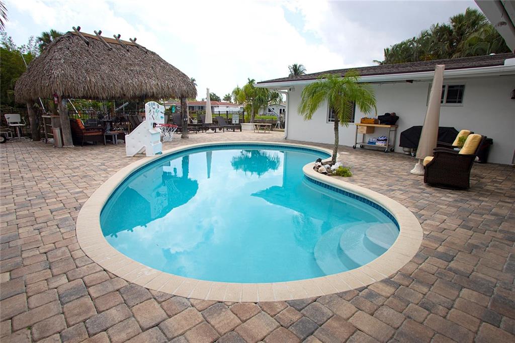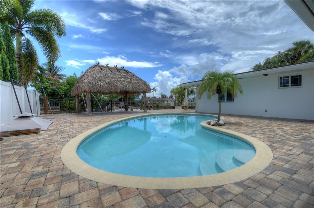 A highly updated waterfront pool home located in a cul-de-sac! A rare 4 bed/3 bath home, oversized corner lot of 10,000’+ & 130’+ of water frontage, new 51’ dock & well maintained seawall. Open concept floor plan with a remodeled kitchen with island, wood cabinets, granite counter tops, SS appliances & enclosed laundry area. Neutral marble flrs throughout, remodeled baths, separate office area with built-ins & lg bar are but some of the great features! Surround sound inside & out with a 20’x10’ tiki hut, pavered patio, salt water pool recently re-marcited with new heater, new PVC fence & lg yard! 2 AC units, master has walk in closet, all impact windows & doors, new roof with warranty, new gutters and more... Freshly painted and ready for you to move in!