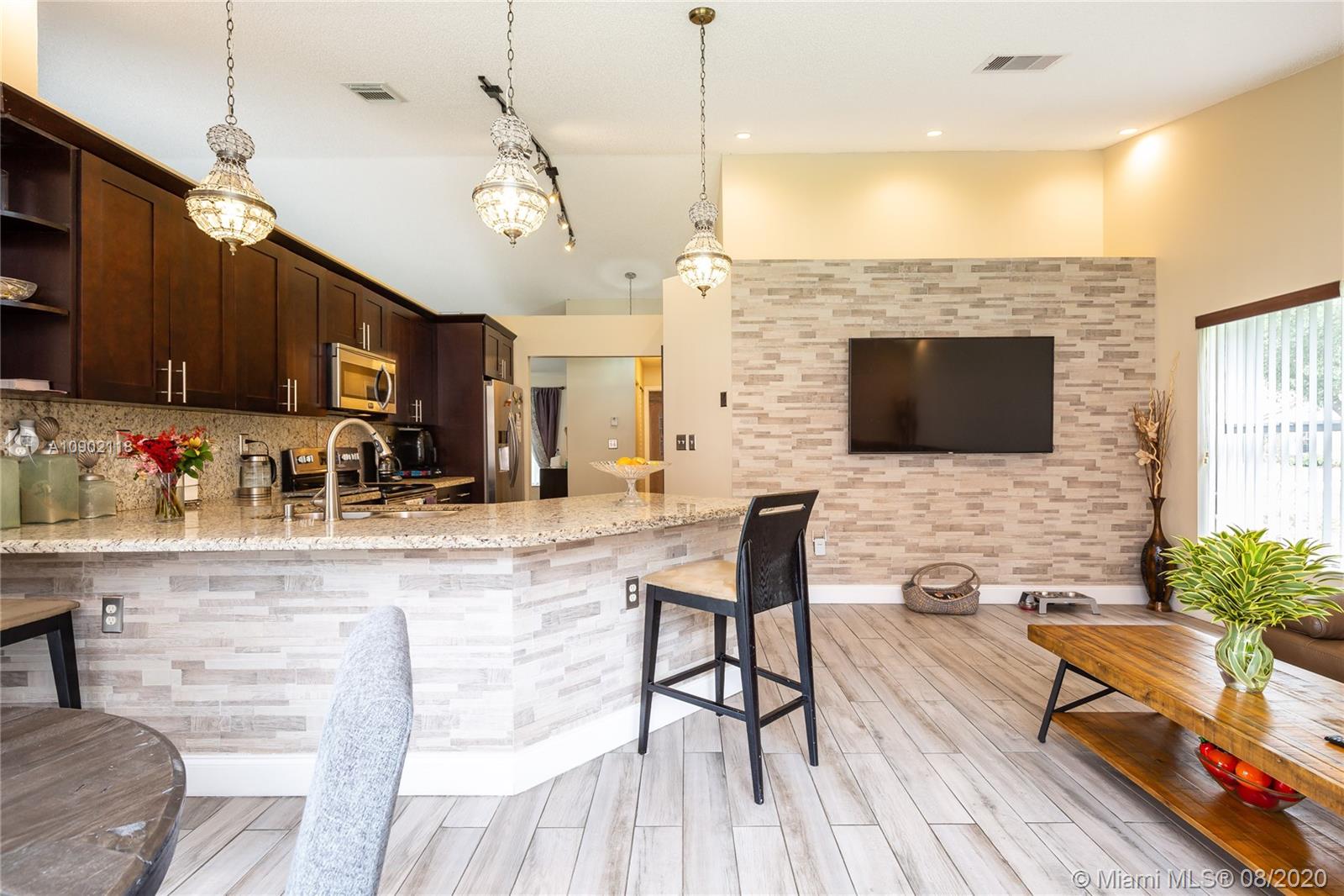 You will love this home!! It is located on a quiet tree lined street in Trilogy at Miramar. Newer barrel tile roof and hurricane shutters. Situated on a large corner lot with pretty landscaping and lots of room for a pool. 3 bedroom and 2 bathrooms plus a 2 car garage. Open floor plan with lots of windows. New ceramic wood look flooring,a beautifully remodeled kitchen with wood cabinets, granite counter tops and stainless steel appliances. there is a roomy breakfast bar and a kitchen table too all open to the family room featuring a custom stone wall. Low monthly HOA fee and a neighborhood that exudes pride of ownership.