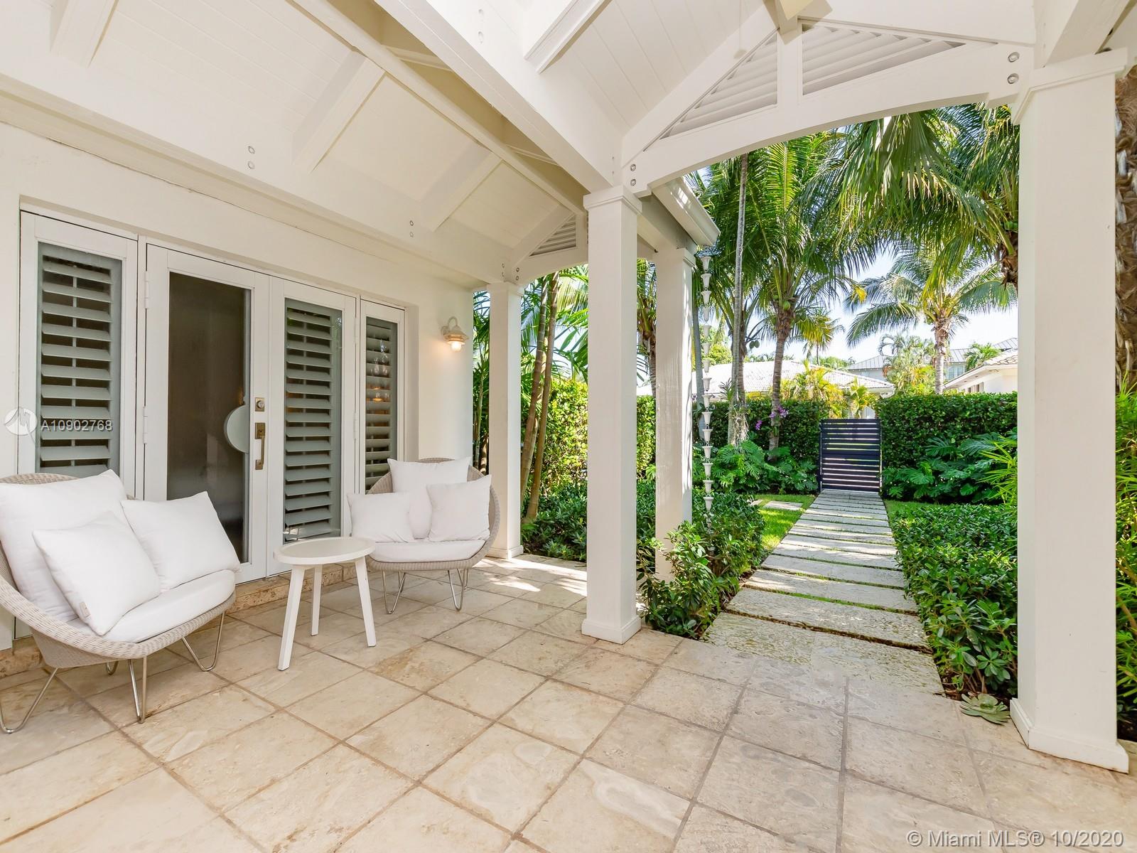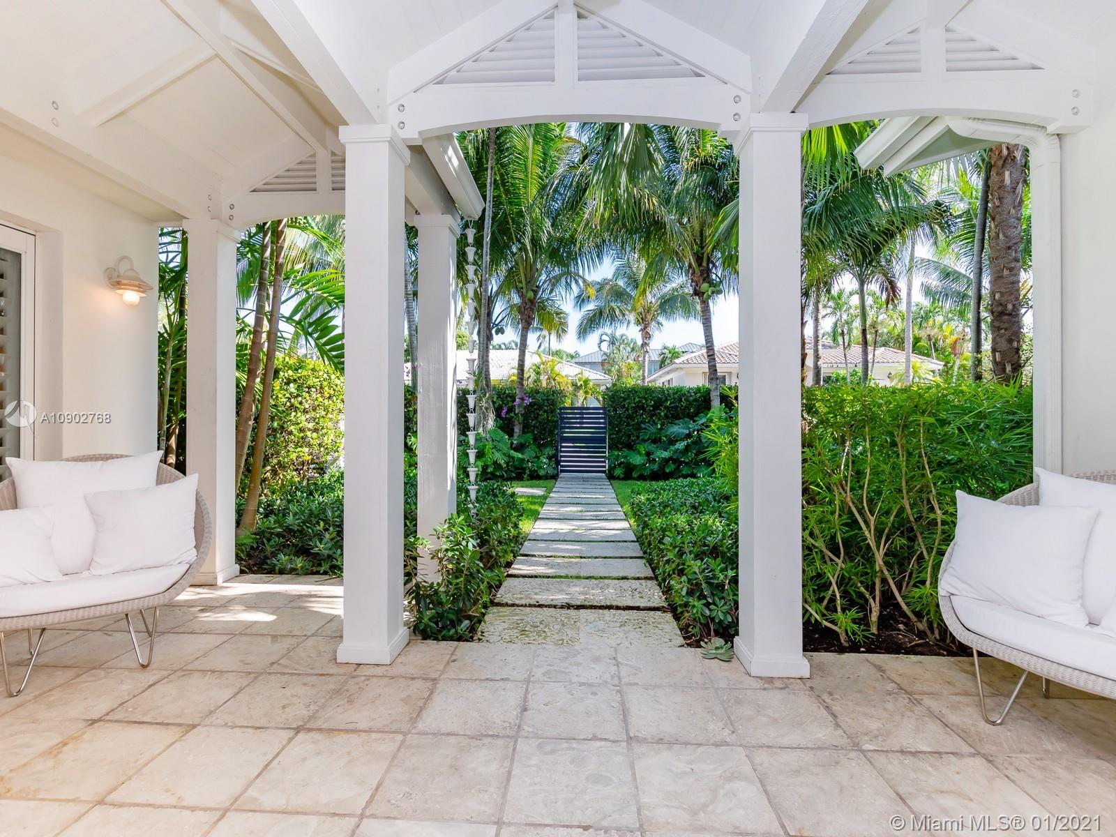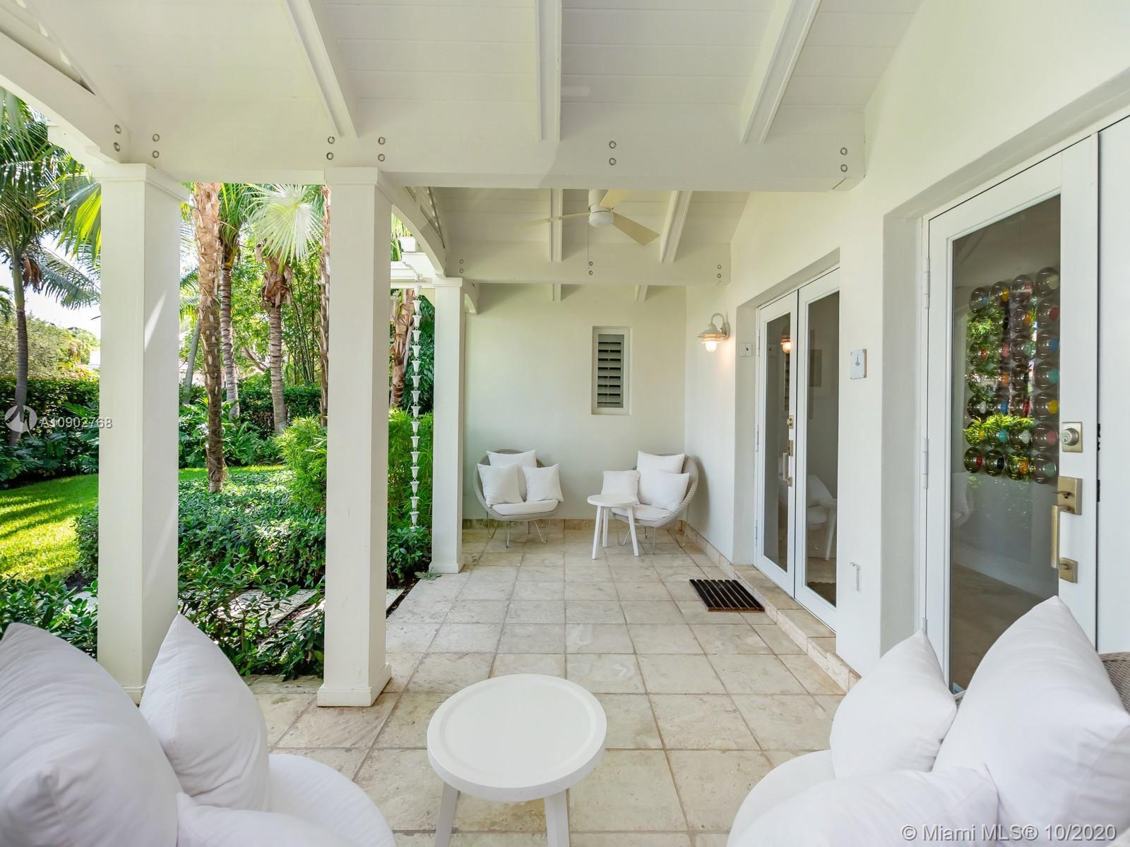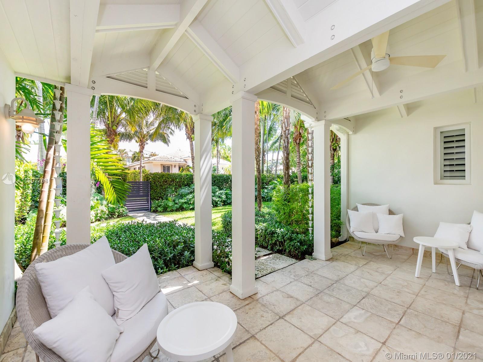 Palm beach chic garden style home with covered front porch and flow through views. This 4 bedroom 3 bath residence is unique in its style and vibe. A fabulous cabana style master suite overlooks the tropical garden and spa quality pool. A covered porch opens into a great room, dining, and family rooms. A white cook's kitchen overlooks a custom-designed pool with water features and private garden setting. A large gated yard both front and back allows for family entertaining. Impact glass. One story living at its finest.