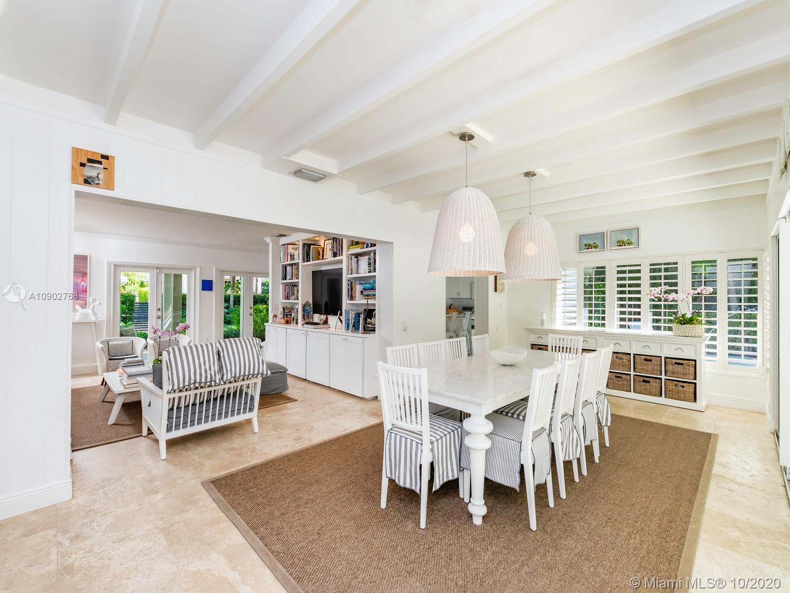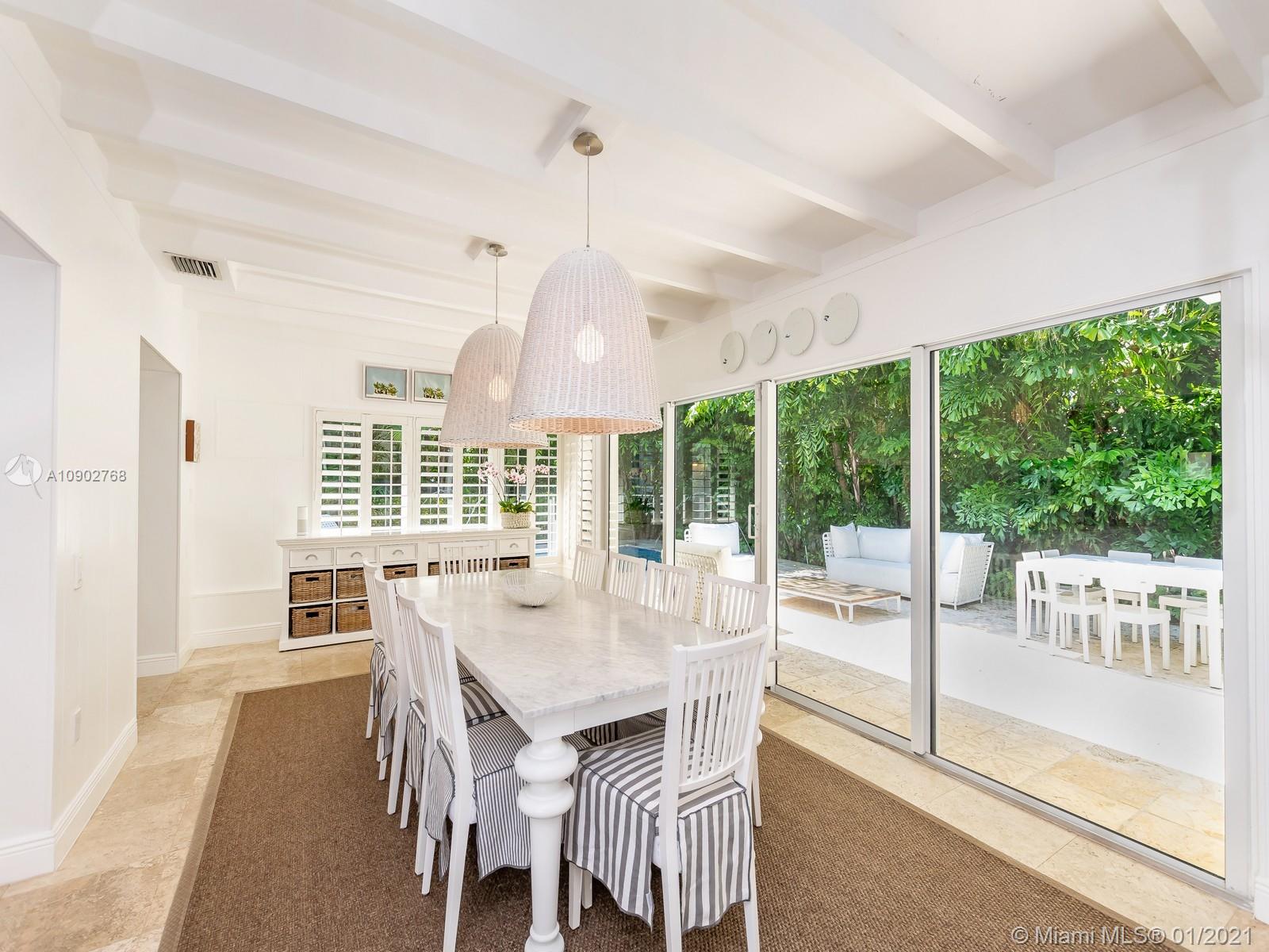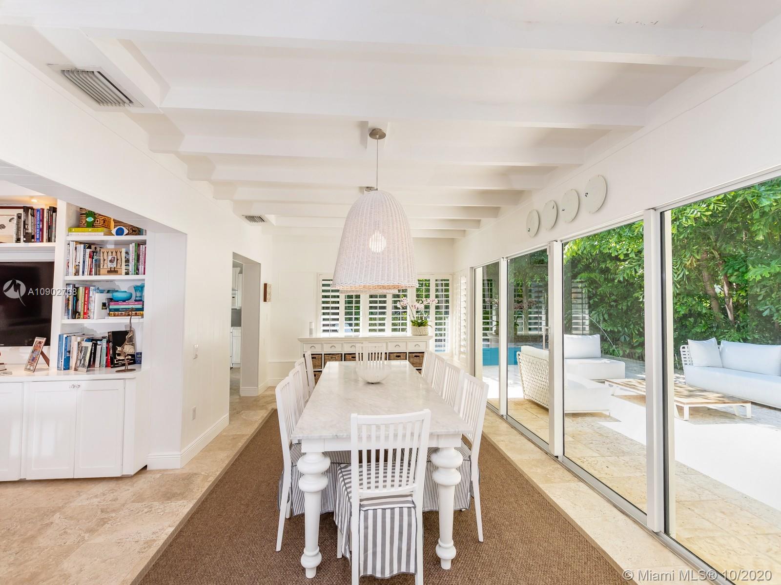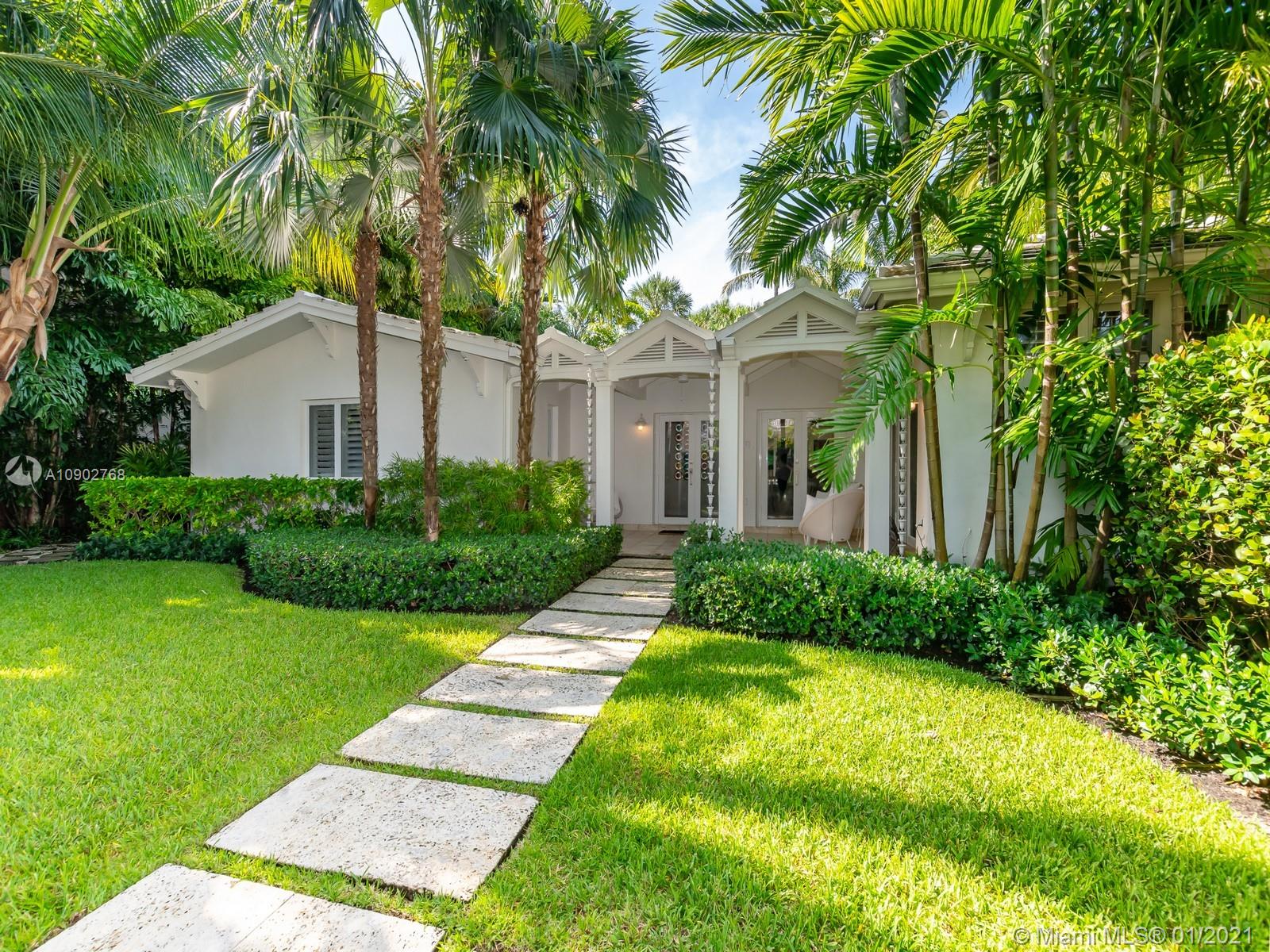 Palm beach chic garden style home with covered front porch and flow through views. This 4 bedroom 3 bath residence is unique in its style and vibe. A fabulous cabana style master suite overlooks the tropical garden and spa quality pool. A covered porch opens into a great room, dining, and family rooms. A white cook's kitchen overlooks a custom-designed pool with water features and private garden setting. A large gated yard both front and back allows for family entertaining. Impact glass. One story living at its finest.