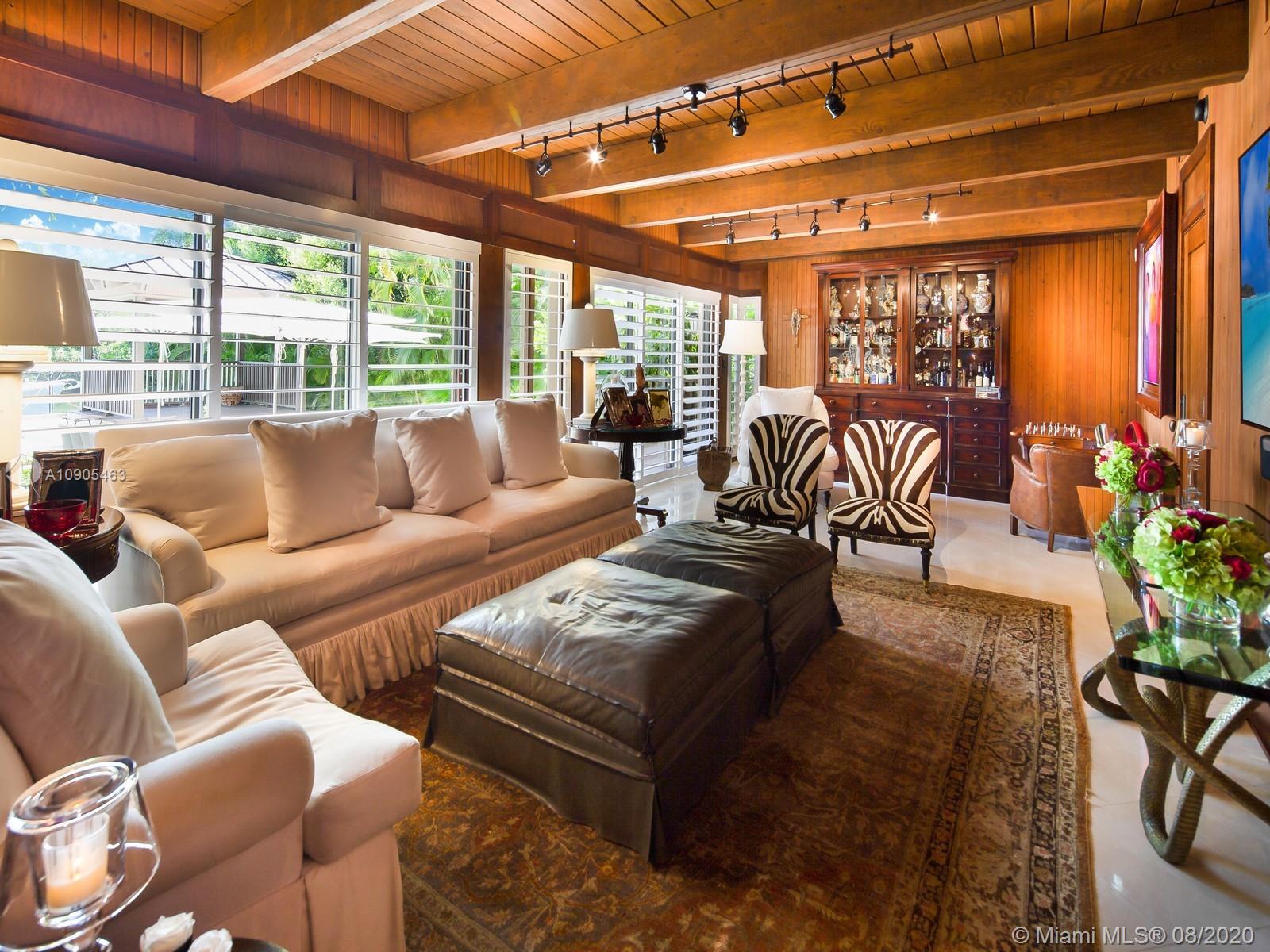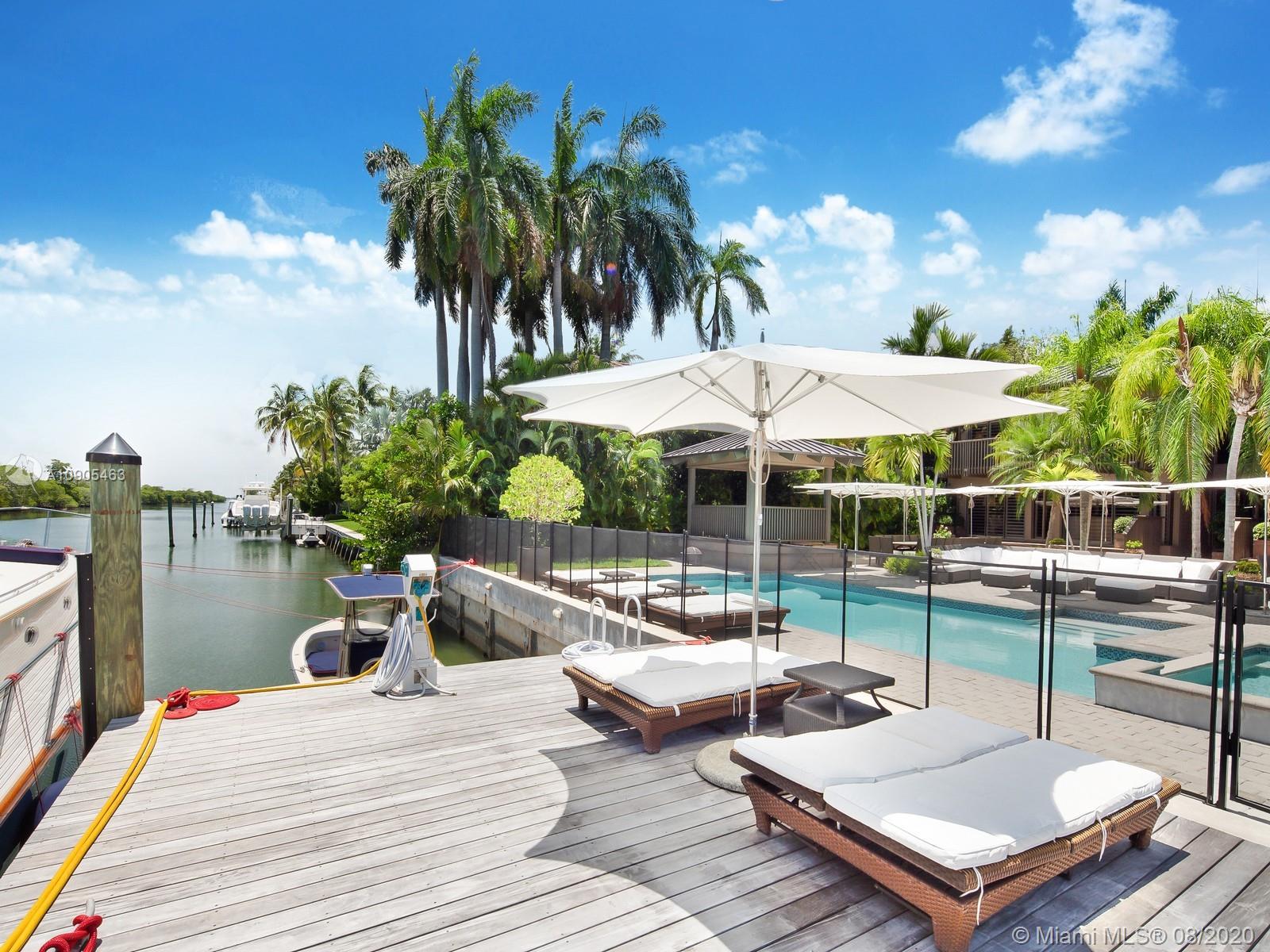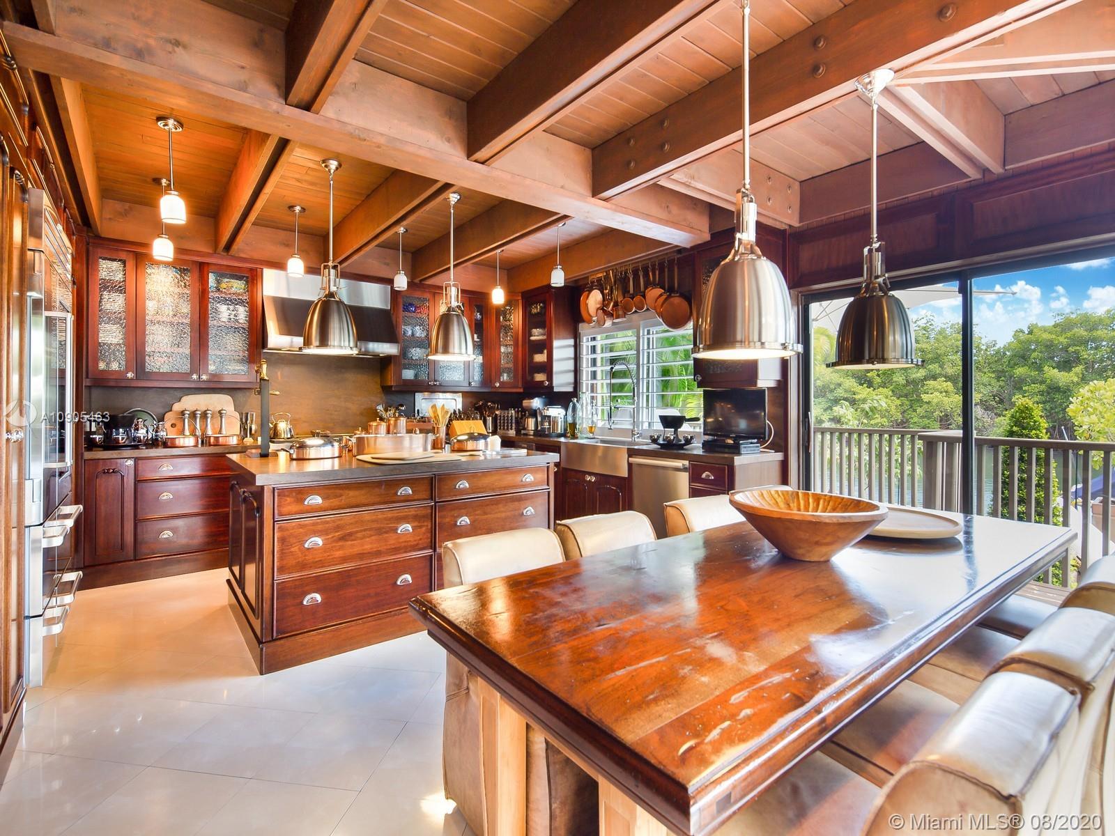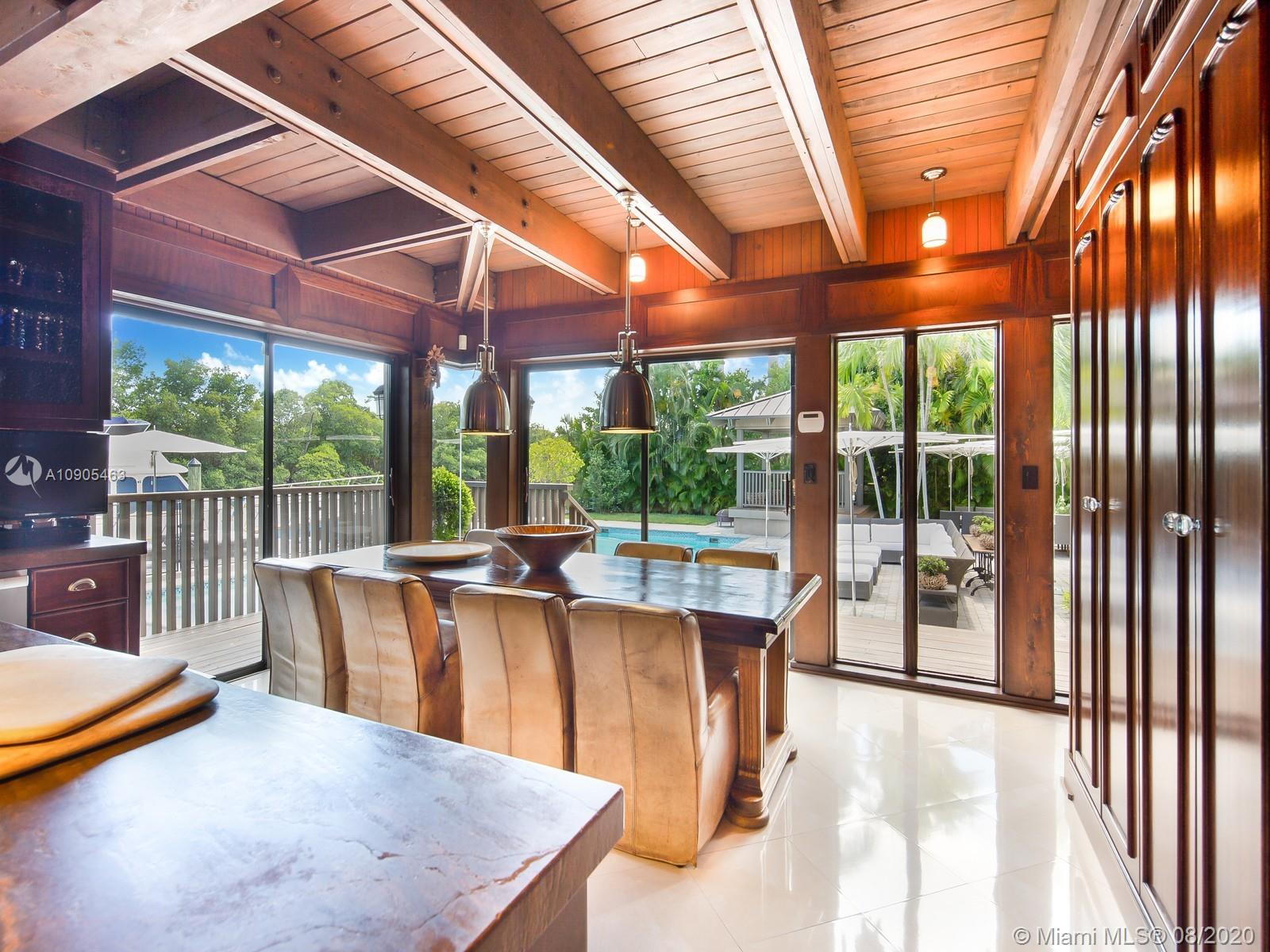 Key Biscayne waterfront in Cape Florida on Pines Canals. Refreshingly scaled for gracious living. This unique custom home designed by architect John Albert Weller features vaulted ceilings throughout, 5 bedrooms 5 full baths 1 powder bath. The understated interiors; all with water views, Gourmet kitchen with Wolfe gas stove, Miele dishwasher, Subzero refrigerator freezer, subzero wine cooler and a subzero ice maker & pantry. The exterior features lush landscaping for privacy with an open layout patio area great for entertaining with a gazebo, pool. The new recently built dock in IPE, can moor a large vessel, has a sun deck, new piles, fortified seawall, no bridges to bay the waterfrontage is 100 ft the lot is over 17,000 sq feet. This rustic home is one of a kind.
