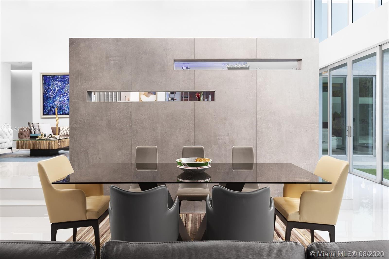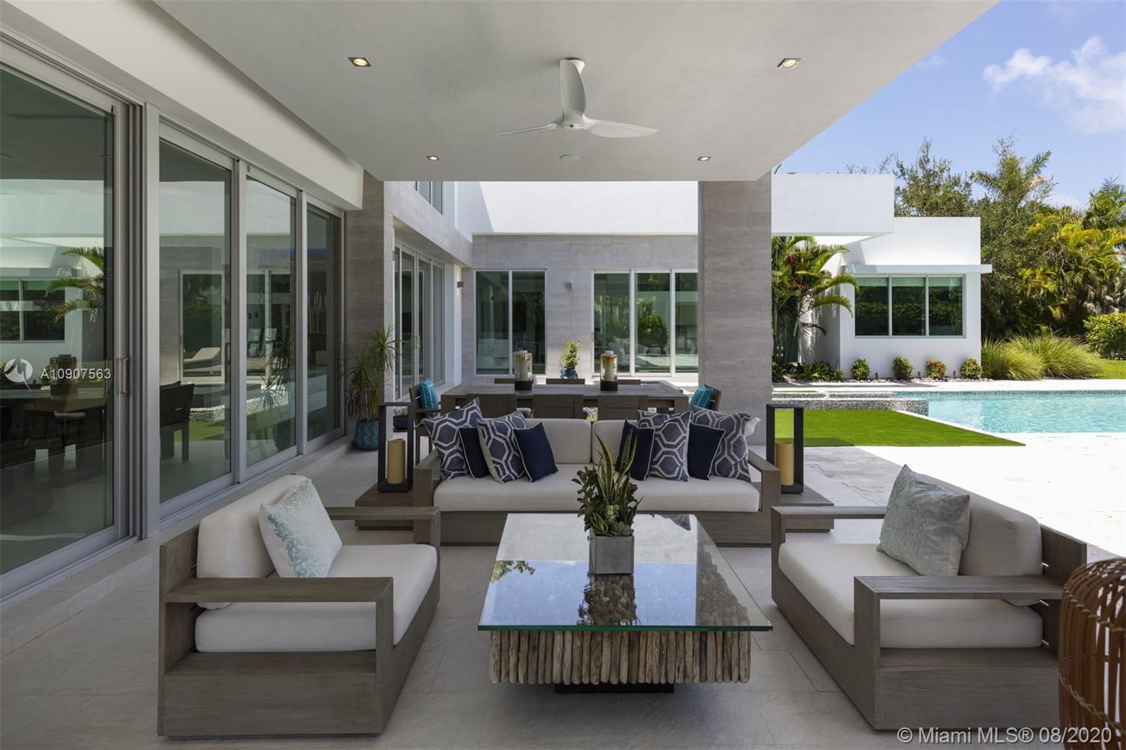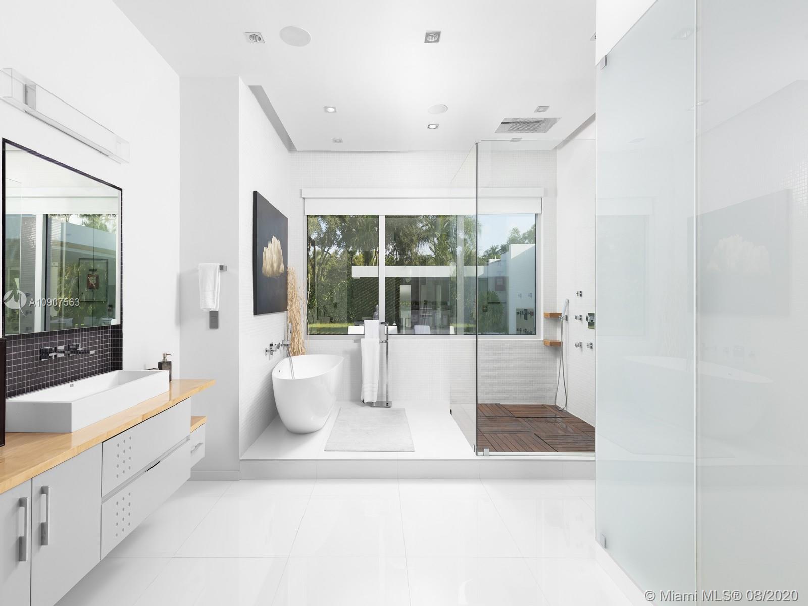 Gorgeous 1-story modern estate inspired by European architecture & located in sought after N. Pinecrest at the end of a quiet cul-de-sac street. This spectacular estate is nested on an acre lot & surrounded by immaculate custom landscaping. Impressive entry w/high ceilings allowing for abundance of natural light to radiate throughout every angle, expansive formal living room & dining overviewing resort style pool, jacuzzi & deep backyd. Designer Kitchen w/Quartz countertops, gas slide in range, Subzero refrigerators & Wolf appl. Lavish master suite offers walk-in closet, pool access, Zen master bath w/floating tub, Teak shower flr & separate steam shower. Extra Feat: Detached home office w/ Cabana bath, storage rm, summer kitchen, 26 solar panels, imp win/drs & 2 car gar + carport.