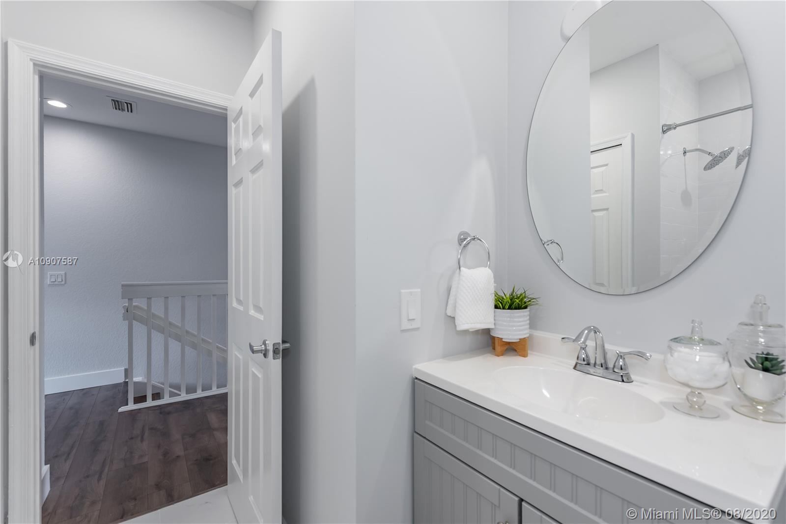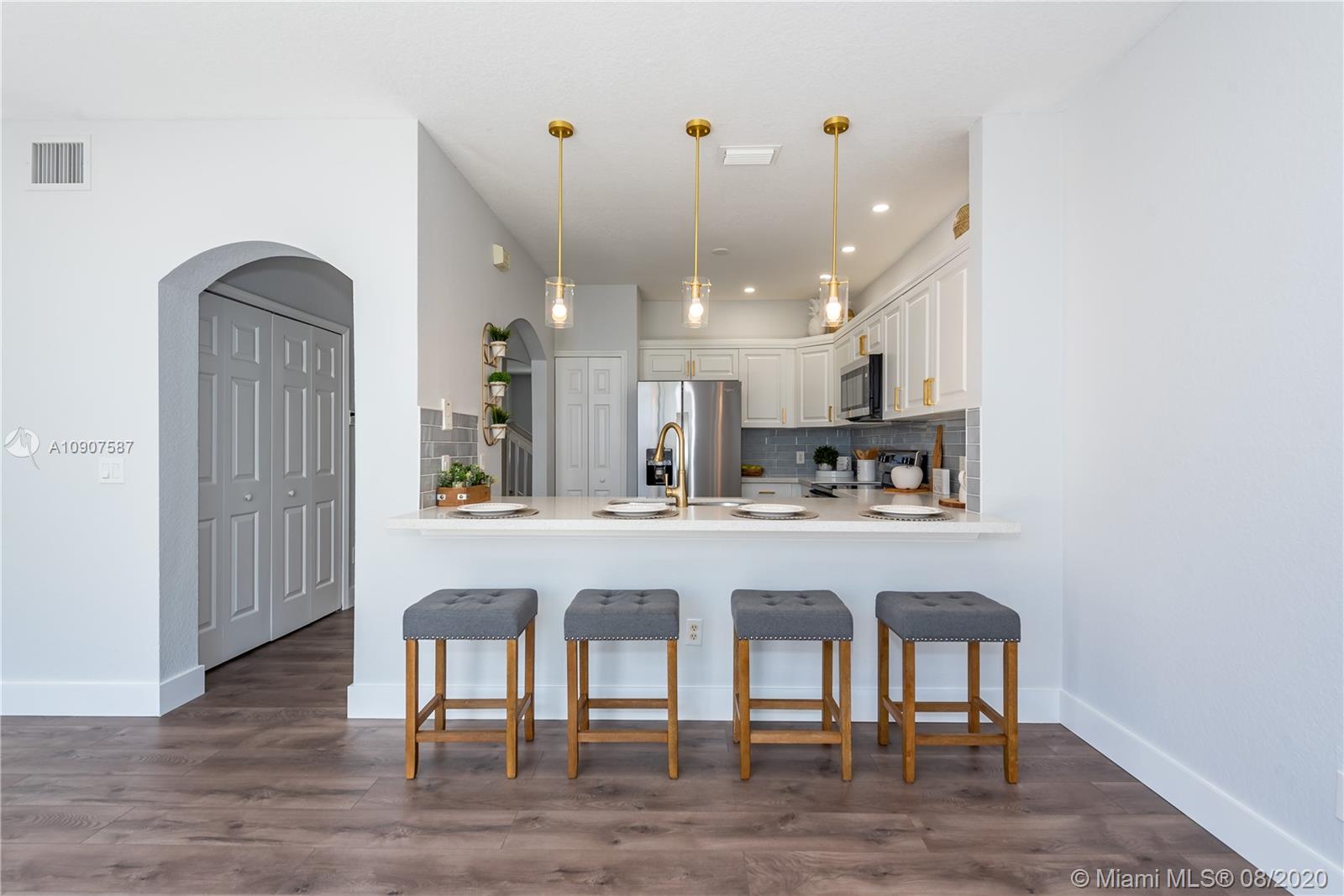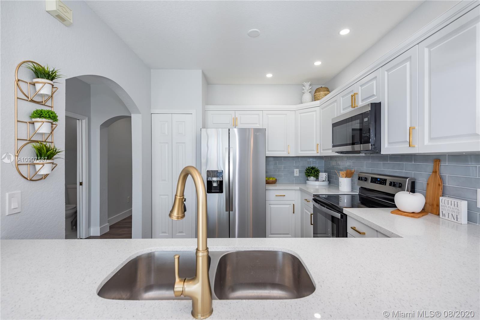 Most beautiful townhouse in Villas at Nautica! This gorgeous, charming and bright two-story townhouse in Miramar would welcome you upon entering the front door. Spacious living room and beautifully remodeled kitchen with new stainless steel appliances and large counter quartz kitchen table. 3 bedrooms and 2 1/2 beautiful modern bathrooms fitted with new vanities. Fenced backyard, hurricane shutters and wonderful new wood floors throughout the property. Remodeled with a tasteful design. Modern brushed gold finishes in the kitchen and guest bath. Located in a gated community with 24 hrs security, clubhouse with large pool, kids pool, gym, children's playground. Near Grade A schools, plazas, regional parks and minutes from all major roads and highways.