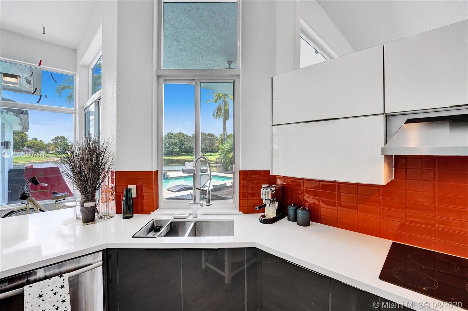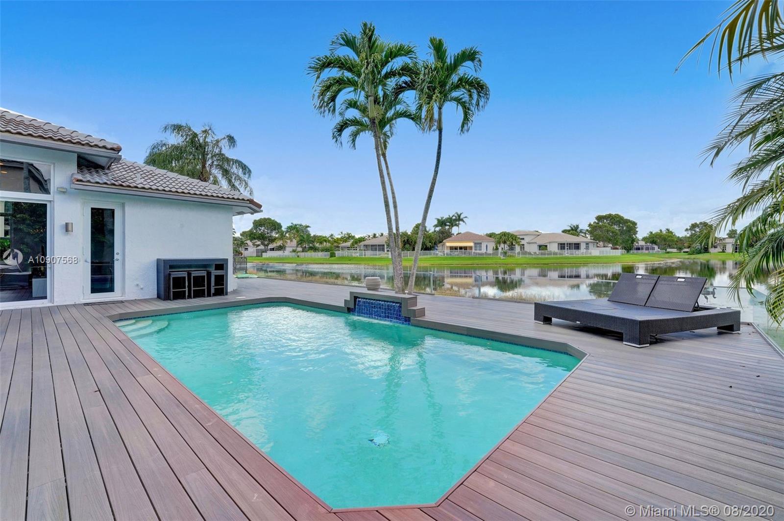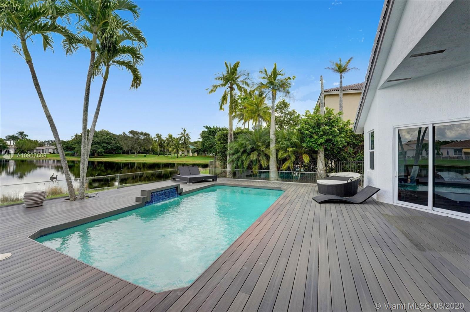 YOU FOUND IT! Weston Hills priced to sale one story home on a waterfront premium lot. Originally used as a developer's model home and as a vacation home since it was remodeled from top to bottom in 2018. 5 bed/4 bath on a triple split floor plan with amazing water views and 3 car garage. The gorgeous open concept kitchen features a huge custom made white quartz double counter top and modern white/grey dual tone cabinets complemented by a glass orange back splash. New waterproof flooring in the entire house and the bathrooms featuring no step down walk-in showers, main bath with double ceiling shower heads and barn glass shower door. Prepare to be amazed with a unique style pool deck made with maintenance free engineered wood and resort style glass perimeter fence. Impact windows and doors