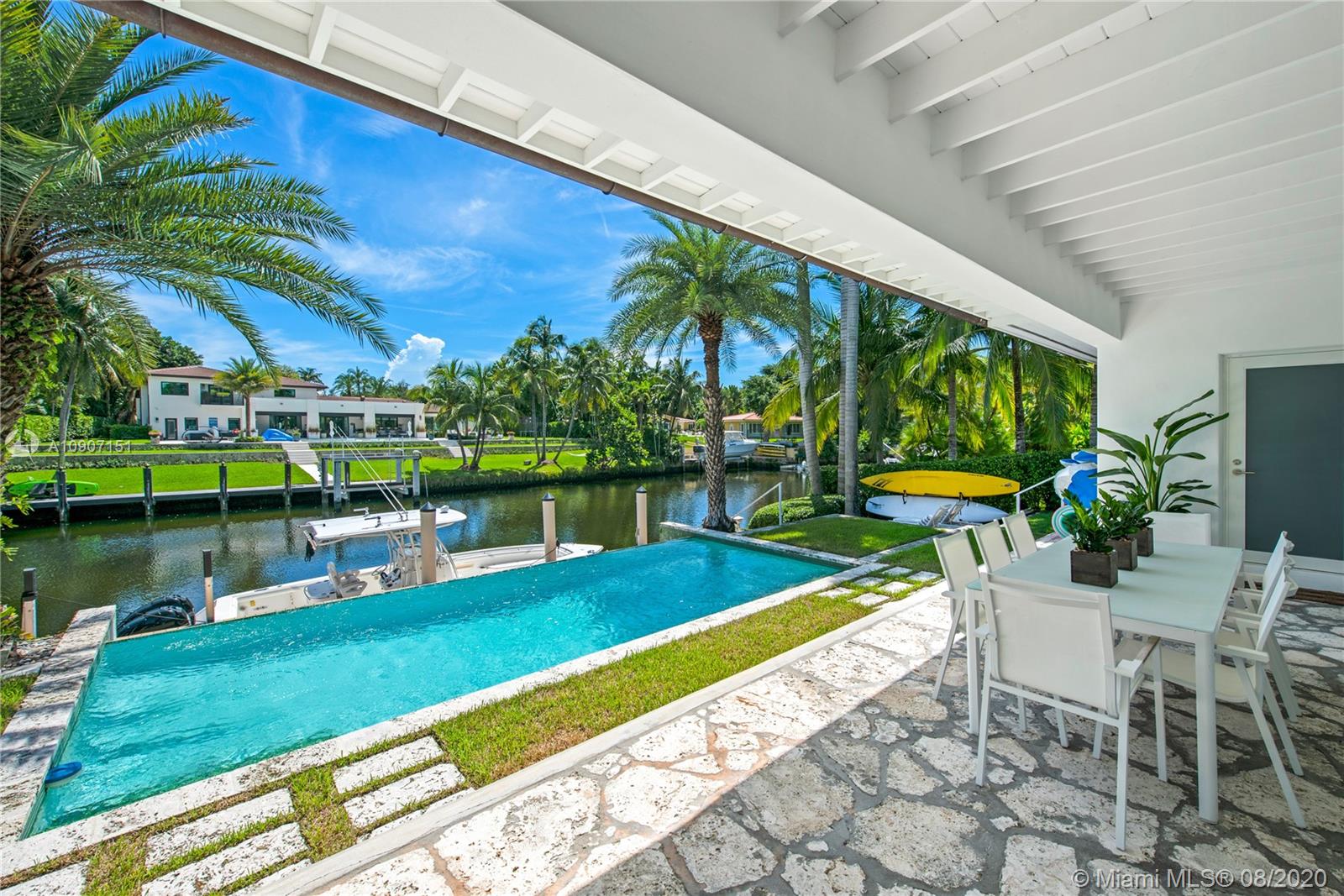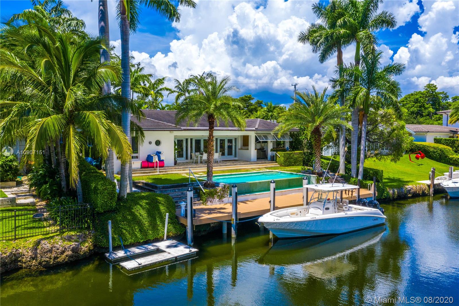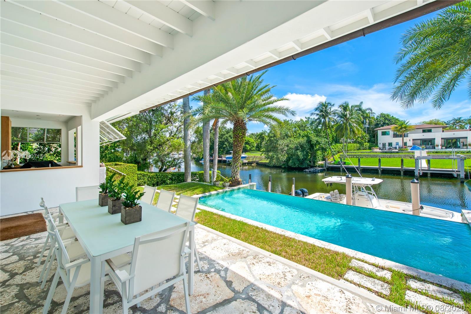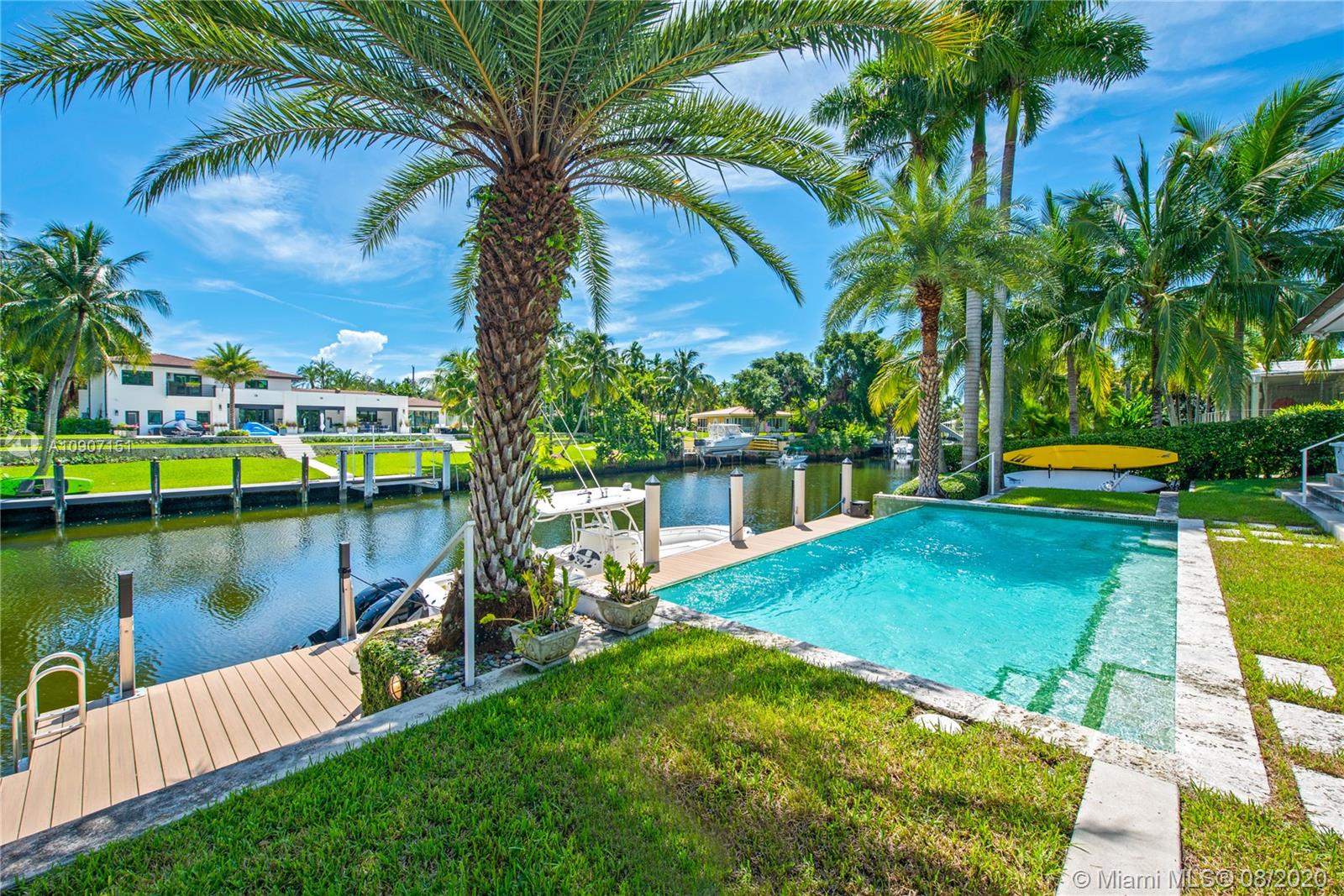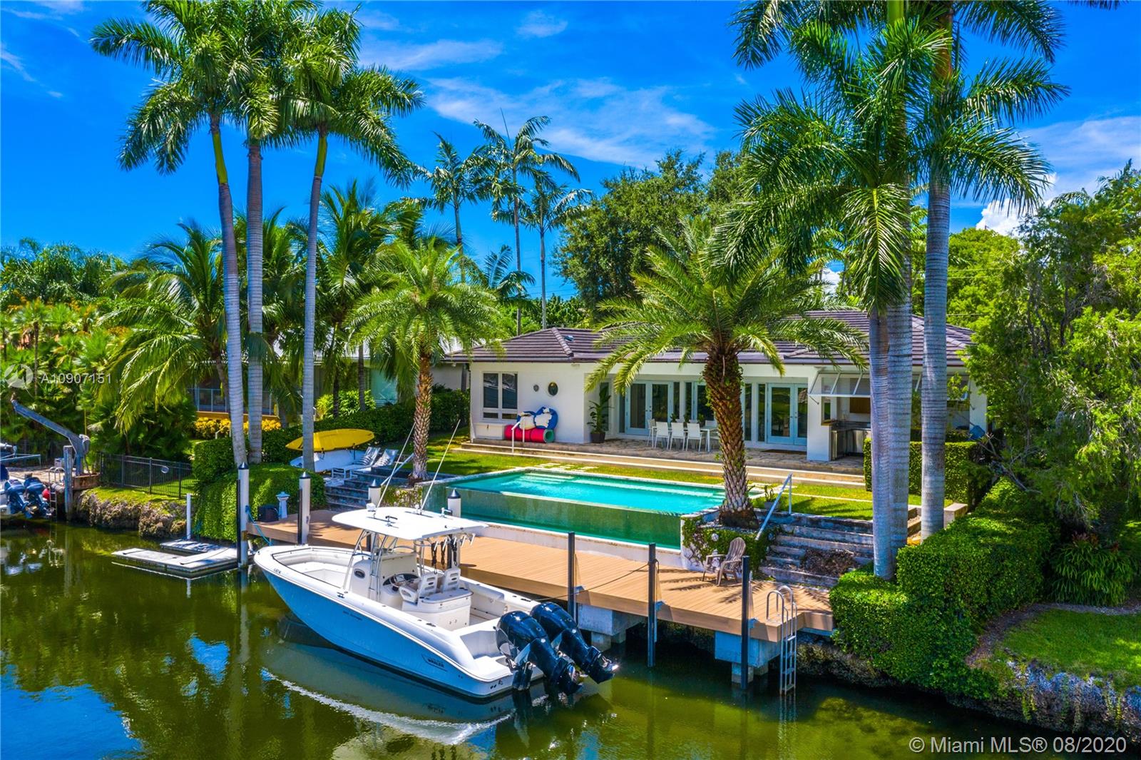 The waterfront home you’ve been waiting for is now available! Situated on a wide portion of the Mahi waterway in the South Gables, this one-story home was beautifully updated indoors and out. An open concept floorplan allows for water views from almost every room in the house, maximizing enjoyment of the waterfront lifestyle. A new kitchen features large chef’s island, custom cabinetry & Thermador appliances, including a gas stove. Wall-to-wall glass doors open to the covered patio, built-in summer kitchen and sparkling infinity pool that appears to flow right into the canal. 3 bedrooms & 3 full bathrooms, including a master suite w/private sitting room overlooking the water. Brand new dock with concrete caps to accommodate a boat lift, impact windows & doors throughout, 2 car garage.
