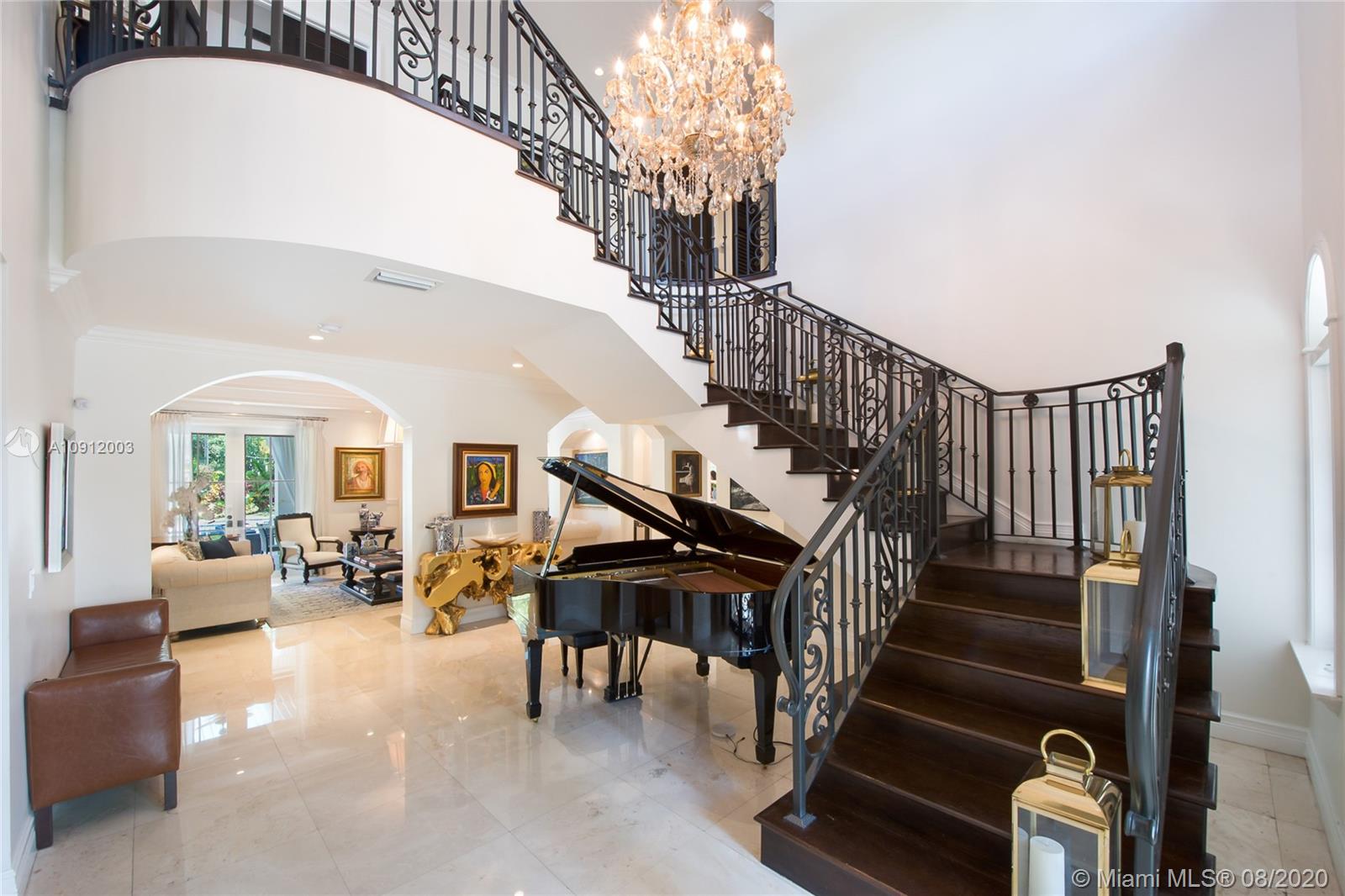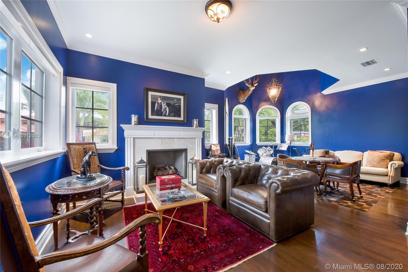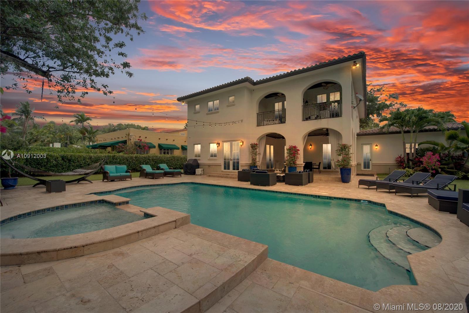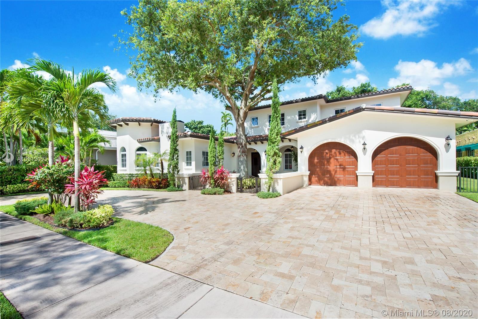 Spectacular one of a kind Home in the Heart of the Gables. Rare Opportunity to own this Gem on a huge triple lot. House boasts a beautiful courtyard entrance centered around a grand oak, circular driveway,2 car garage.Features 6 bedrooms, 6 and a half bath including a large downstairs den/office/media w/fireplace. Marble floors throughout & wood floors in bedrooms. Master suite upstairs w/2 large walk in closets, spacious bath suite & covered terrace overlooking the pool. Kitchen equip w/ Top of the line appliances include Wolf & Miele, oversized island & quartz countertops. Includes a Crestron sound system throughout, impact windows & doors, and grand ceilings. Formal dining room, family & living room that open out to covered terrace & pool. Built in 2015