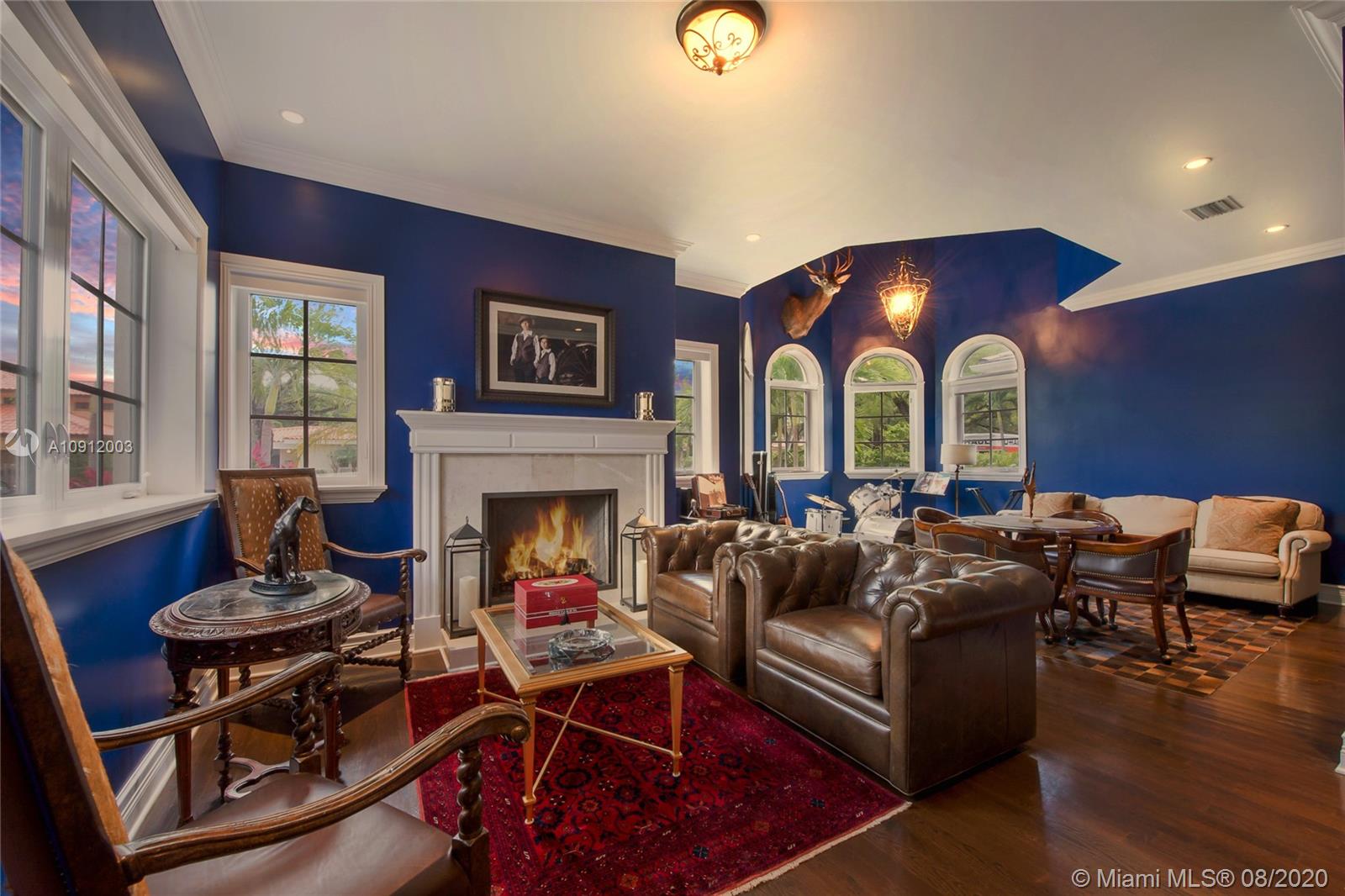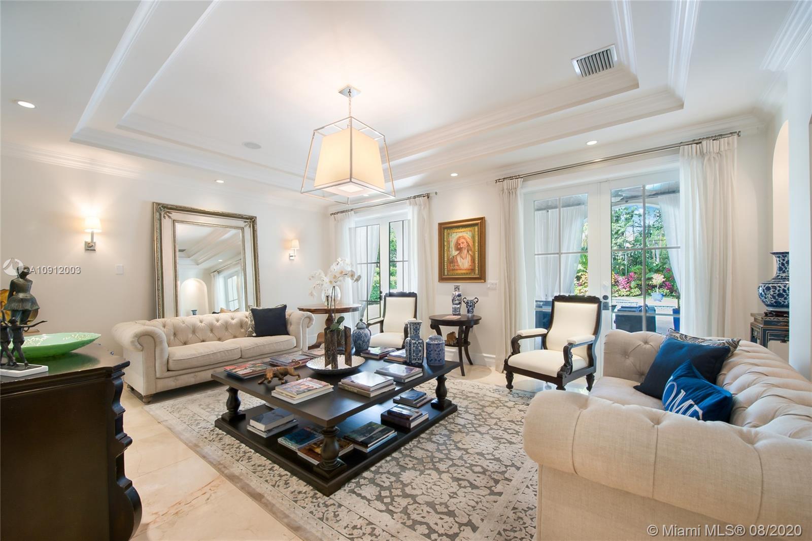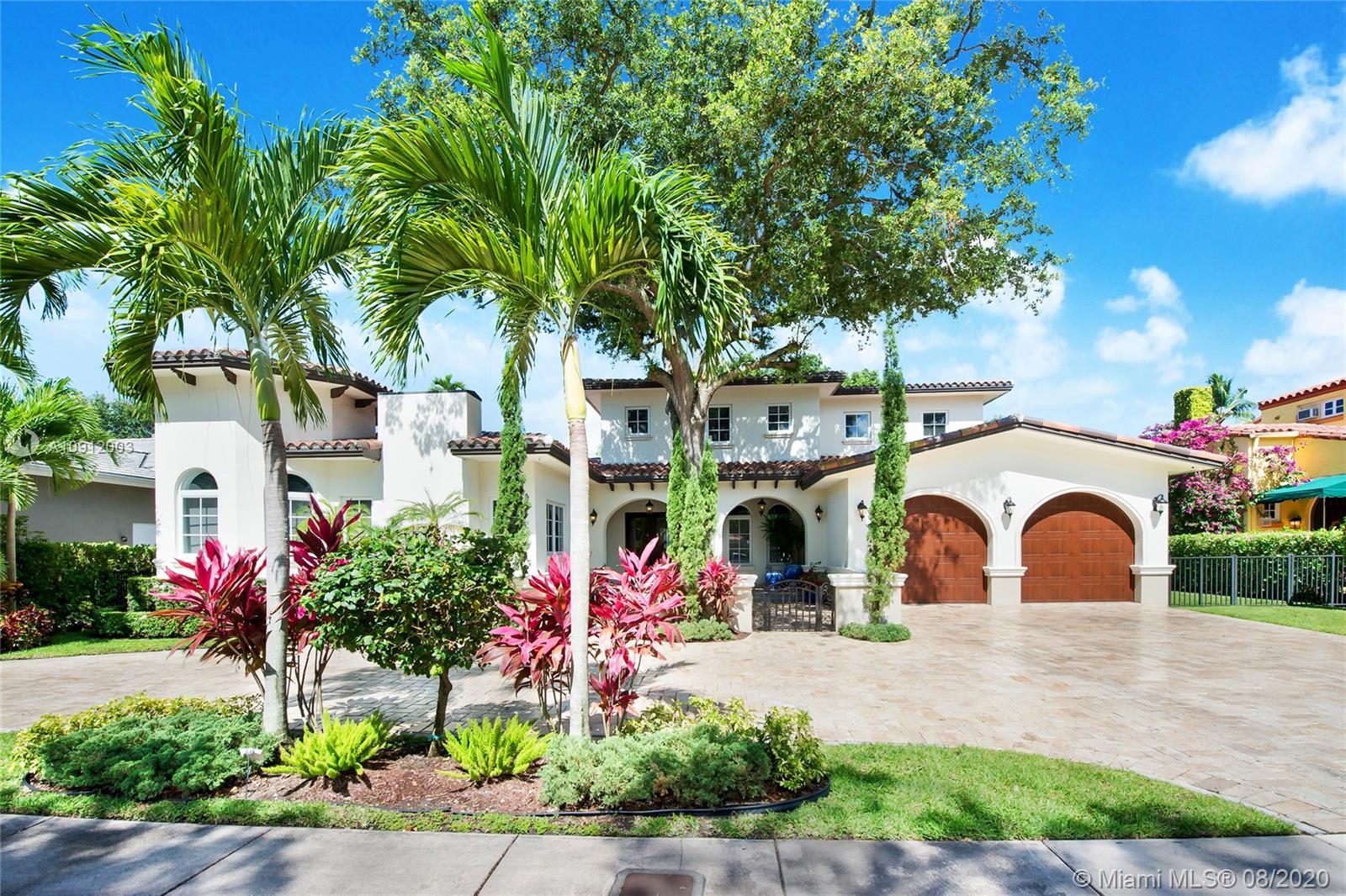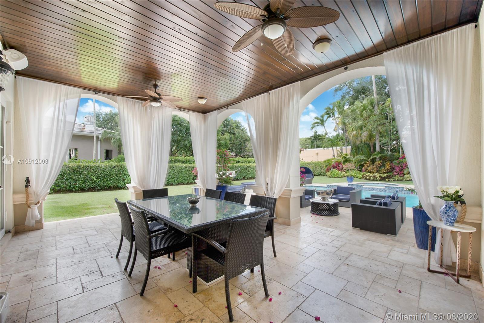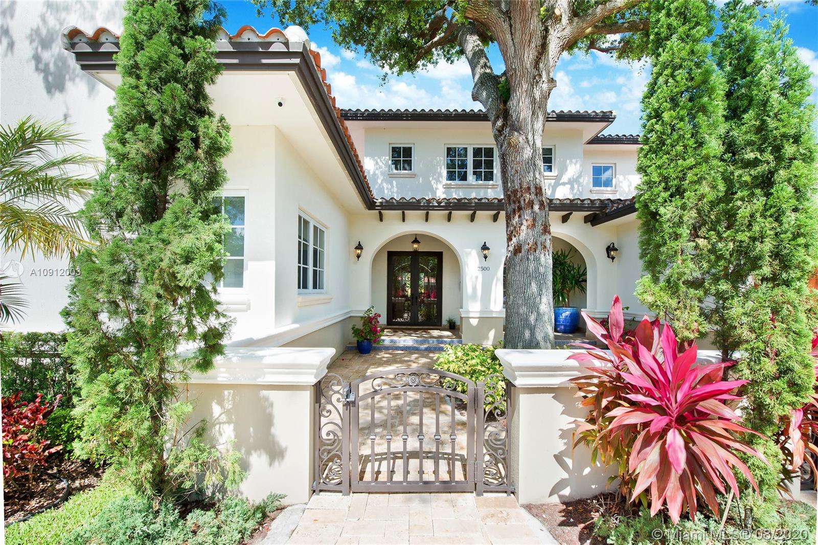Spectacular one of a kind Home in the Heart of the Gables. Rare Opportunity to own this Gem on a huge triple lot. House boasts a beautiful courtyard entrance centered around a grand oak, circular driveway,2 car garage.Features 6 bedrooms, 6 and a half bath including a large downstairs den/office/media w/fireplace. Marble floors throughout & wood floors in bedrooms. Master suite upstairs w/2 large walk in closets, spacious bath suite & covered terrace overlooking the pool. Kitchen equip w/ Top of the line appliances include Wolf & Miele, oversized island & quartz countertops. Includes a Crestron sound system throughout, impact windows & doors, and grand ceilings. Formal dining room, family & living room that open out to covered terrace & pool. Built in 2015