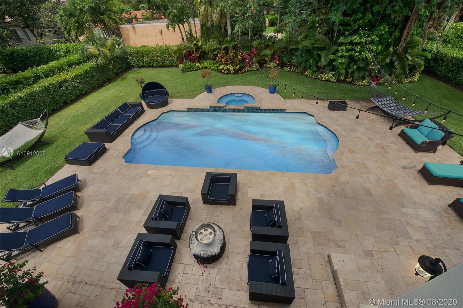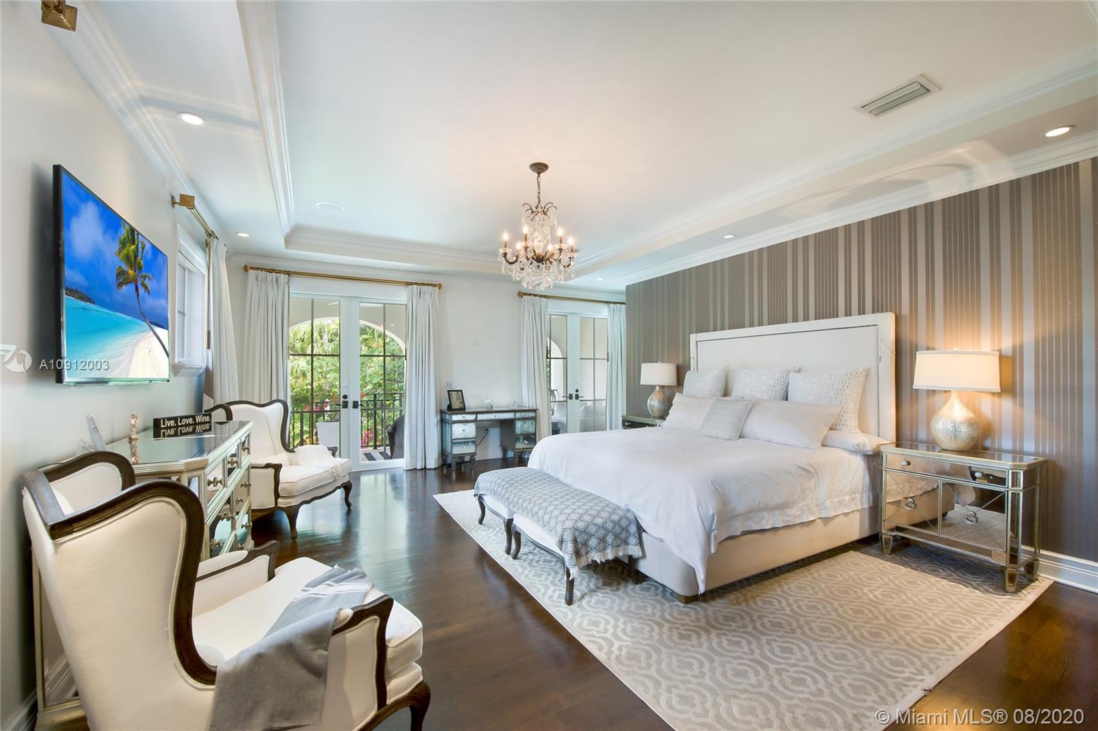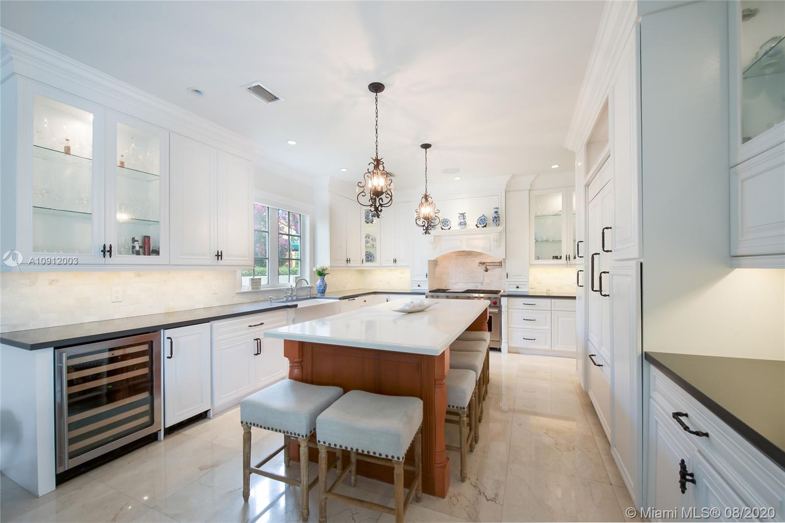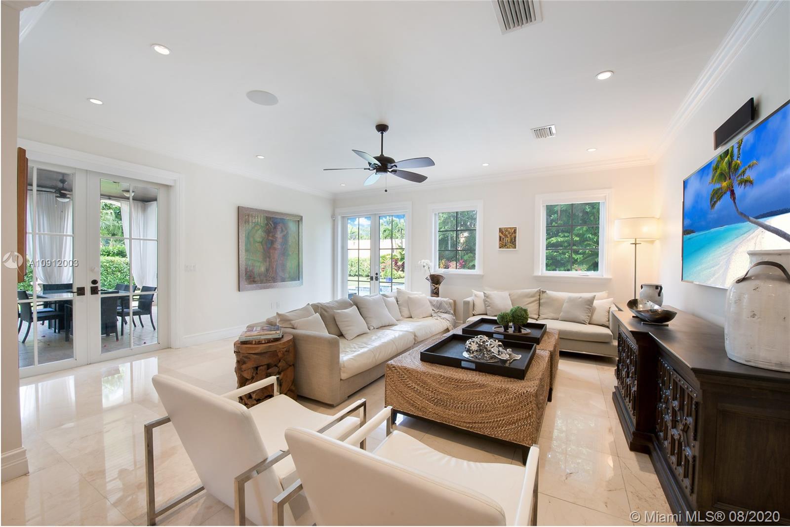 Spectacular one of a kind Home in the Heart of the Gables. Rare Opportunity to own this Gem on a huge triple lot. House boasts a beautiful courtyard entrance centered around a grand oak, circular driveway,2 car garage.Features 6 bedrooms, 6 and a half bath including a large downstairs den/office/media w/fireplace. Marble floors throughout & wood floors in bedrooms. Master suite upstairs w/2 large walk in closets, spacious bath suite & covered terrace overlooking the pool. Kitchen equip w/ Top of the line appliances include Wolf & Miele, oversized island & quartz countertops. Includes a Crestron sound system throughout, impact windows & doors, and grand ceilings. Formal dining room, family & living room that open out to covered terrace & pool. Built in 2015