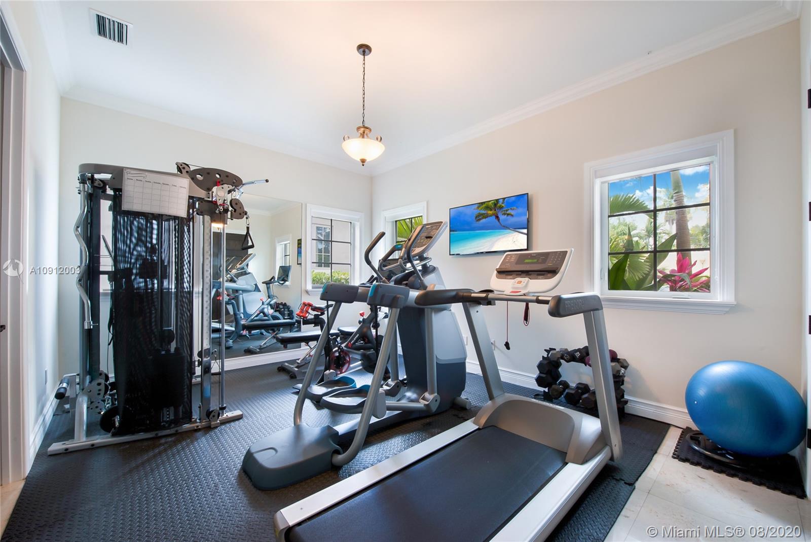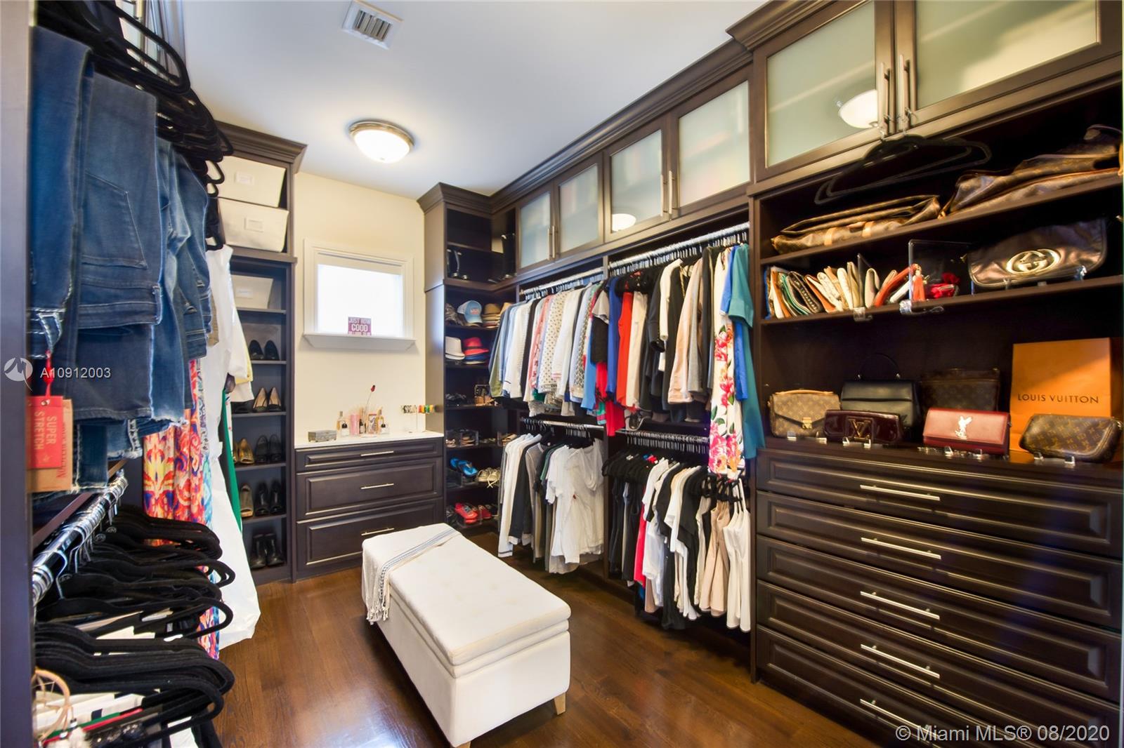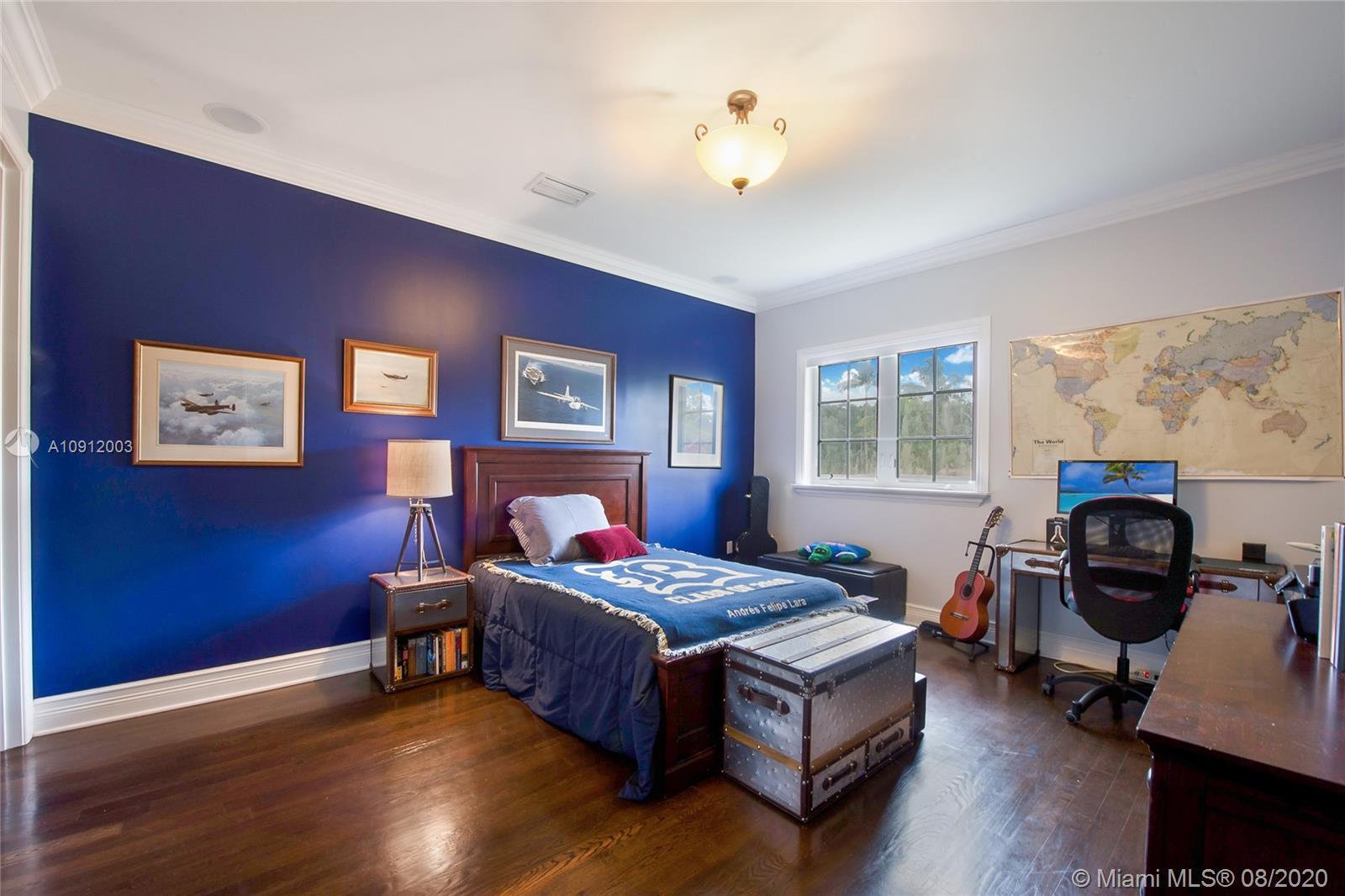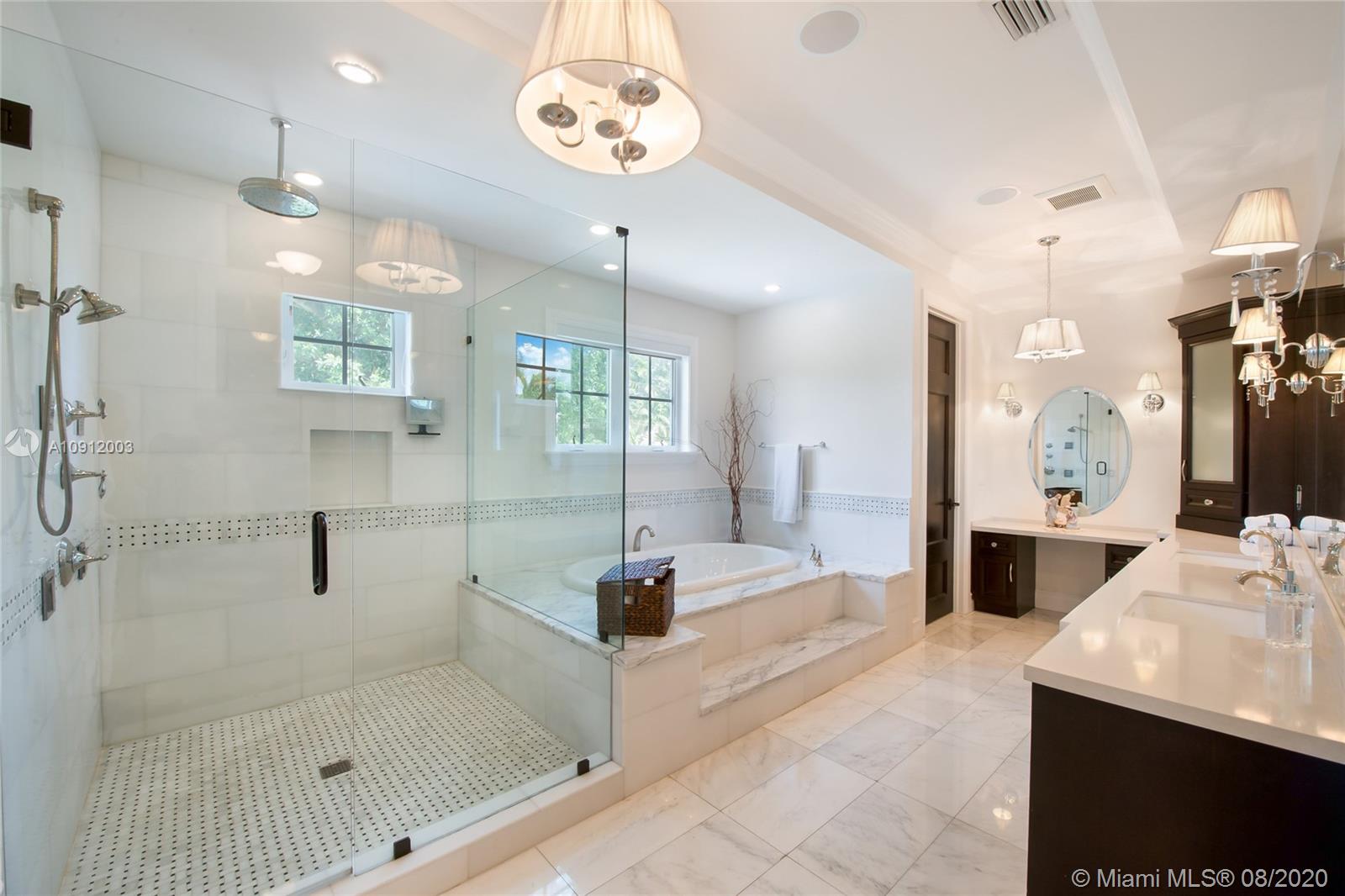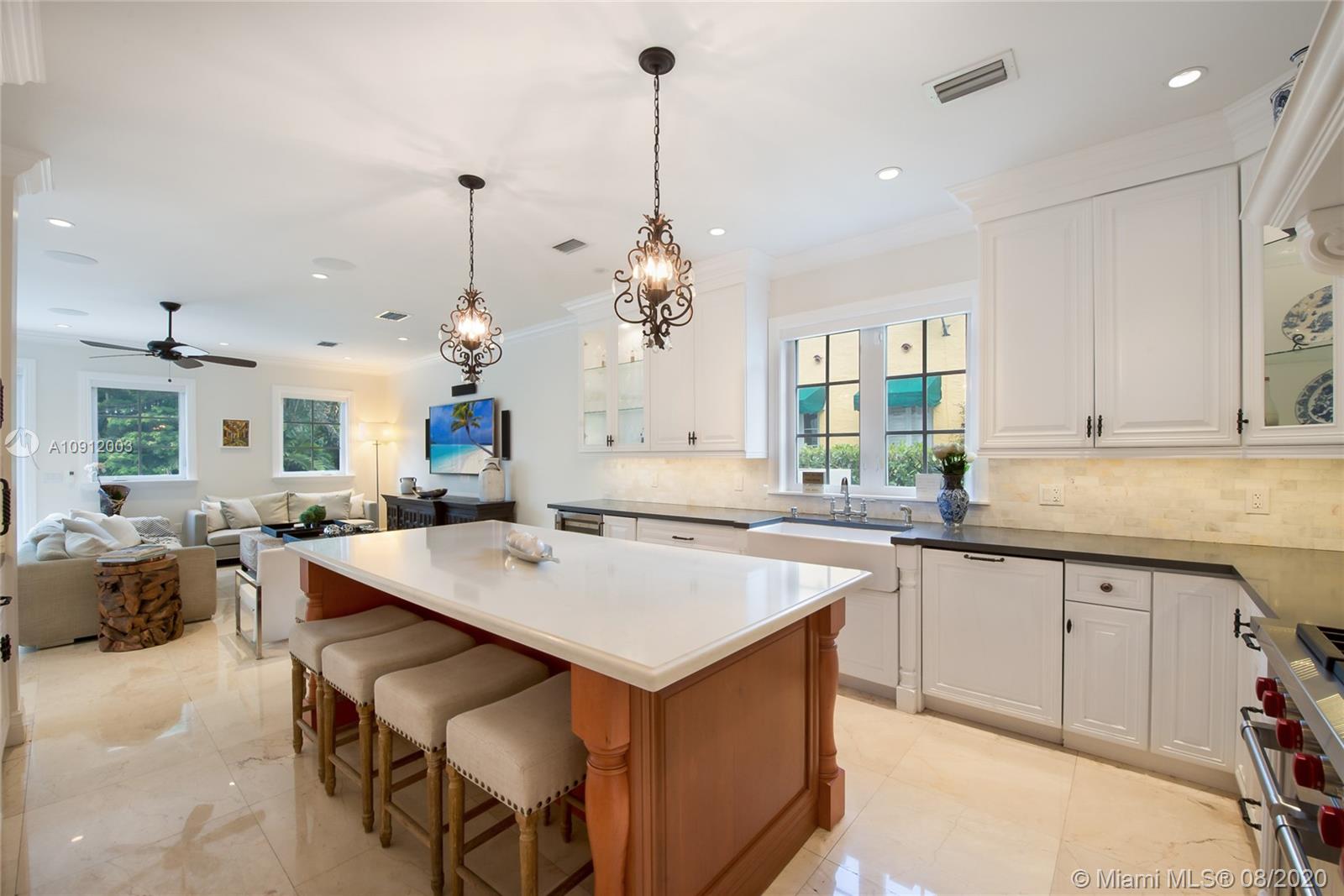 Spectacular one of a kind Home in the Heart of the Gables. Rare Opportunity to own this Gem on a huge triple lot. House boasts a beautiful courtyard entrance centered around a grand oak, circular driveway,2 car garage.Features 6 bedrooms, 6 and a half bath including a large downstairs den/office/media w/fireplace. Marble floors throughout & wood floors in bedrooms. Master suite upstairs w/2 large walk in closets, spacious bath suite & covered terrace overlooking the pool. Kitchen equip w/ Top of the line appliances include Wolf & Miele, oversized island & quartz countertops. Includes a Crestron sound system throughout, impact windows & doors, and grand ceilings. Formal dining room, family & living room that open out to covered terrace & pool. Built in 2015