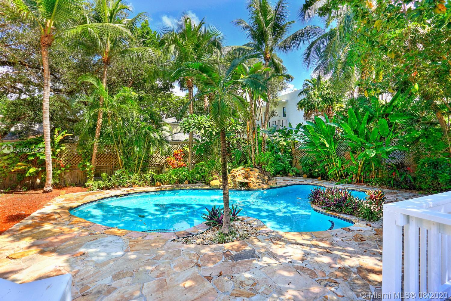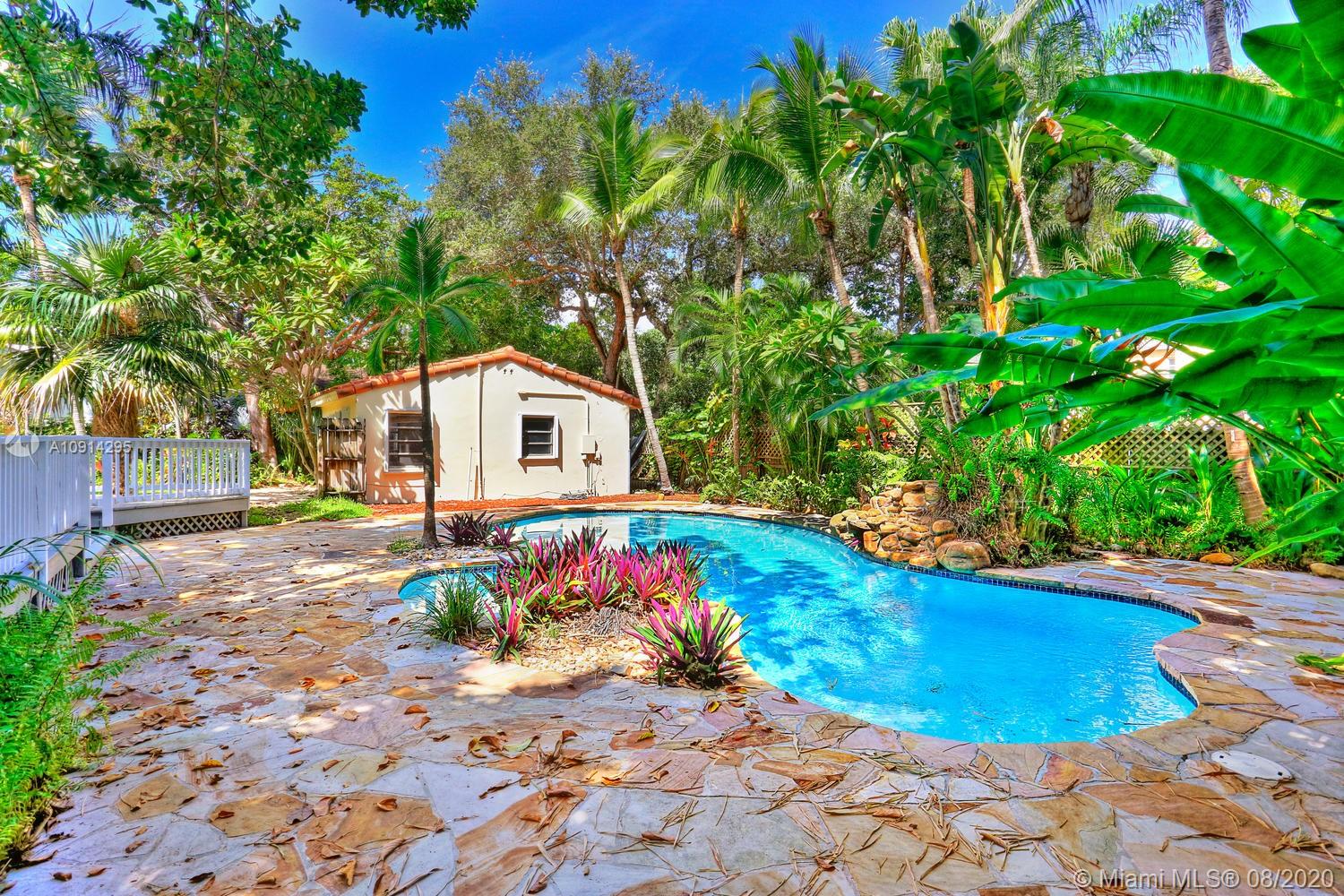 Lovely gated home on a quiet tree-lined street surrounded by a 10,339 SF garden with palms & shade trees. Located just a short walk or bike ride to bayfront parks & marinas and close to the Grove village center’s galleries, boutiques & cafes. Light-filled living spaces with beautiful hardwood floors, fireplace & vaulted ceilings. Updated custom kitchen features wood cabinetry, granite countertops & stainless appliances. 2BR/2BA main house + separate 1BR/1BA guest house w/ kitchenette. Ultra-private, tropical backyard with freeform pool, waterfall & expansive wood deck. Ample gated & street parking + room to park a boat. High sea-level elevation ( flood insurance not required ).Minutes to downtown, MIA, Coral Gables, Key Biscayne & the Beaches.