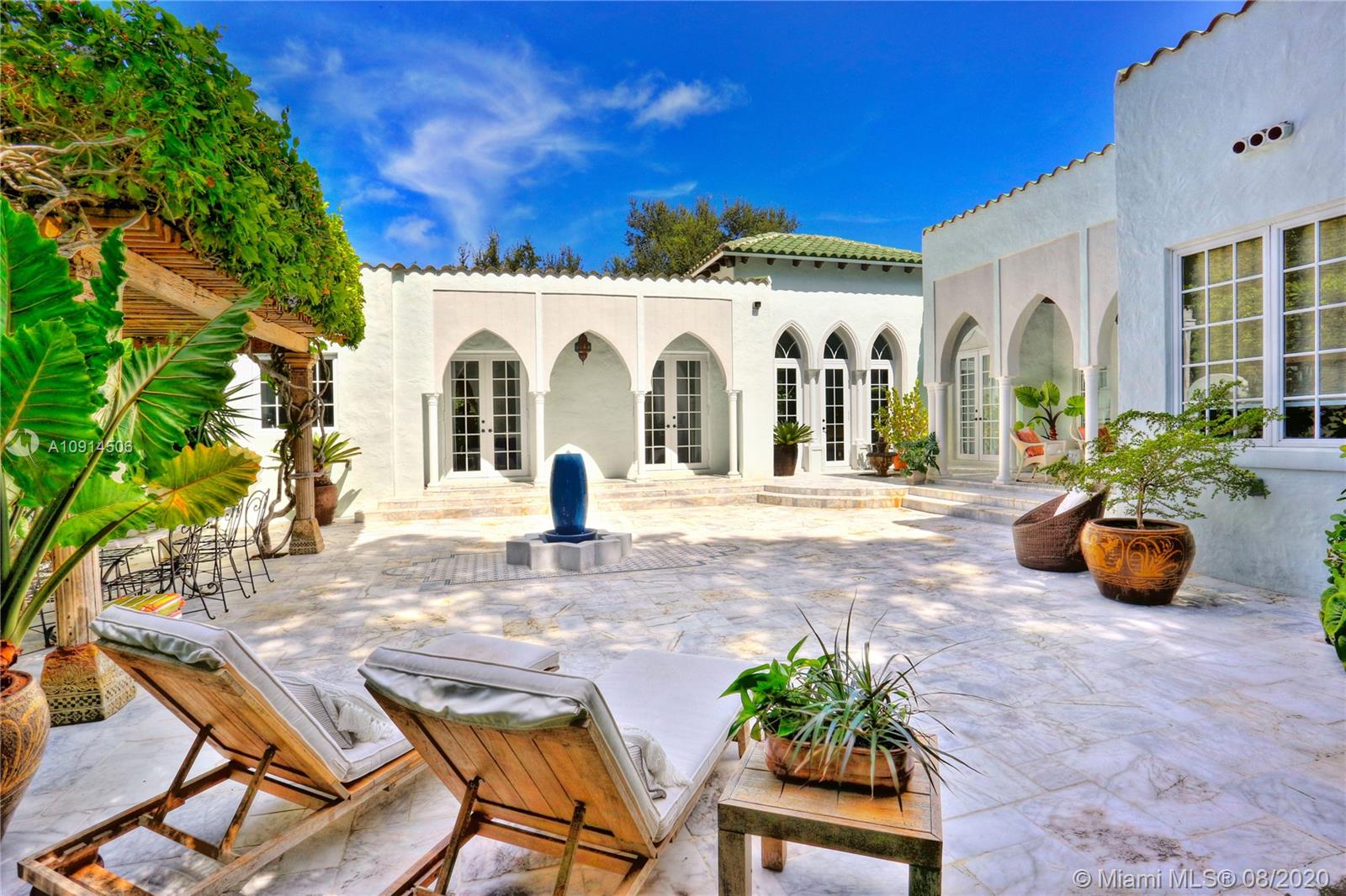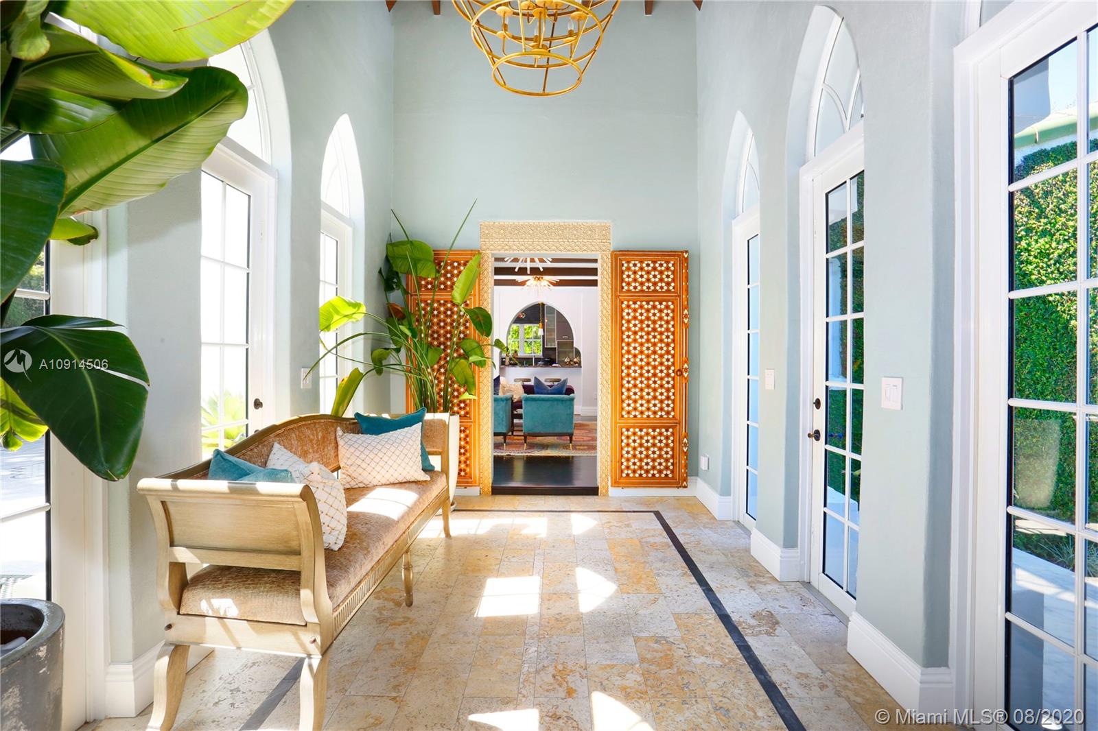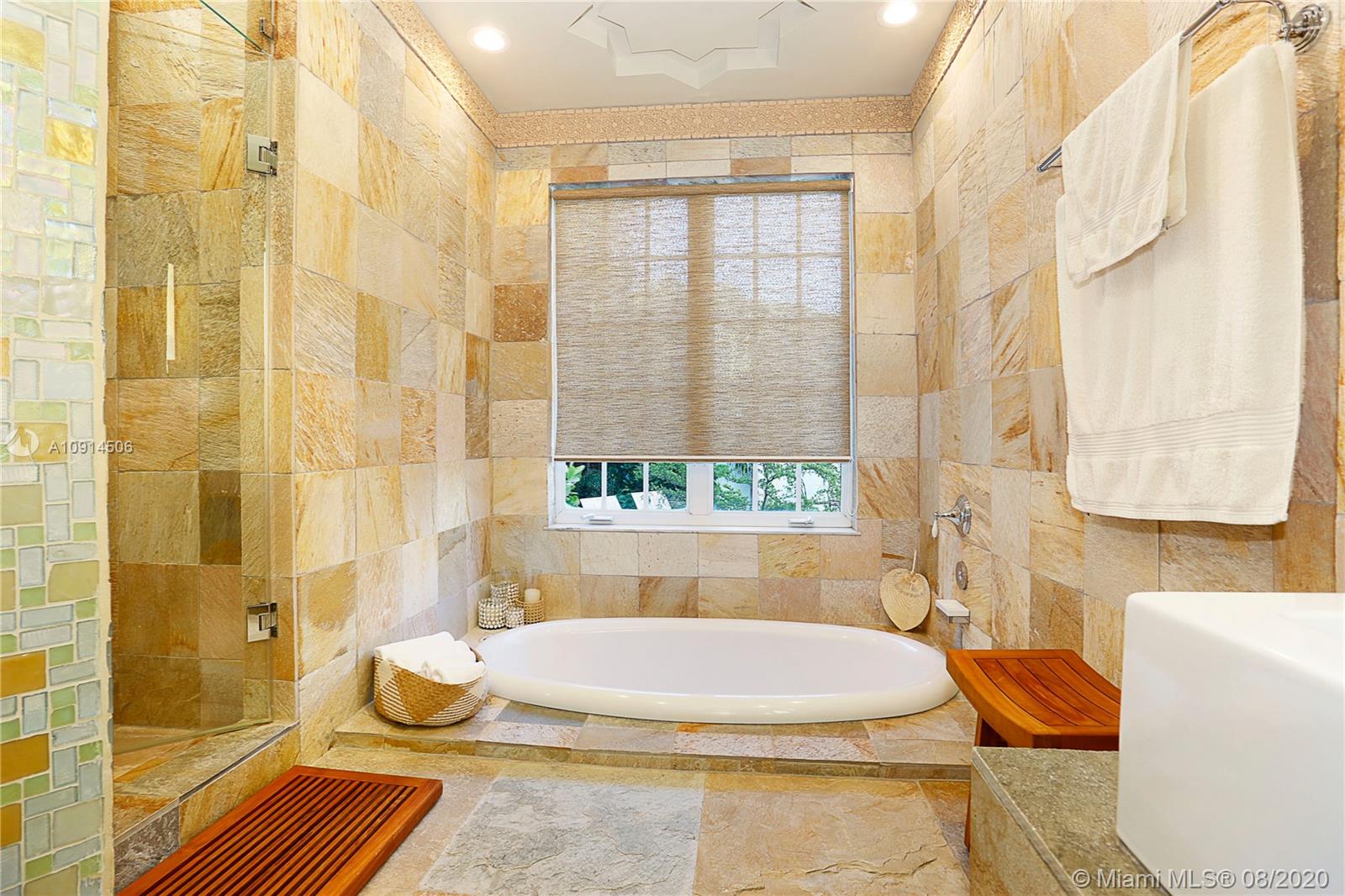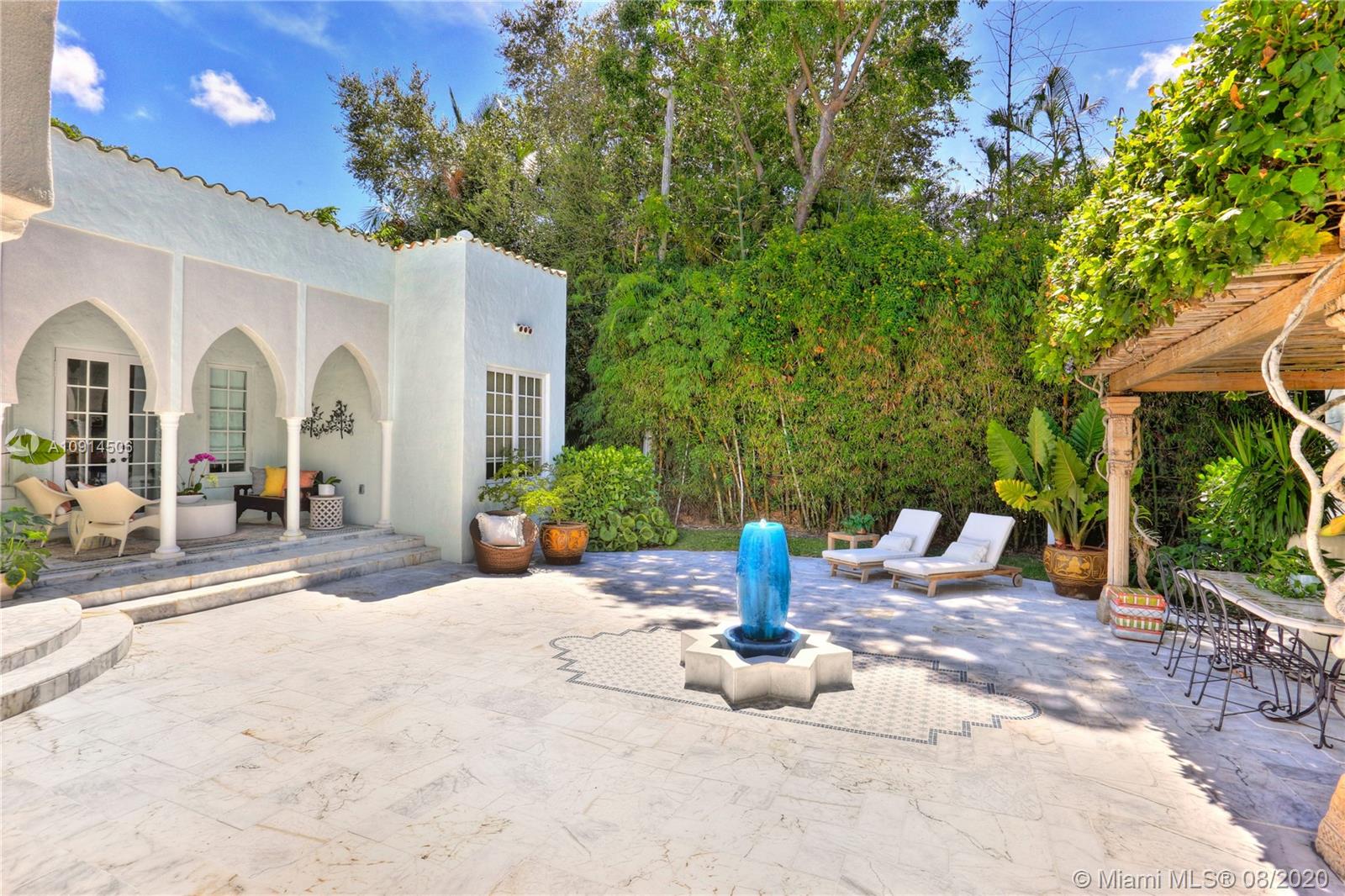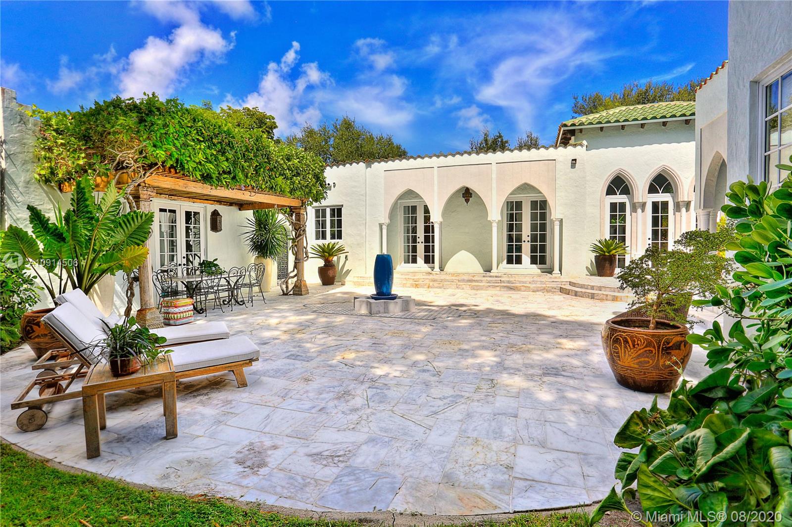 Distinctly unique residence with numerous upgrades, superior details, designer finishes and high ceilings. An oasis in Coral Gables. Upon entering the home your eyes are drawn to the 20ft vaulted ceiling in the foyer. The living areas, home library and generous bedrooms with custom closets are filled with natural light filtered through the floor to ceilings impact windows and French doors. Master bedroom with seating area, custom walk-in closet and large master bath with steam shower. Private terrace off of the master has marble pavers and is a sanctuary for meditating, relaxing or greeting the day. A separate detached guest suite or home office is adjacent to the back terrace. At the end of a long day enjoy alfresco dining and entertaining under the beautiful pergola in the backyard.