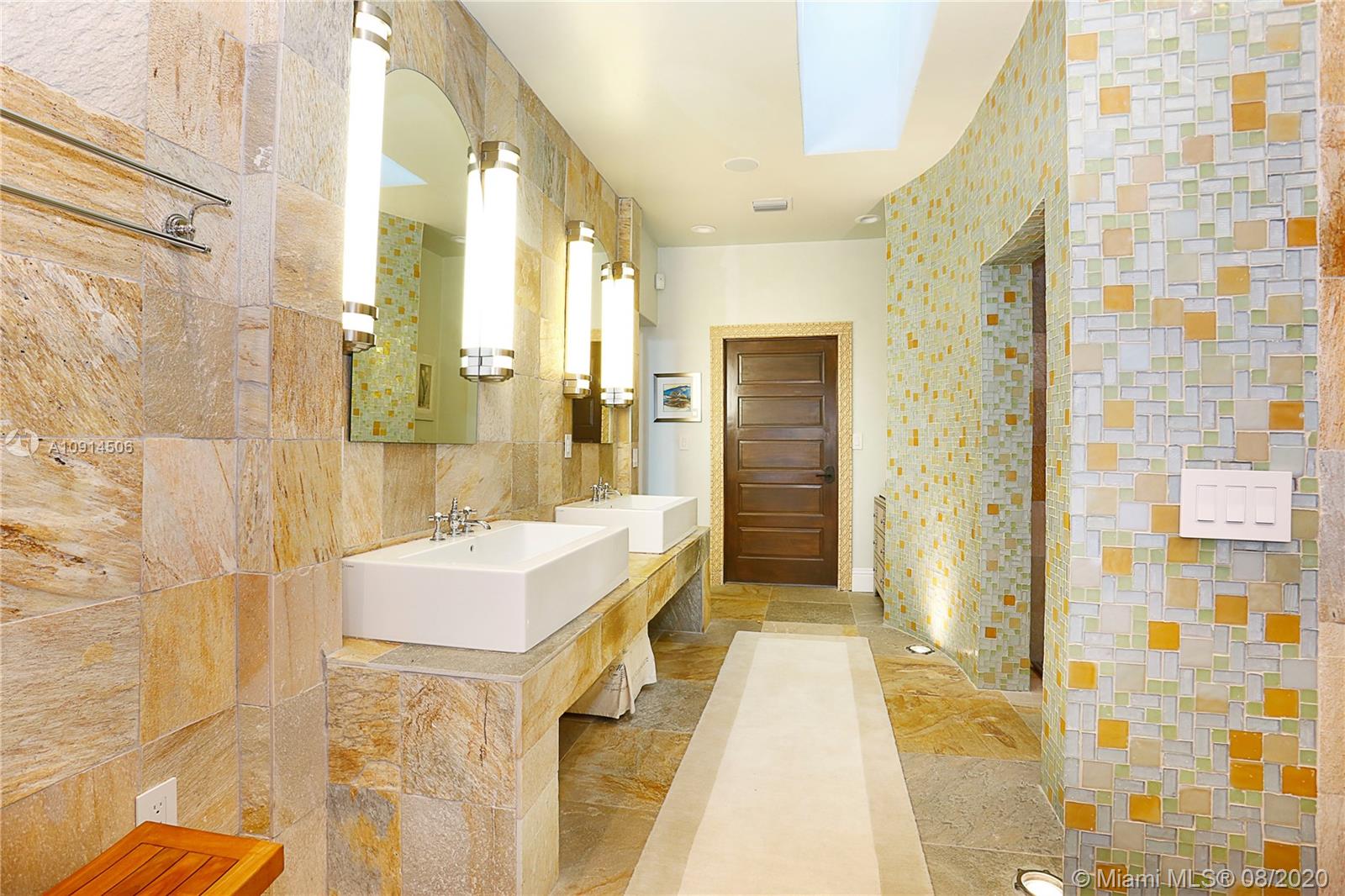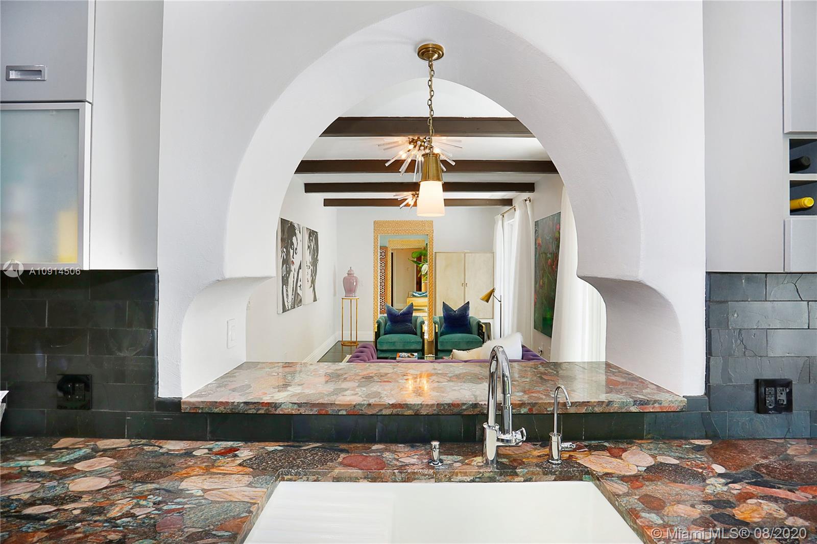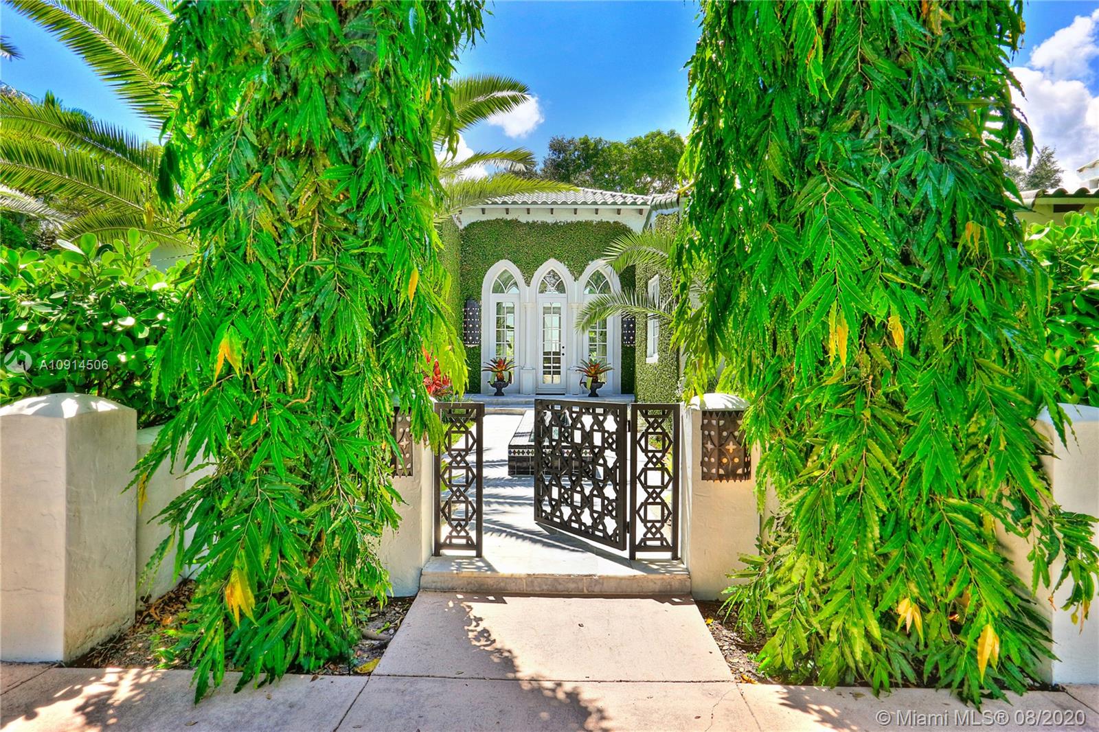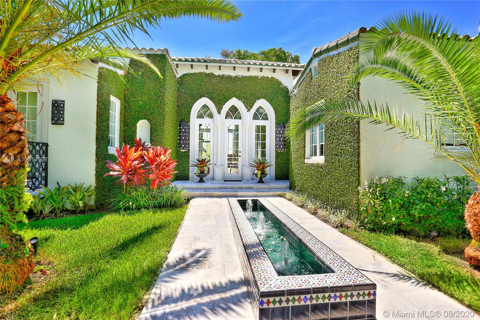 Distinctly unique residence with numerous upgrades, superior details, designer finishes and high ceilings. An oasis in Coral Gables. Upon entering the home your eyes are drawn to the 20ft vaulted ceiling in the foyer. The living areas, home library and generous bedrooms with custom closets are filled with natural light filtered through the floor to ceilings impact windows and French doors. Master bedroom with seating area, custom walk-in closet and large master bath with steam shower. Private terrace off of the master has marble pavers and is a sanctuary for meditating, relaxing or greeting the day. A separate detached guest suite or home office is adjacent to the back terrace. At the end of a long day enjoy alfresco dining and entertaining under the beautiful pergola in the backyard.