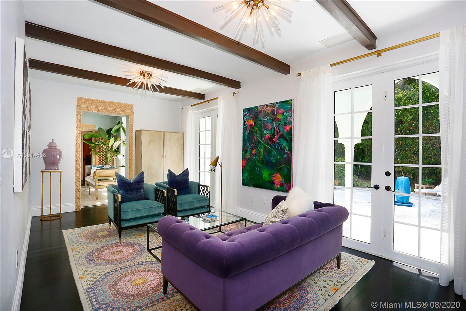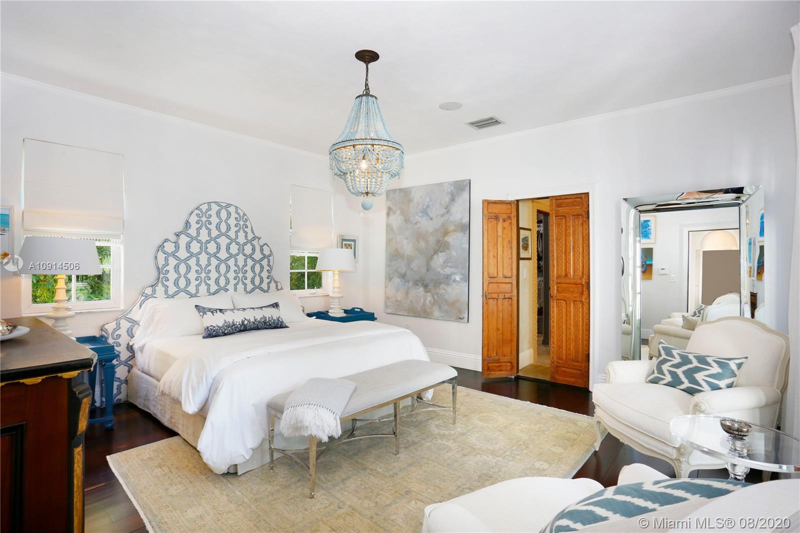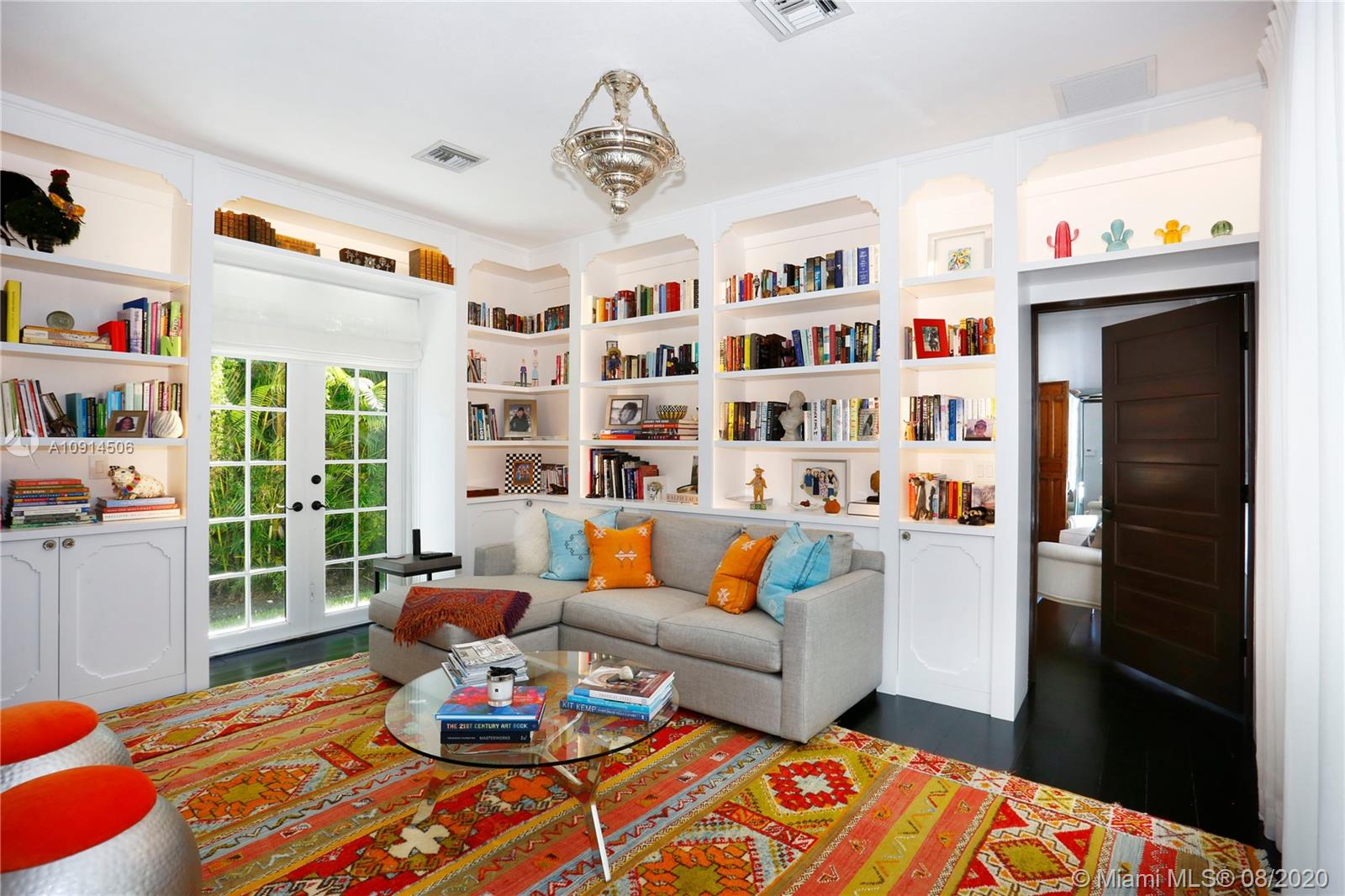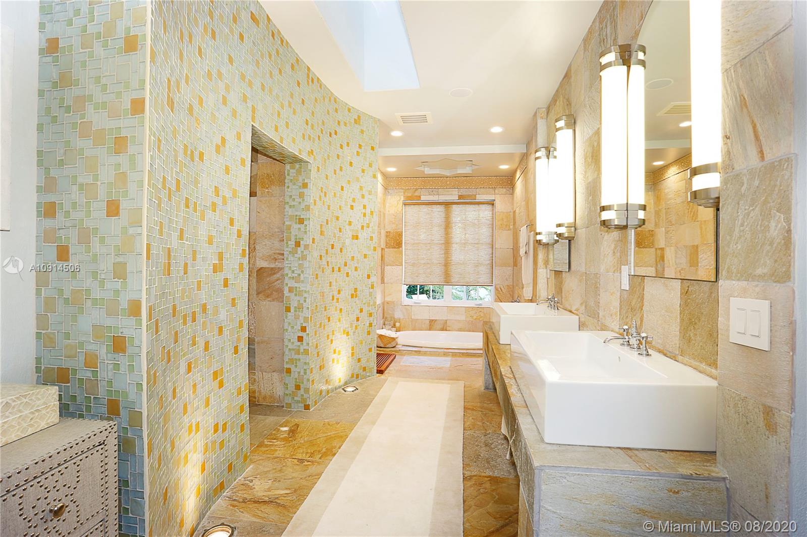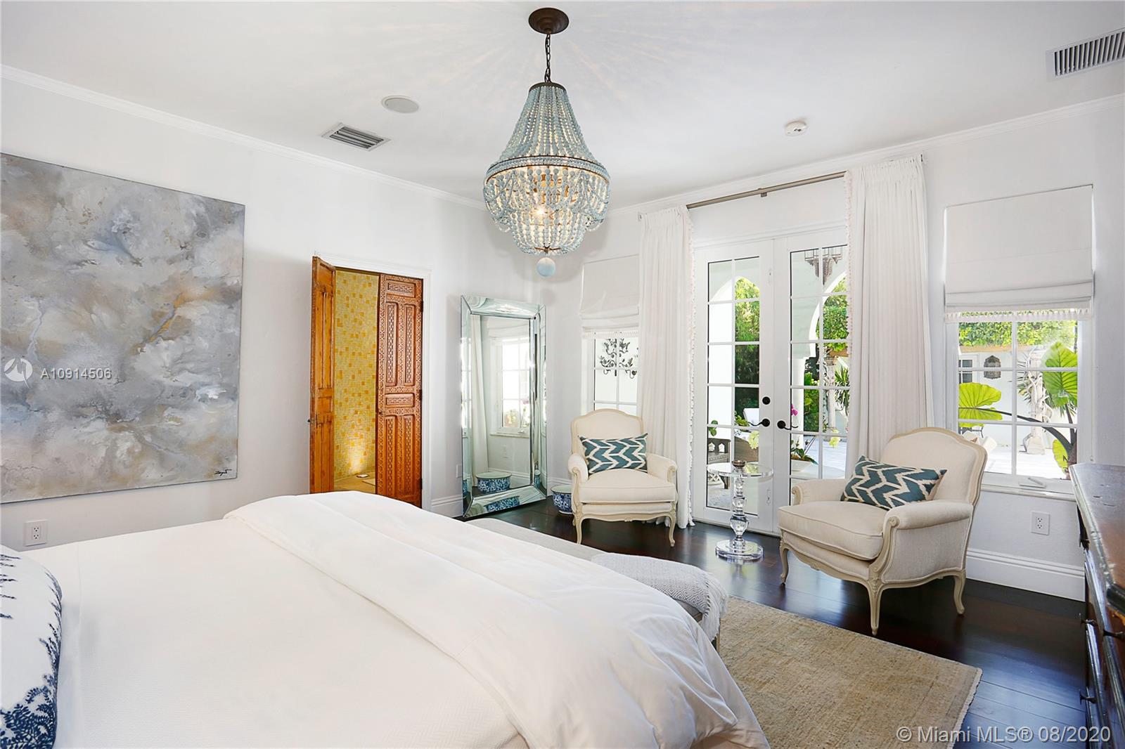Distinctly unique residence with numerous upgrades, superior details, designer finishes and high ceilings. An oasis in Coral Gables. Upon entering the home your eyes are drawn to the 20ft vaulted ceiling in the foyer. The living areas, home library and generous bedrooms with custom closets are filled with natural light filtered through the floor to ceilings impact windows and French doors. Master bedroom with seating area, custom walk-in closet and large master bath with steam shower. Private terrace off of the master has marble pavers and is a sanctuary for meditating, relaxing or greeting the day. A separate detached guest suite or home office is adjacent to the back terrace. At the end of a long day enjoy alfresco dining and entertaining under the beautiful pergola in the backyard.