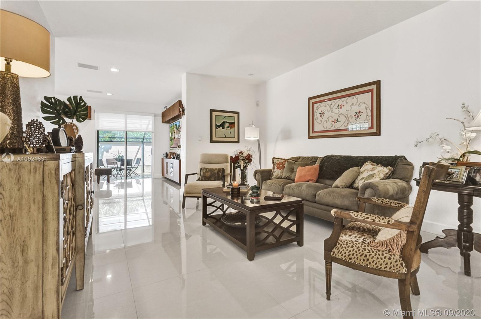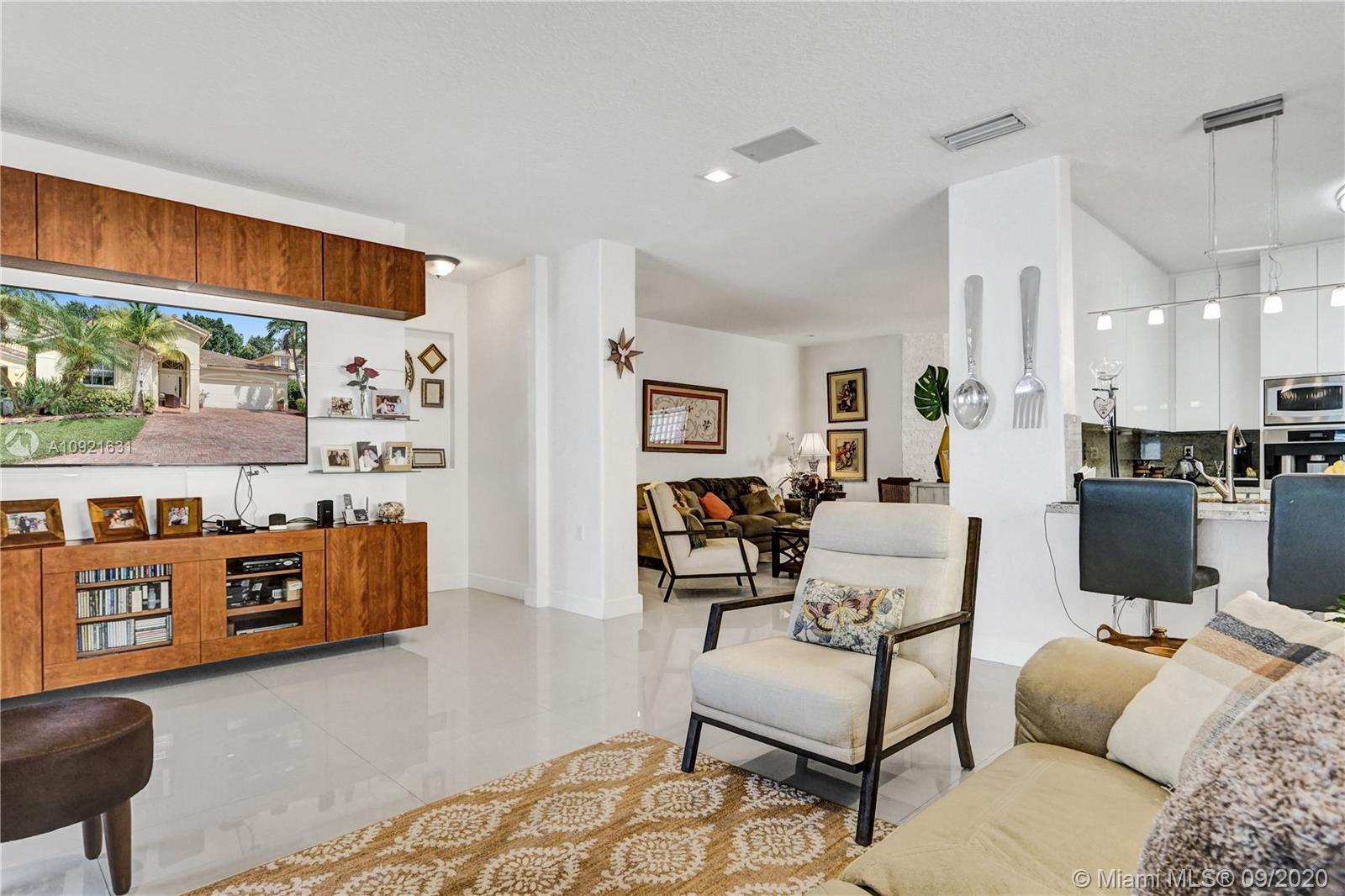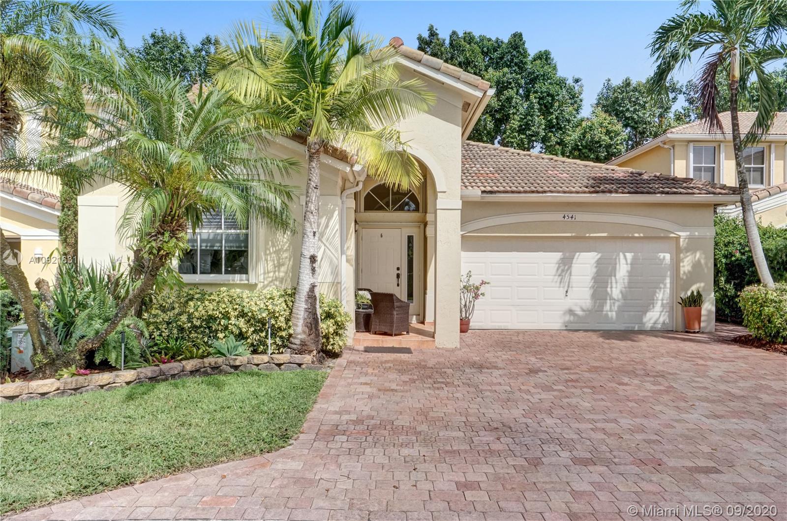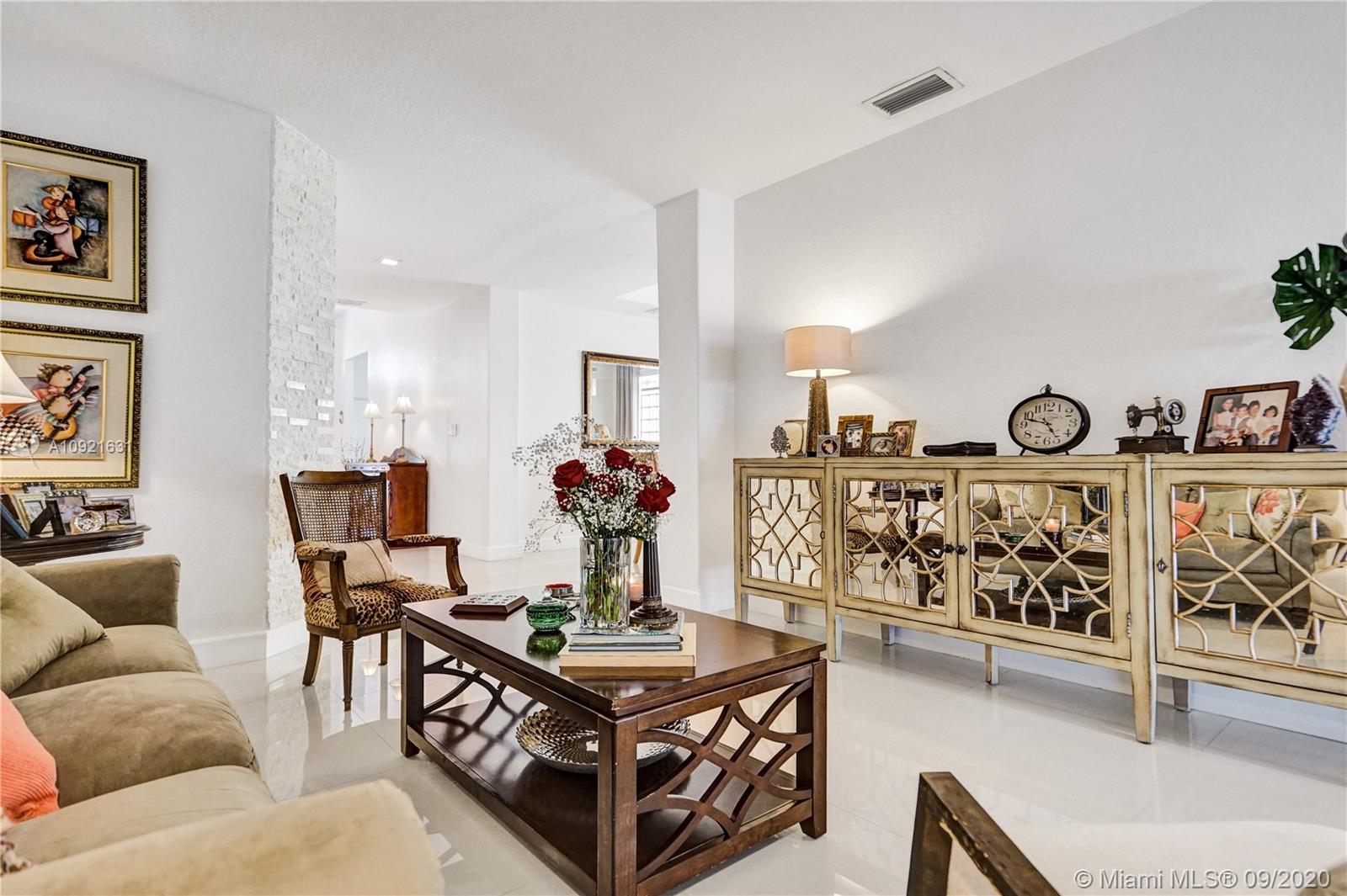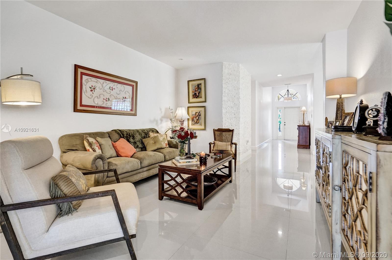 Charming one story home situated in a quiet gated community of Goldvue at Doral. NO NEIGHBOR in the back. Featuring 4 bedrooms 3 baths, 2 car garage + driveway for 2 more cars. Exquisite remodeled home with upgraded kitchen with stainless steel appliances, cover screen terrace. Low maintenance fee includes 24 hours security, common areas, basic cable, alarm monitoring, community pool.