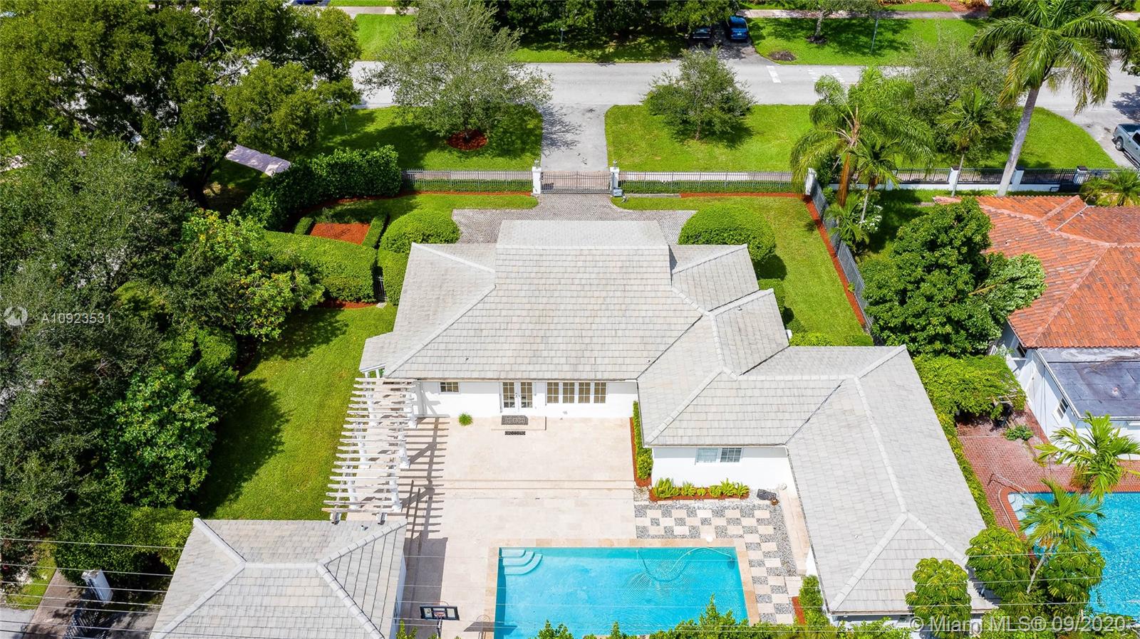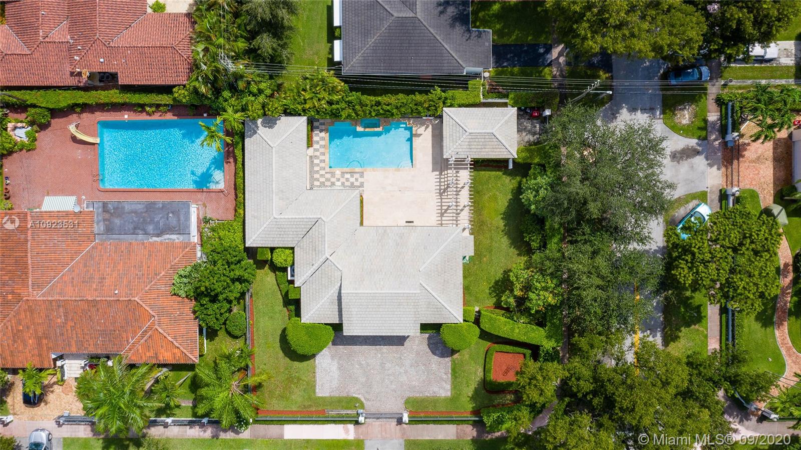 North Coral Gables Gated Executive Colonial Style home on over a quarter acre corner lot with private salt water heated pool & jacuzzi. Over 4,000 sqft pool terrace travertine, lush landscaping. New central a/c 2019, flat tile roof 2006, new pool 2006, all windows and french doors are impact glass. High ceilings, decorative fireplace, plantation shutters. Polished terrazo floors plus Brazilian cherry wood floors all bedrooms. Laundry room, large kitchen with stainless steel appliances. Huge master suite with walk in closets, large master bath can be remodeled how you like. New electrical square-d panel. Zone"X" Not a flood zone. Close to everything. Move-in condition!