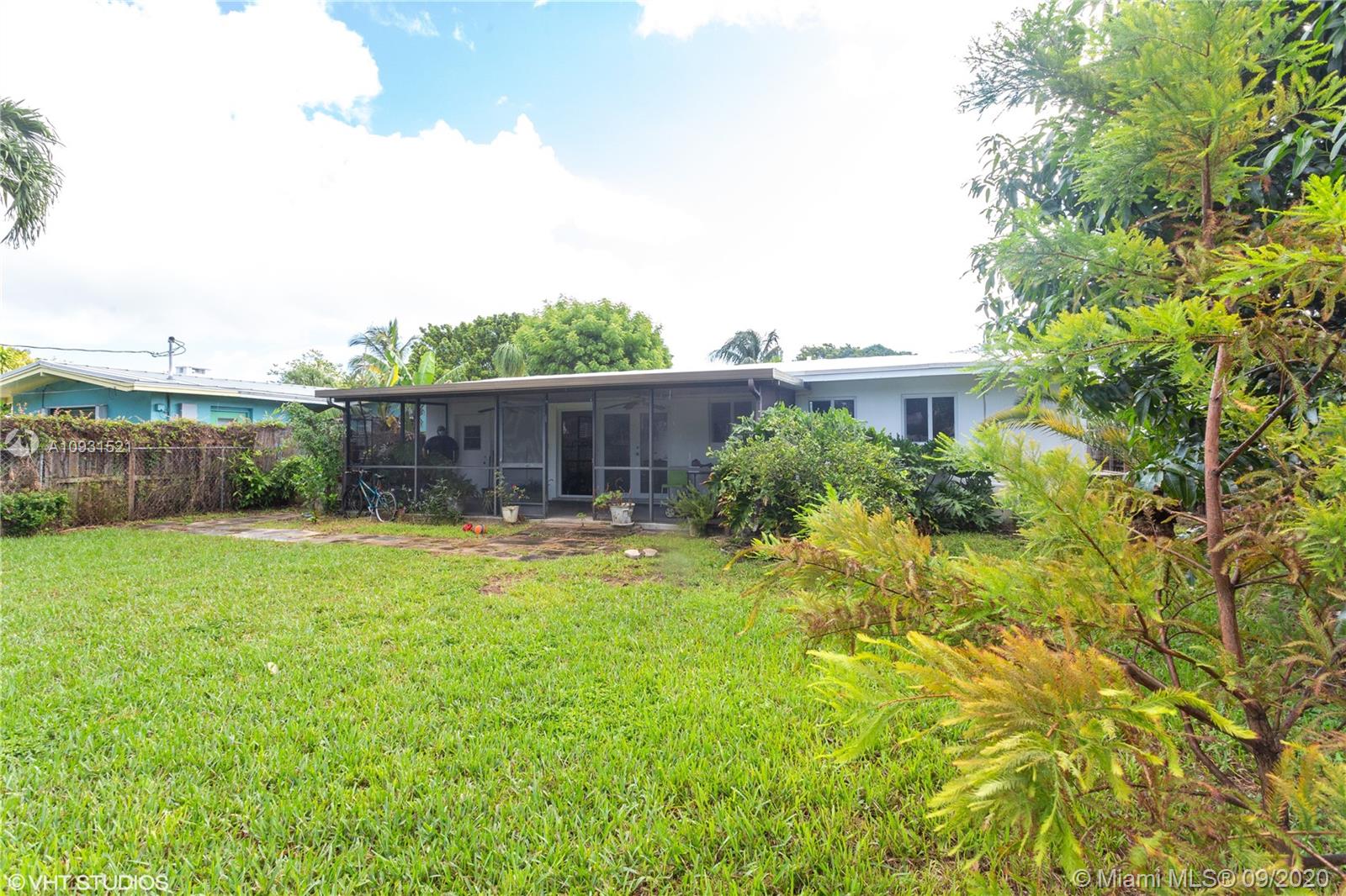 New to market, this remodeled Mid-Century Modern features high ceilings with exposed beams, 12"x24" honed Carrara marble flooring, renovated kitchen and bath & recently installed impact windows & doors. The plantation style shutters allow natural light to fill the home. A partition was added to the second bedroom allowing for a master walk-in closet, & an office with its own entrance. Partition can easily be removed to return office/closet to 2nd bedroom. Impact rated french doors lead to a large screened patio overlooking the large fenced lot, with access to the laundry room located at the rear of the carport. Located in Middle River Terrace you're walking distance to Wilton Dr., Downtown Ft. Lauderdale, shopping & the beach. Home is in good condition with potential for expansion.