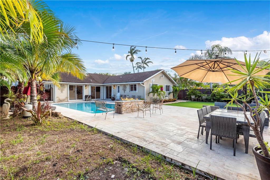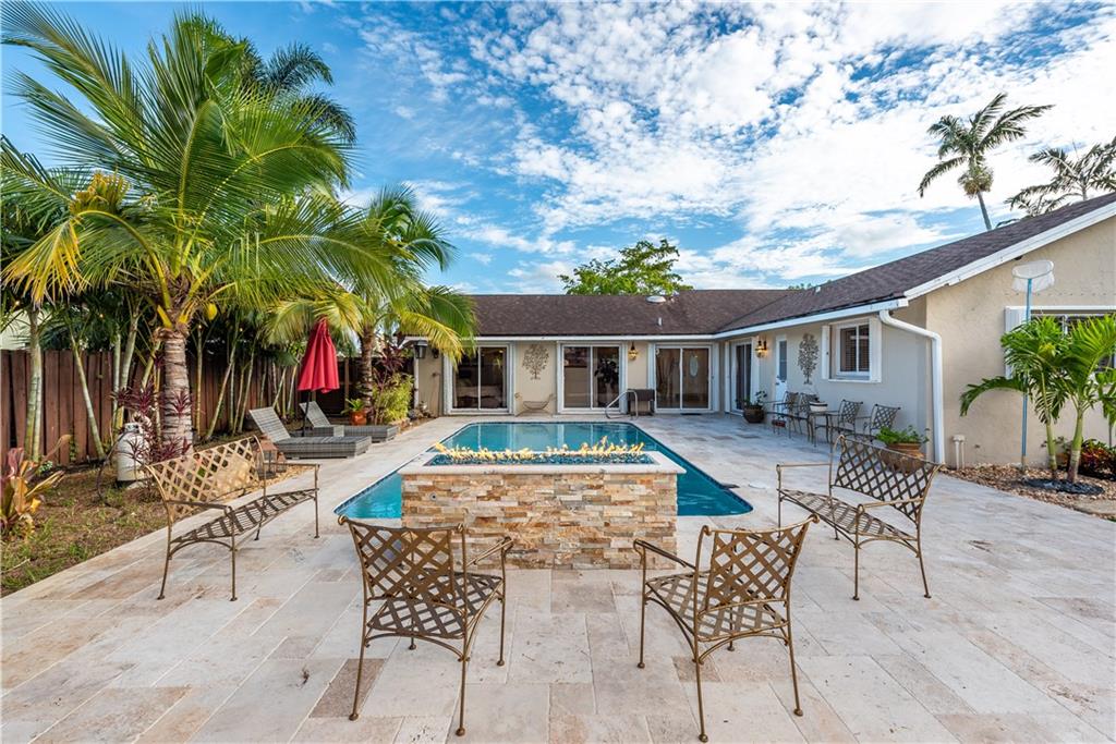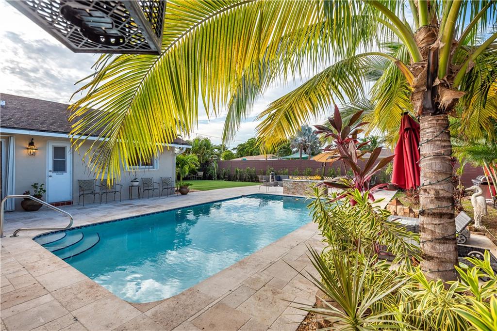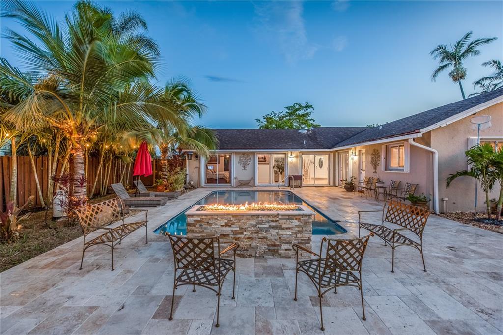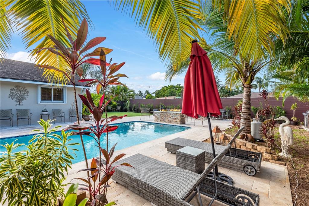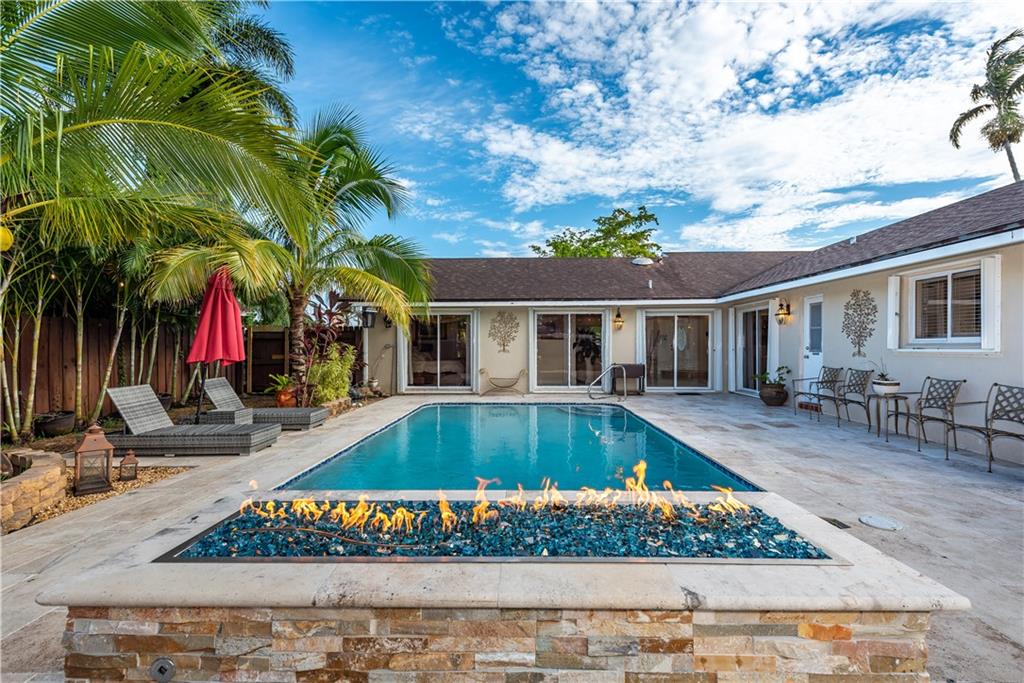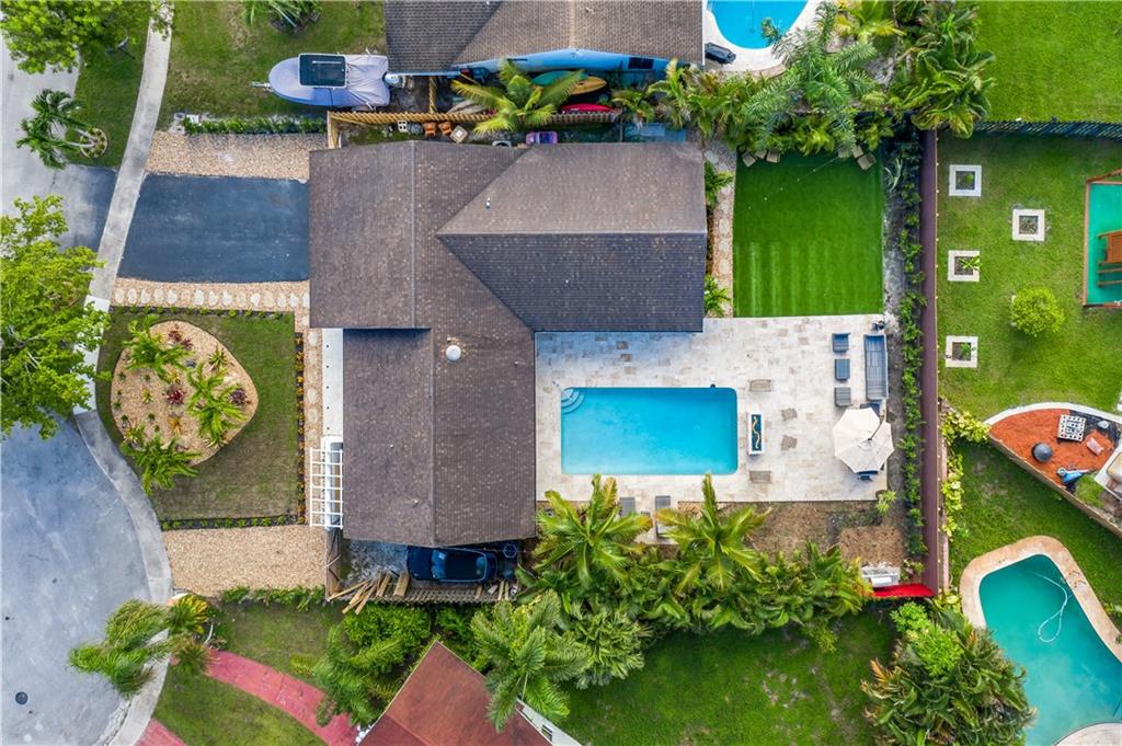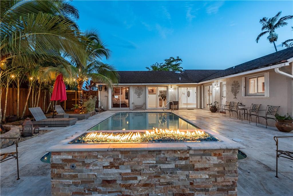 Floor Plan: 3/2 Open concept with slip floor plan for max privacy Flooring: Large porcelain tile throughout living area and Italian cherry wood in bedrooms Kitchen: The custom gourmet kitchen boast designer quality Italian wood cabinets with soft close feature, granite counter tops and state of the art stainless steel appliances Baths: Exotic floor to ceiling tiles in all bathrooms amazing craftsmanship Master bed His and hers walking closets Outdoors: True Oasis perfect for entertaining boosts lush landscaping and lighting throughout, lighted pool, extra-large patio, custom fireplace Cooling: Energy efficient AC 2 years old, thankless water heater. Parking: 2 driveways; huge space able to house an RV or Boat Security: Accordion shutters, motion lighting, camera & alarm system