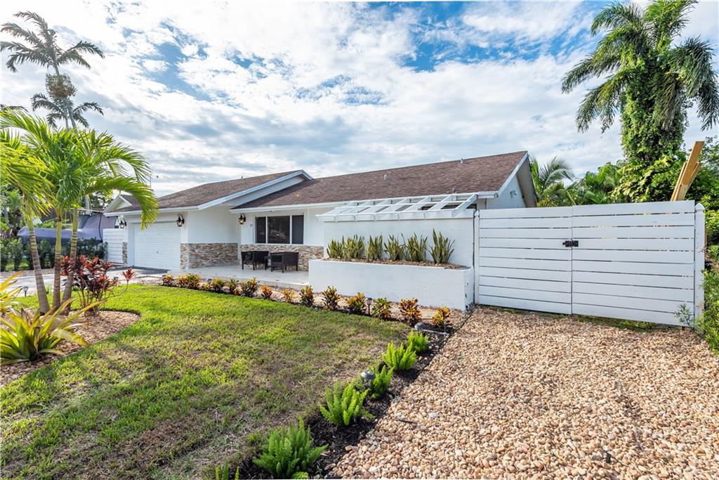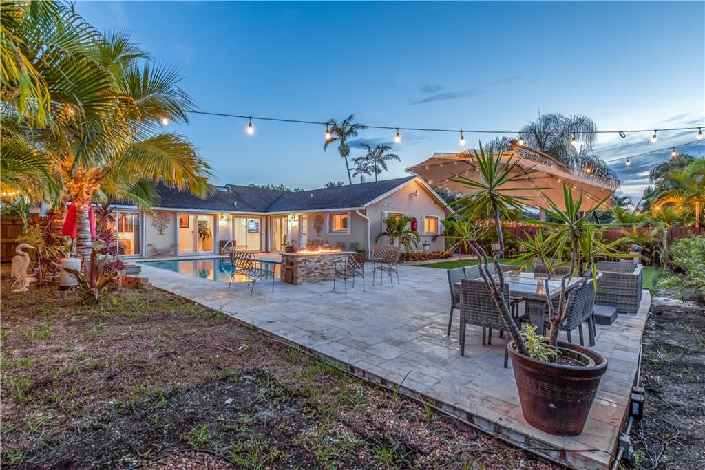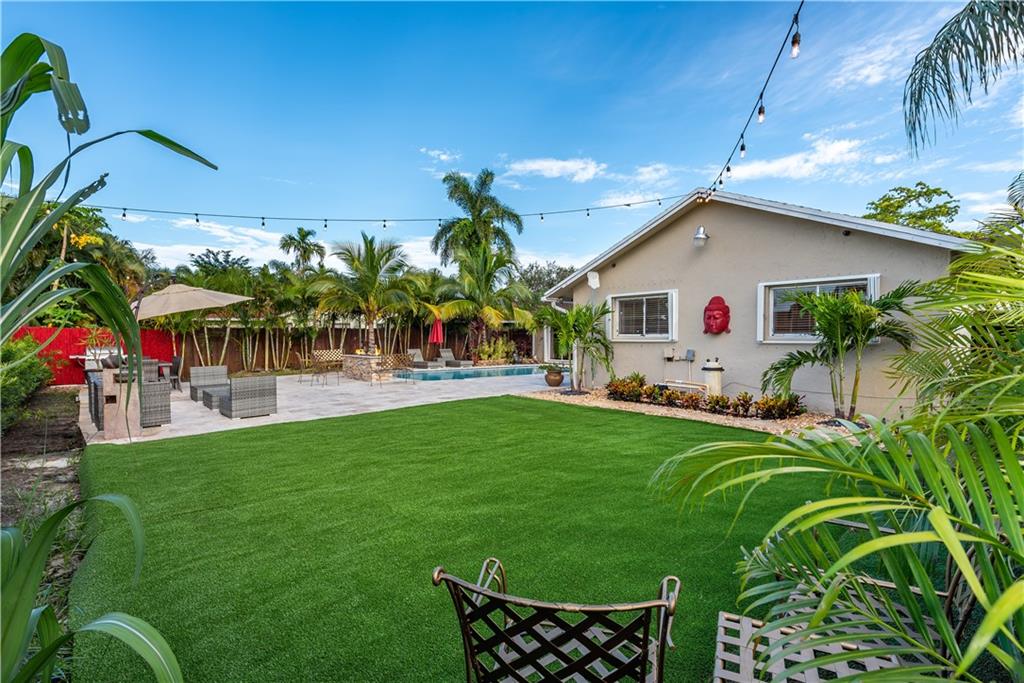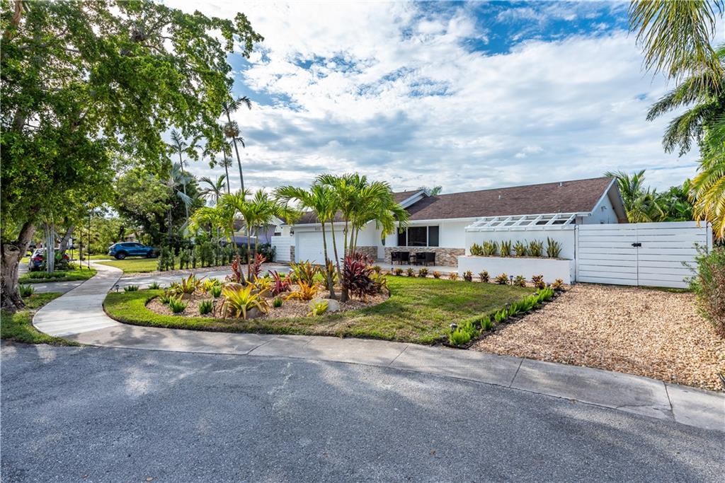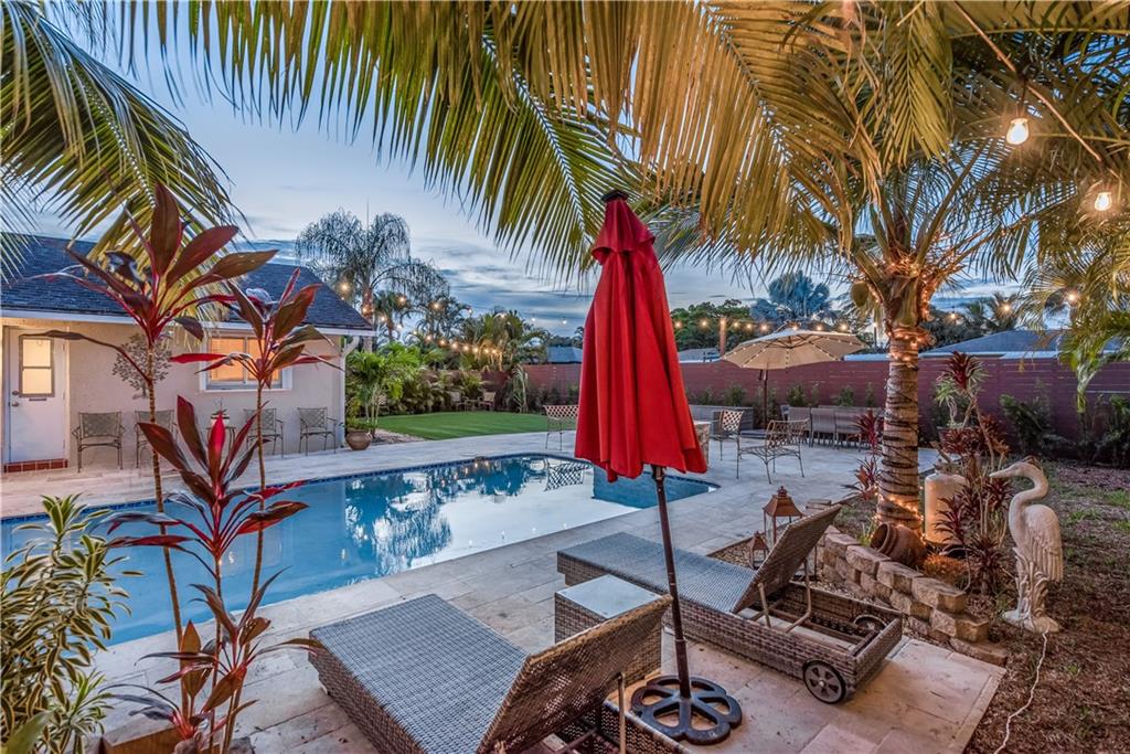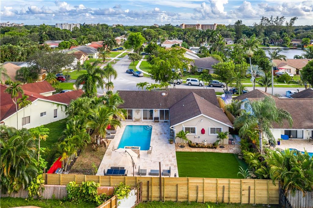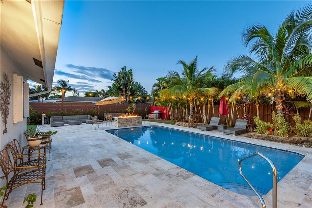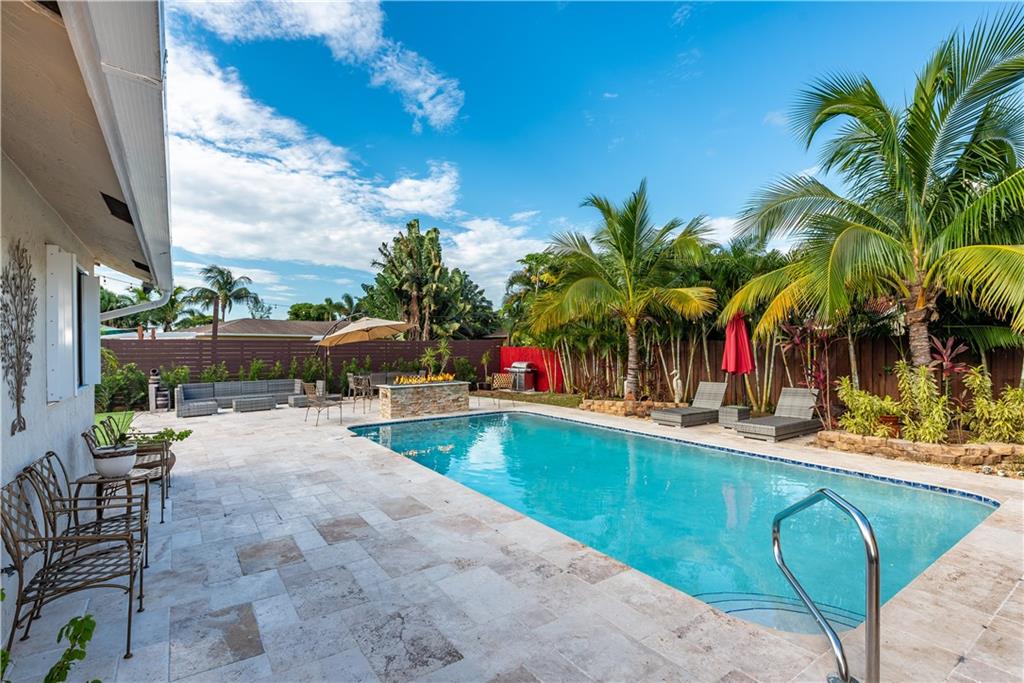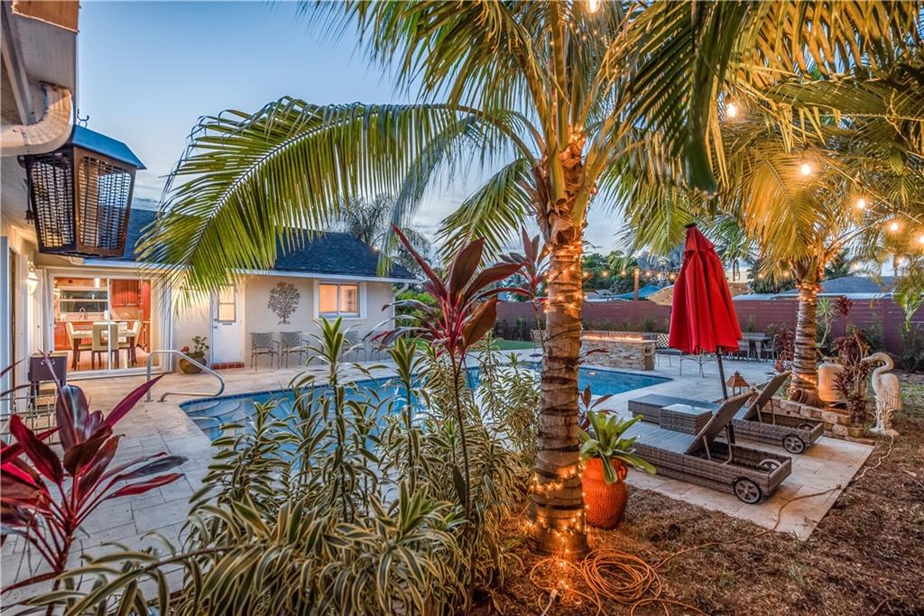 Floor Plan: 3/2 Open concept with slip floor plan for max privacy Flooring: Large porcelain tile throughout living area and Italian cherry wood in bedrooms Kitchen: The custom gourmet kitchen boast designer quality Italian wood cabinets with soft close feature, granite counter tops and state of the art stainless steel appliances Baths: Exotic floor to ceiling tiles in all bathrooms amazing craftsmanship Master bed His and hers walking closets Outdoors: True Oasis perfect for entertaining boosts lush landscaping and lighting throughout, lighted pool, extra-large patio, custom fireplace Cooling: Energy efficient AC 2 years old, thankless water heater. Parking: 2 driveways; huge space able to house an RV or Boat Security: Accordion shutters, motion lighting, camera & alarm system