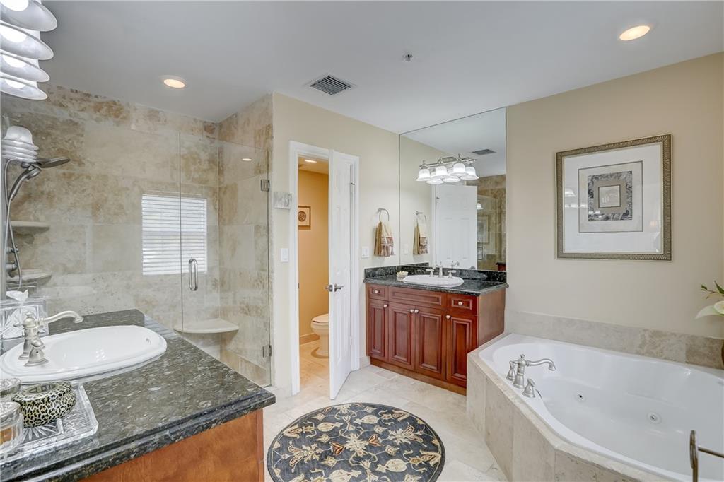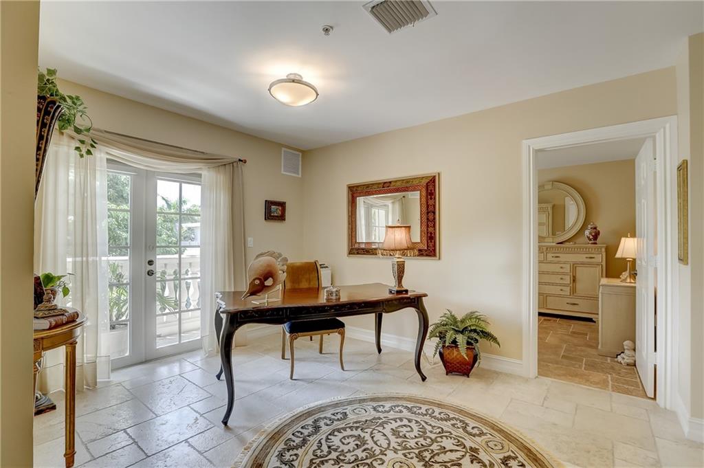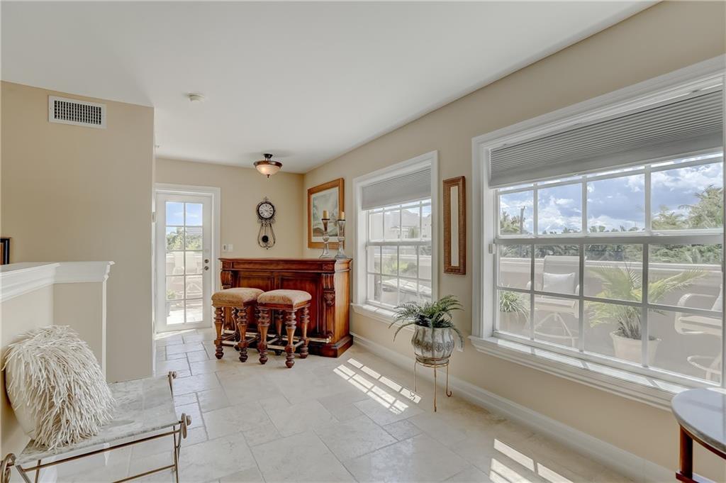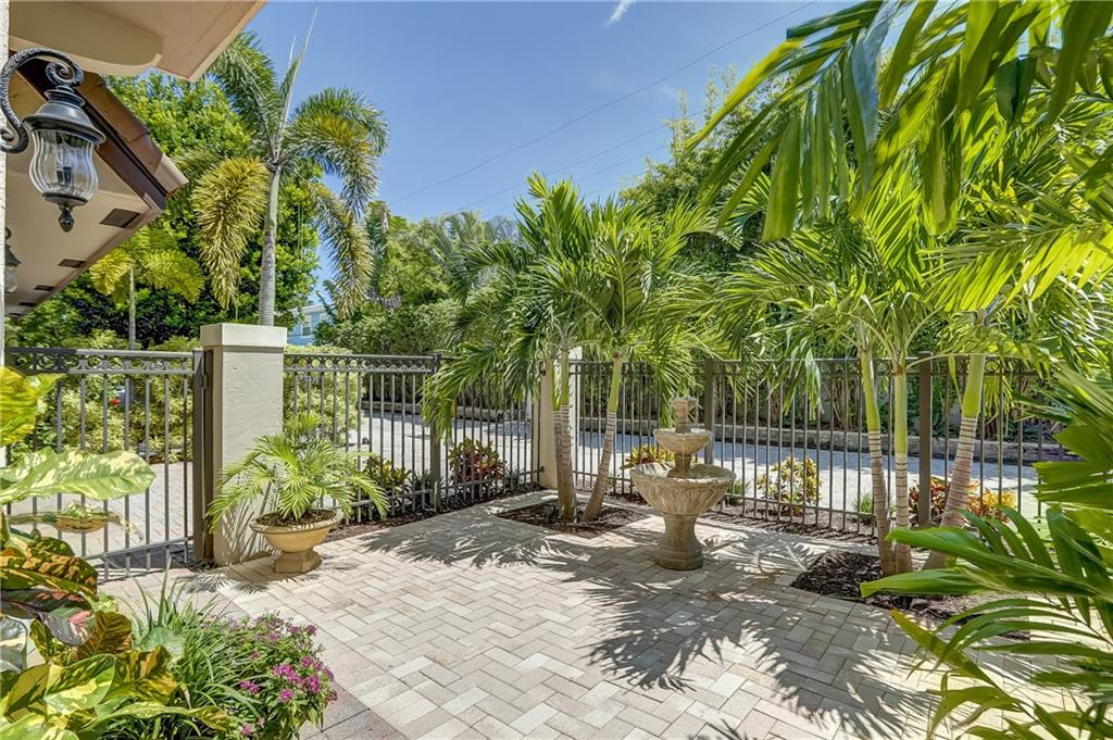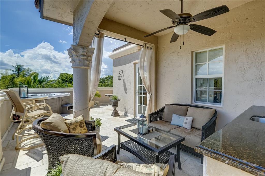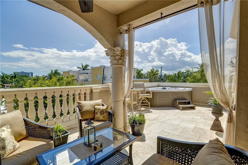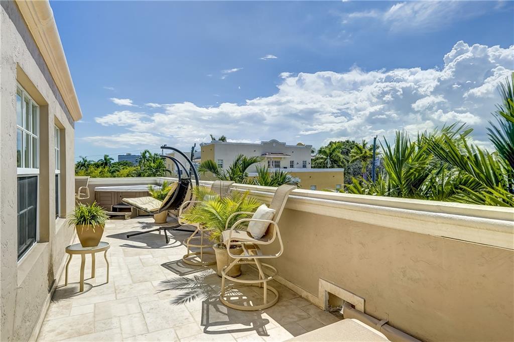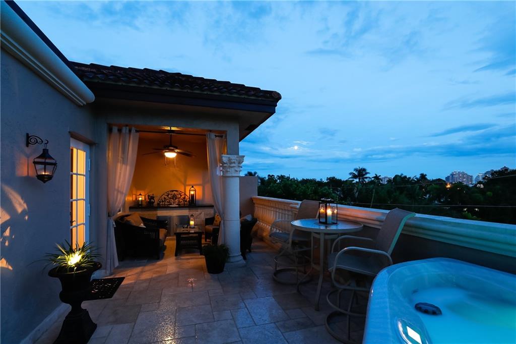 Pristine Coral Ridge tri-level townhome with 2-car garage and impact doors and windows offers three levels of French cut marble flooring throughout and curved marble staircase. Ground living area includes kitchen with high end finishes, wet bar, main living area and half bath. Level two opens on a loft with Juliet balcony that's positioned between the master with two walk-in closets and the second bedroom with enormous walk-in closet, 2nd full bath and conveniently located laundry. Third level features large family room or optional 3rd bedroom and full bath that leads to marble-floored rooftop terrace, sunset views, wet bar and hydrotherapy spa. New washer/dryer, new microwave, new Trane A/C, plantation shutters, crown molding, gated courtyard with fountain, lush landscaping,walk to beach