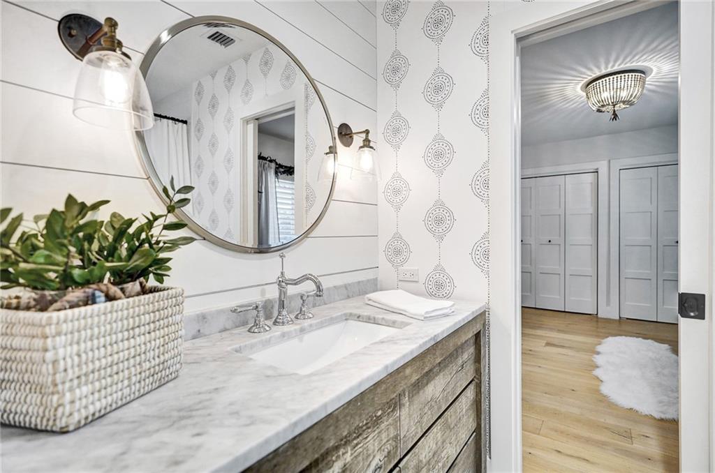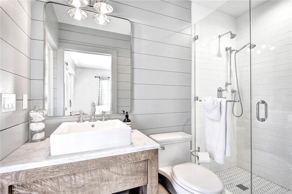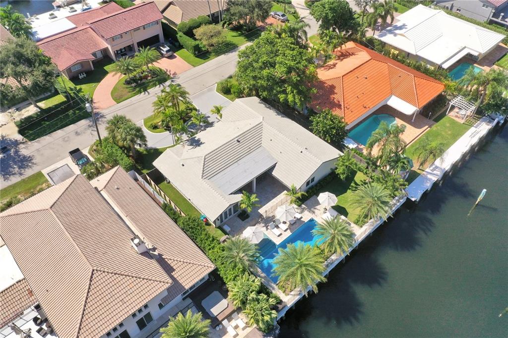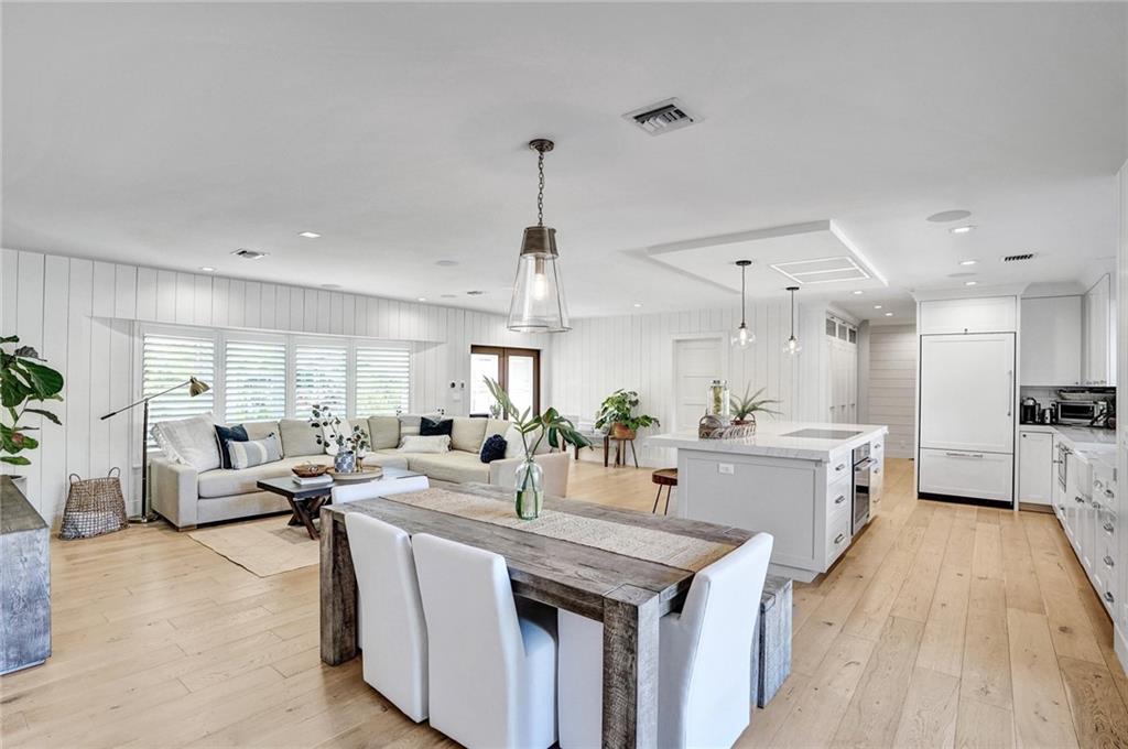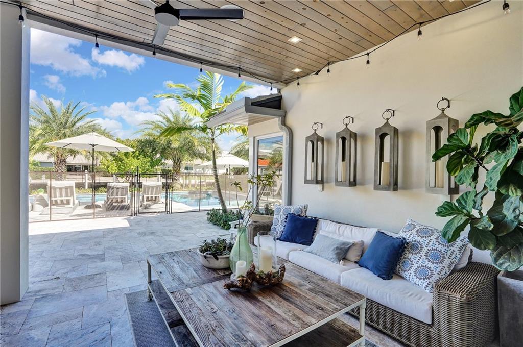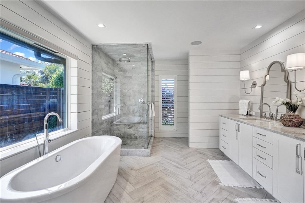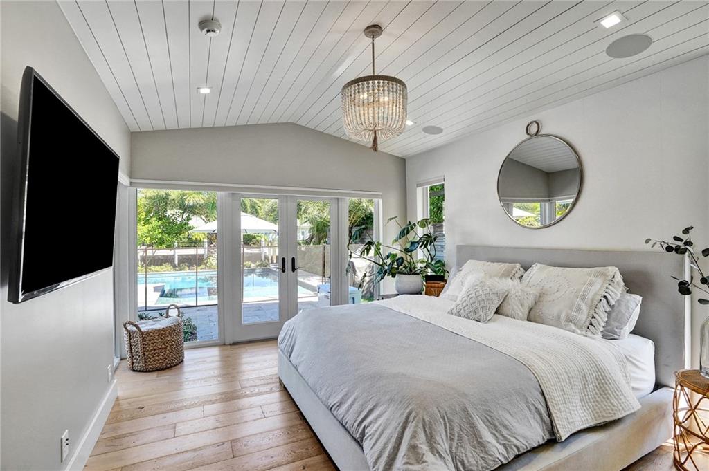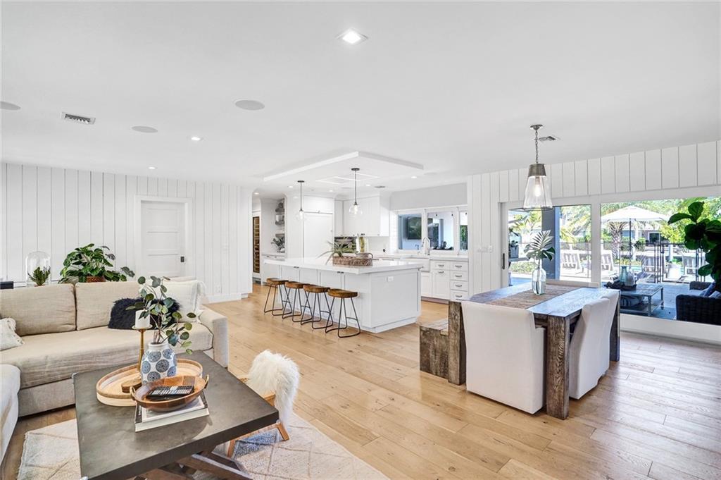 Coastal contemporary with exquisite attention to detail at every turn. COMPLETELY reconstructed in 2017 including: roof, impact windows/doors, NEW raised seawall, NEWLY built pool, kitchen, flooring, bathrooms and more. Light and bright open floorplan. Gourmet kitchen boasts quartz countertops, white shaker cabinetry and Wolf induction stove. Beautiful French White Oak flooring and Shiplap walls throughout. Master suite features custom closets, motorized blackout shades and spa like bath with steam shower and tub. Spacious secondary bedrooms. Backyard oasis with covered space for entertaining, pool, grass area and 85’ waterfront.
