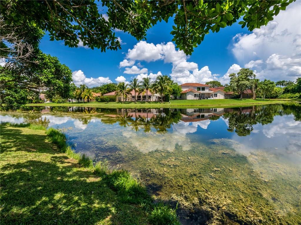 Great Weston location in a gated community. Nicely maintained 2 story lakefront home with a fantastic view. Roof and AC replaced in 2016, outside just painted and front lawn and sprinkler maintained by community. Volume ceilings, natural wood kitchen cabinets with granite counter tops and stainless appliances. Community pool plus zoned in a good school district. Note: One bedroom downstairs now used as an office.