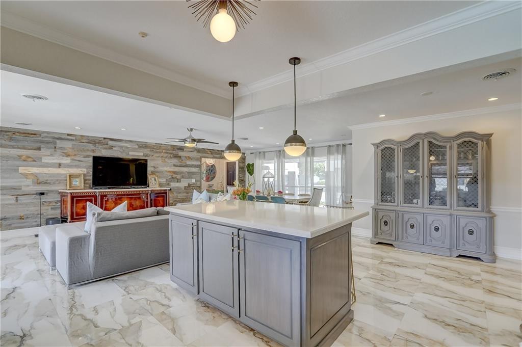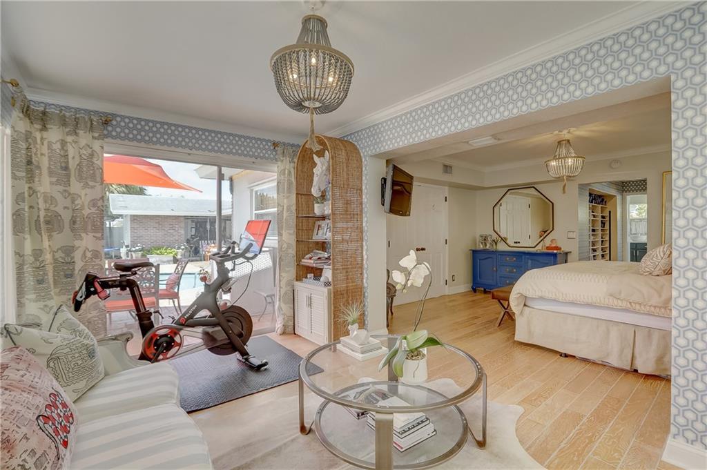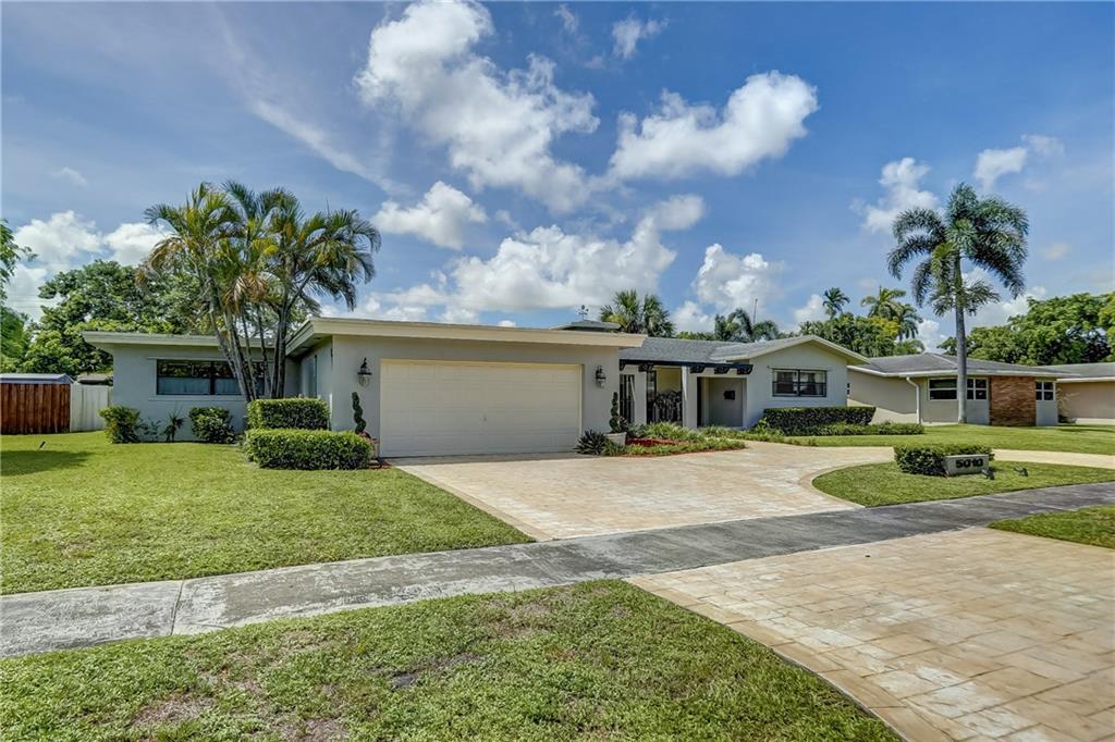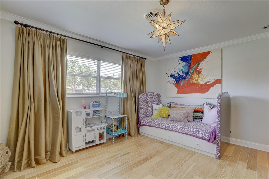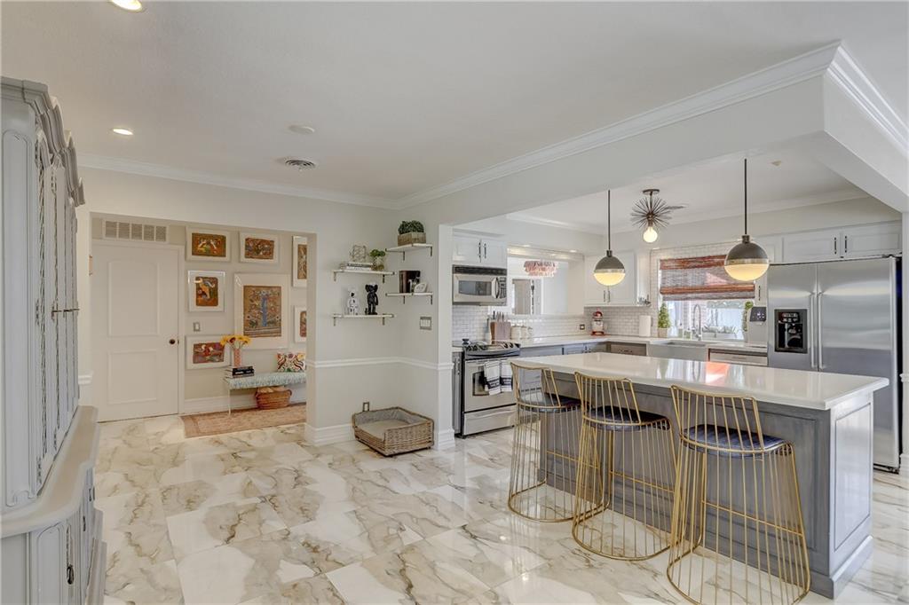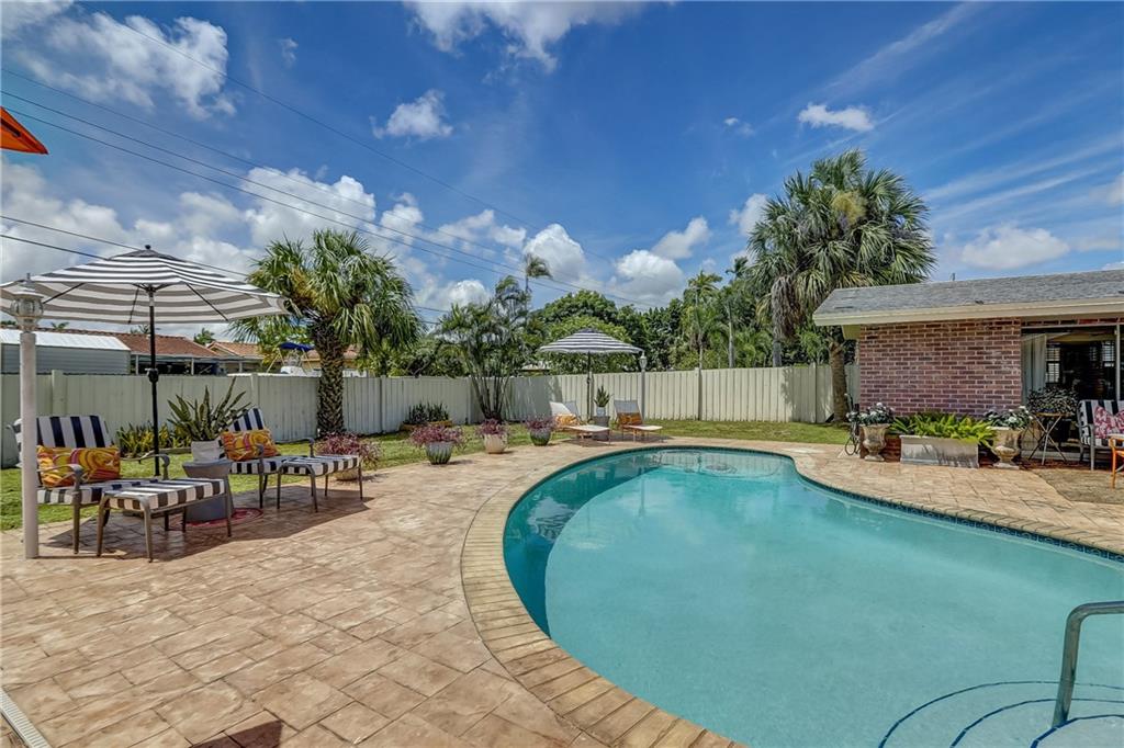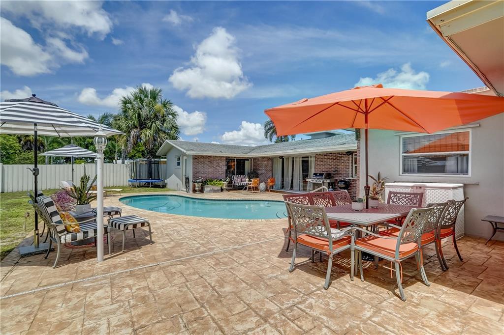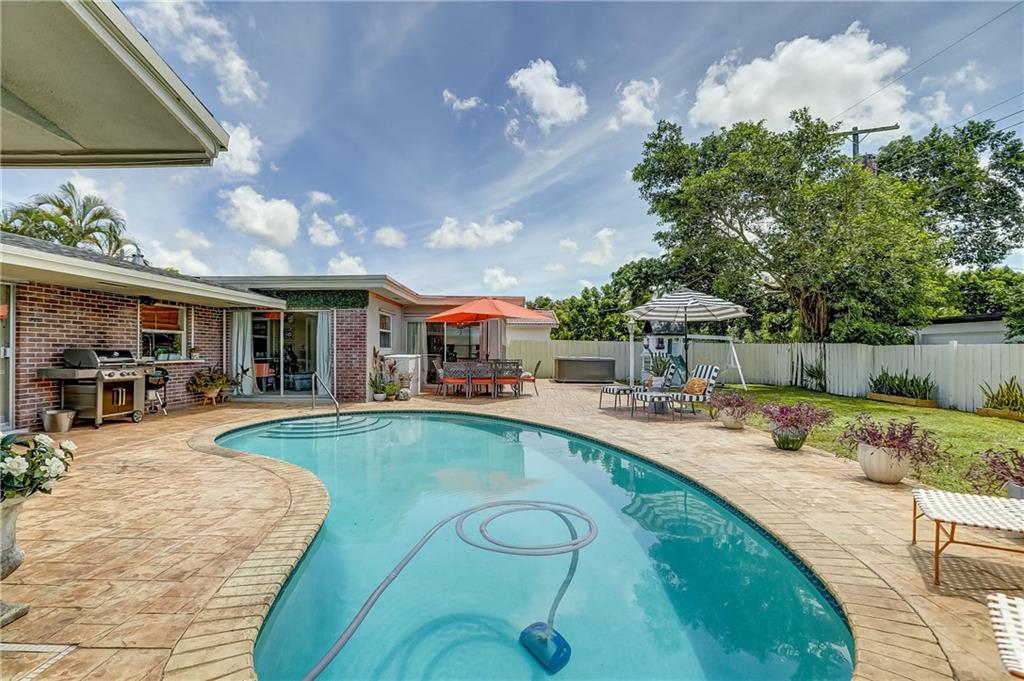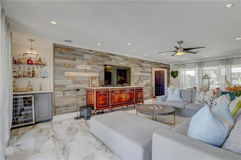 Nestled on a quiet street in the sought-after Hollywood Hills neighborhood, this split floor design offers a 2 car garage, 4 bedrooms and 4 full baths. Wood floors and stunning 24 x 24 porcelain tile run throughout the home. A Thibaut wallpapered-foyer welcomes instant views of the contemporary, open floor plan. A common living space is multi-functional and perfect for entertaining: outfitted with an over sized wood accent wall, a built-in wet bar with wine fridge, a freestanding island perfect for entertaining, as well as glass sliding pocket doors that open up to beautiful pool views. A updated kitchen is equipped with quartz countertops & subway tile backsplash. DOUBLE MASTER SUITES with sliding glass door's opening to resort style pool complete with Bose speakers. Welcome home!