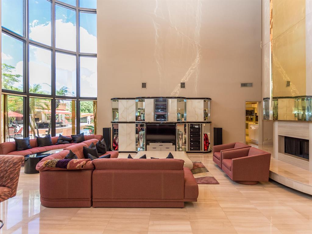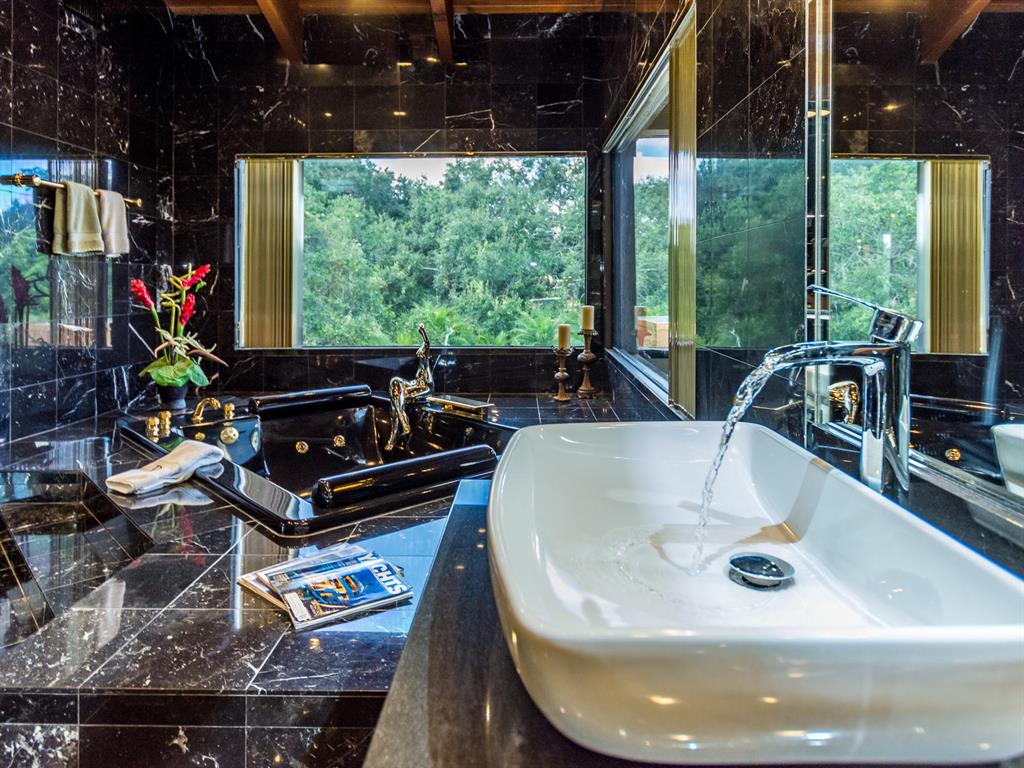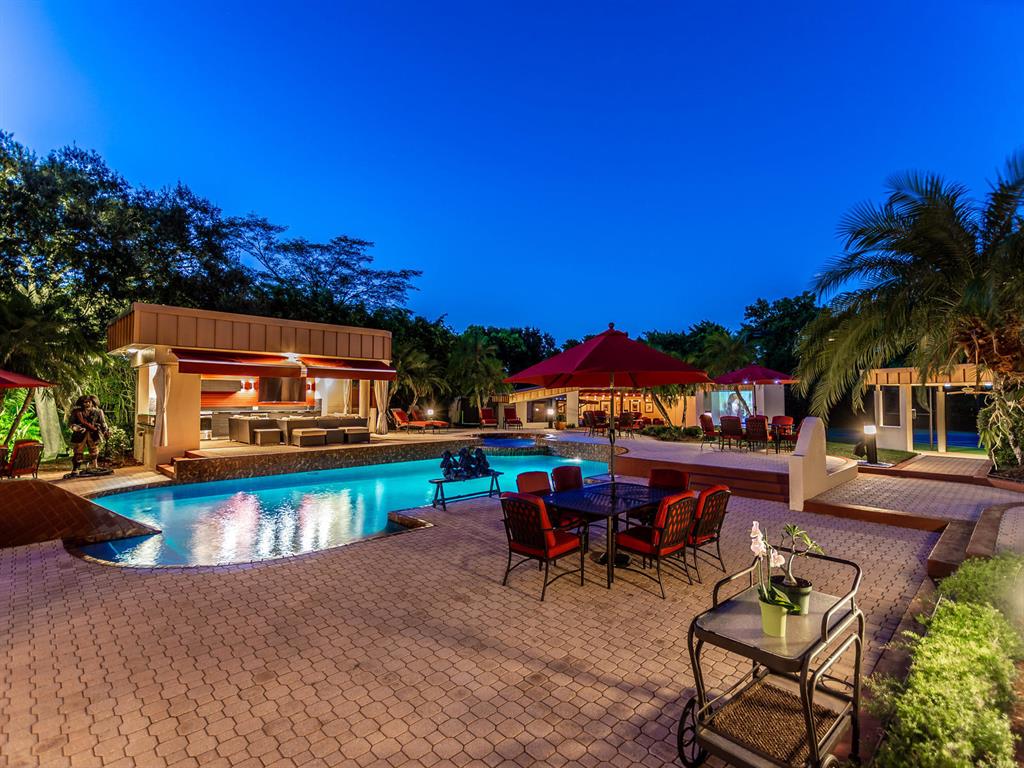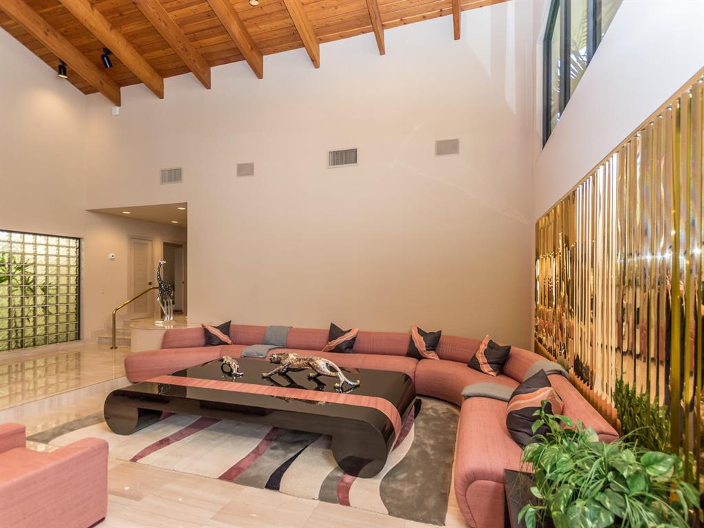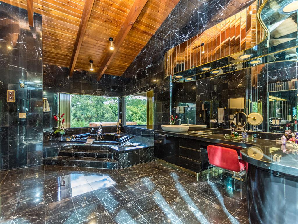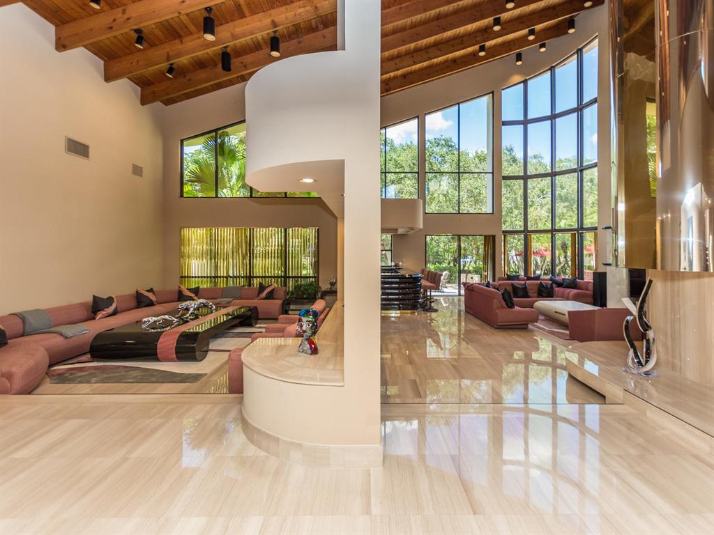This one of a kind Architectural Masterpiece- 5 bedroom/5.5bathroom contemporary and professionally designed home and sits on a 2.5 acre estate with over 400 feet of wall, plus fence with a secured gated entry on a private street. Extra large master suite with 25 ft ceilings, has a large master bath 26'x20' with whirlpool tub and steam room and 2 offices. The 40 ft ceilings in living room and Italian marble floors, custom fireplace which looks like a piece of art soaring to 40'. Gourmet kitchen. Oversized heated pool, outdoor kitchen/bar , 8 person hot tub gazebo, 2 stocked ponds, lighted tennis and basketball court, outdoor bar, 8'x20' outdoor movie theater, architectural garden, fire pit. You feel like you are at a 5-star resort. No HOA, 80 KW Generator.