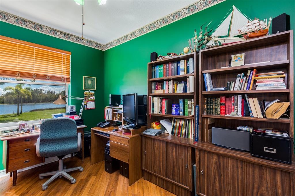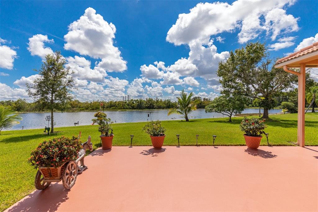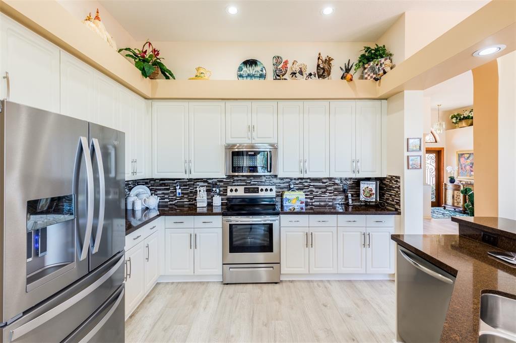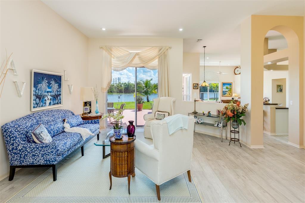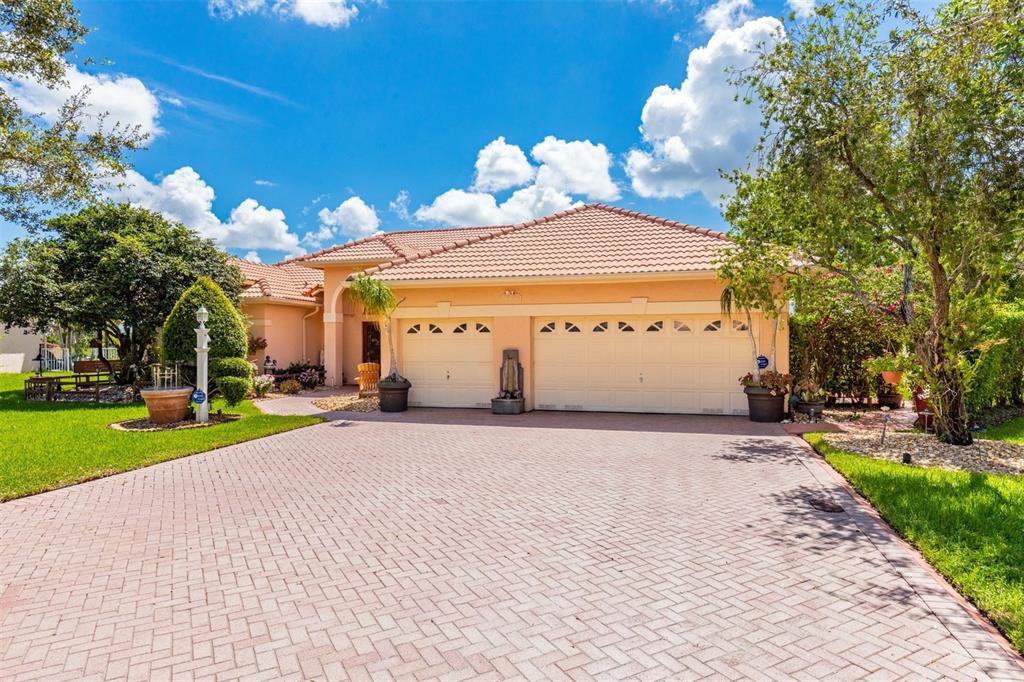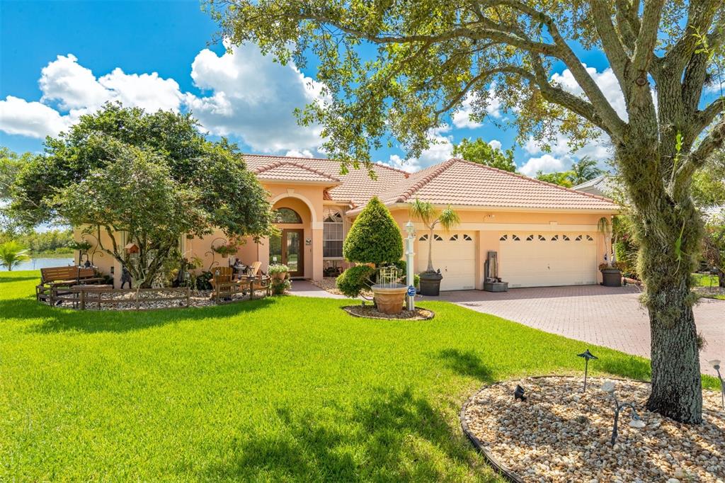 Elegant customized home on oversized 1/3 pie shaped acre lot on waterfront preserve in gated, luxe community of Estates of Stirling Lakes. Open & inviting layout w volume ceilings, wood laminate flooring in the main living areas, formal dining & living opens to huge expanded family room & eat-in kitchen. Kitchen features stainless appliances, granite, extended wood cabinetry & pantry. Huge Master suite & bath w walk-in closets has direct water view. Great triple split bedroom layout. Extras include accordion hurricane shutters, newer AC, impeccably maintained tropically landscaped grounds, fountains, 3 car garage. Small community, all homes on 90ft wide minimum lots, low HOA, close to top rated schools.