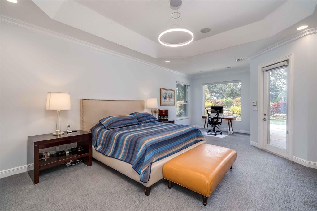 Stunning 5 bedroom, 4 bathroom fully-fenced waterfront home with office and bonus room. The navigable waterway is ideal for boating, jet skiing and kayaking. New roof in 2016, accordion hurricane shutters throughout. Rock waterfall pool with hot tub on an oversized patio surrounded by lush tropical landscaping. Contemporary open floor plan, hardwood floors, surround sound. Kitchen, completely renovated in 2016, with high-end GE Monogram SS appliances, quartz and granite countertops in kitchen, bathrooms, bar area with wine frig. Hunter Douglas window treatments. New patio speakers and TV. Laundry room with Whirlpool washer, dryer. Sprinkler system with water from the lake, new pump. A must see!