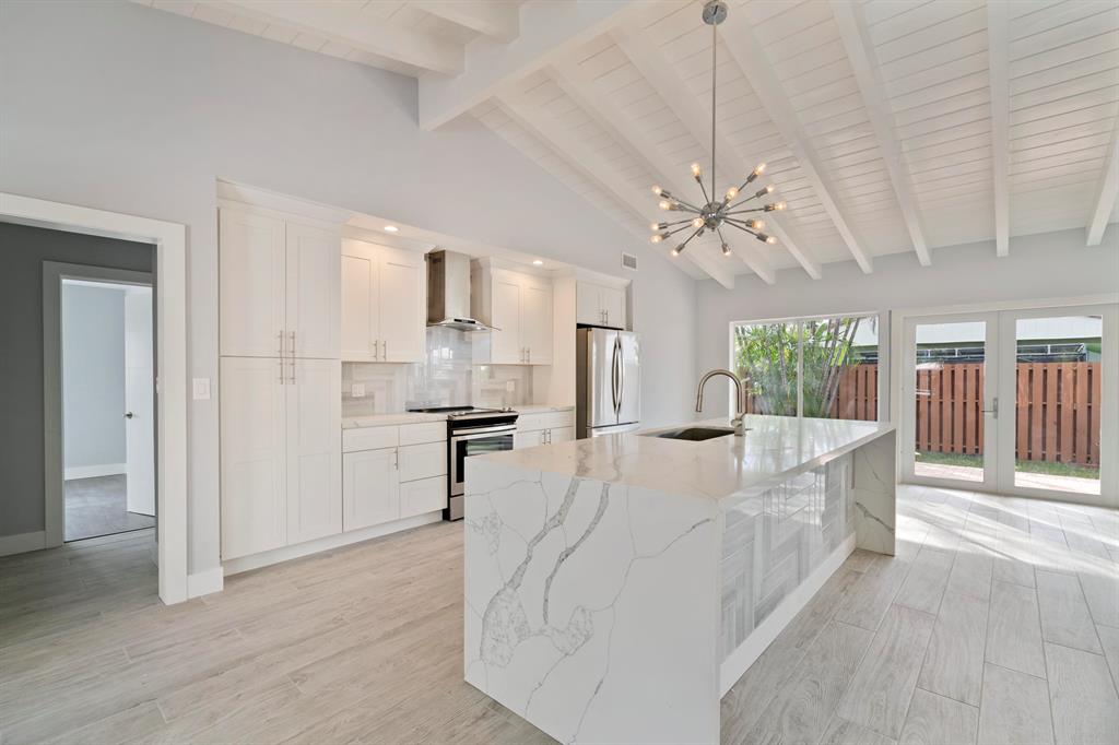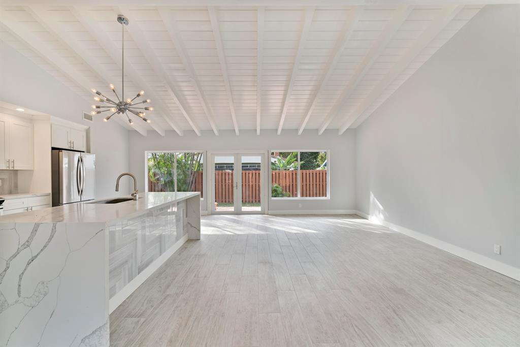 Fabulous courtyard house that has been totally redone from top to bottom. Private fenced in backyard with paver patio, landscaping, pool, and entertaining area. Large open floor plan with new porcelain floors, new solid wood kitchen cabinets, new SS appliances, new quartz counter tops with water falling center island, new range hood. Both bathrooms have been redone with the finest details and high end amenities. Great room with exposed wood beam cathedral ceiling and plenty of dining room and living room area. New hurricane impact windows cover the whole house. Pool was just resurfaced and fresh landscaping was put in. Garage converted into living area for multi purpose use. New paver driveway was just installed last week!!!! Come and see before its gone!!!!!!